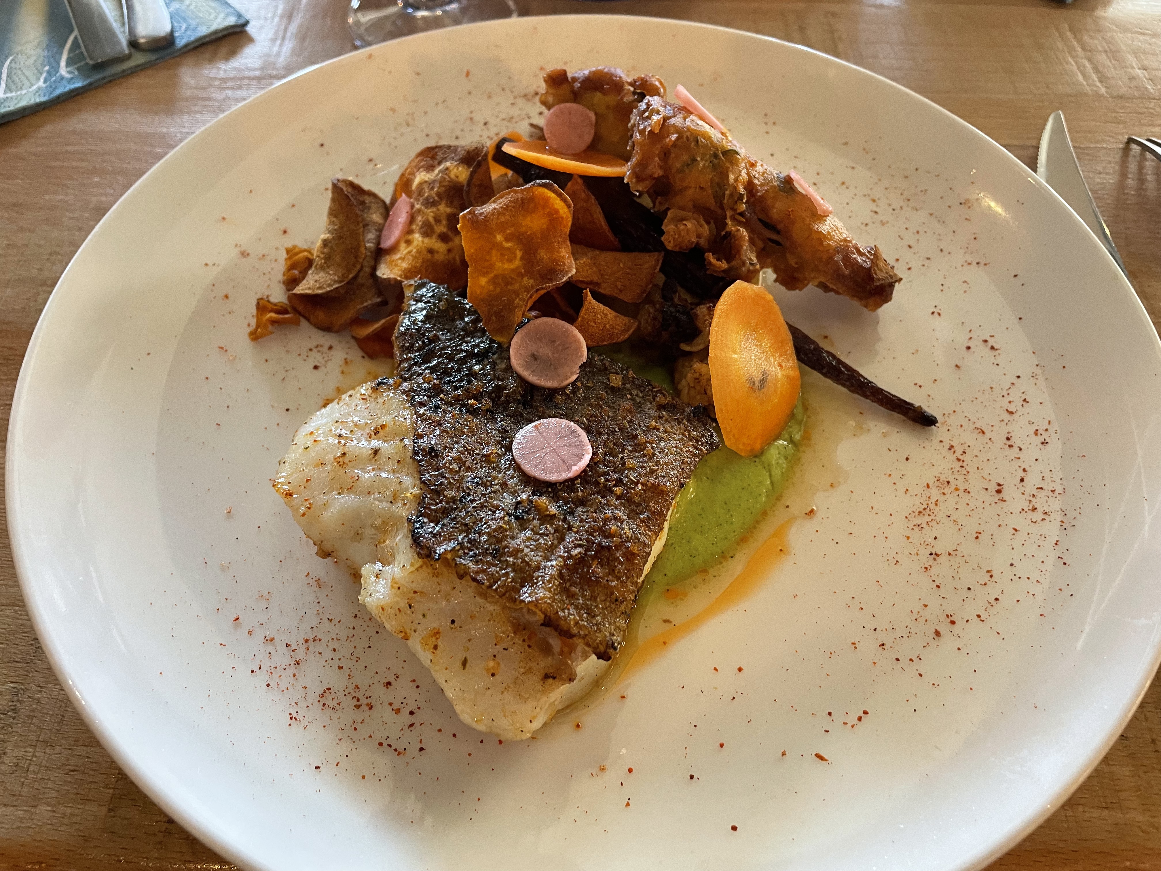 Nous avons très bien mangé à l étage sous le soleil un beau filet de daurade et un bon mille feuille au caramel noix de pecan