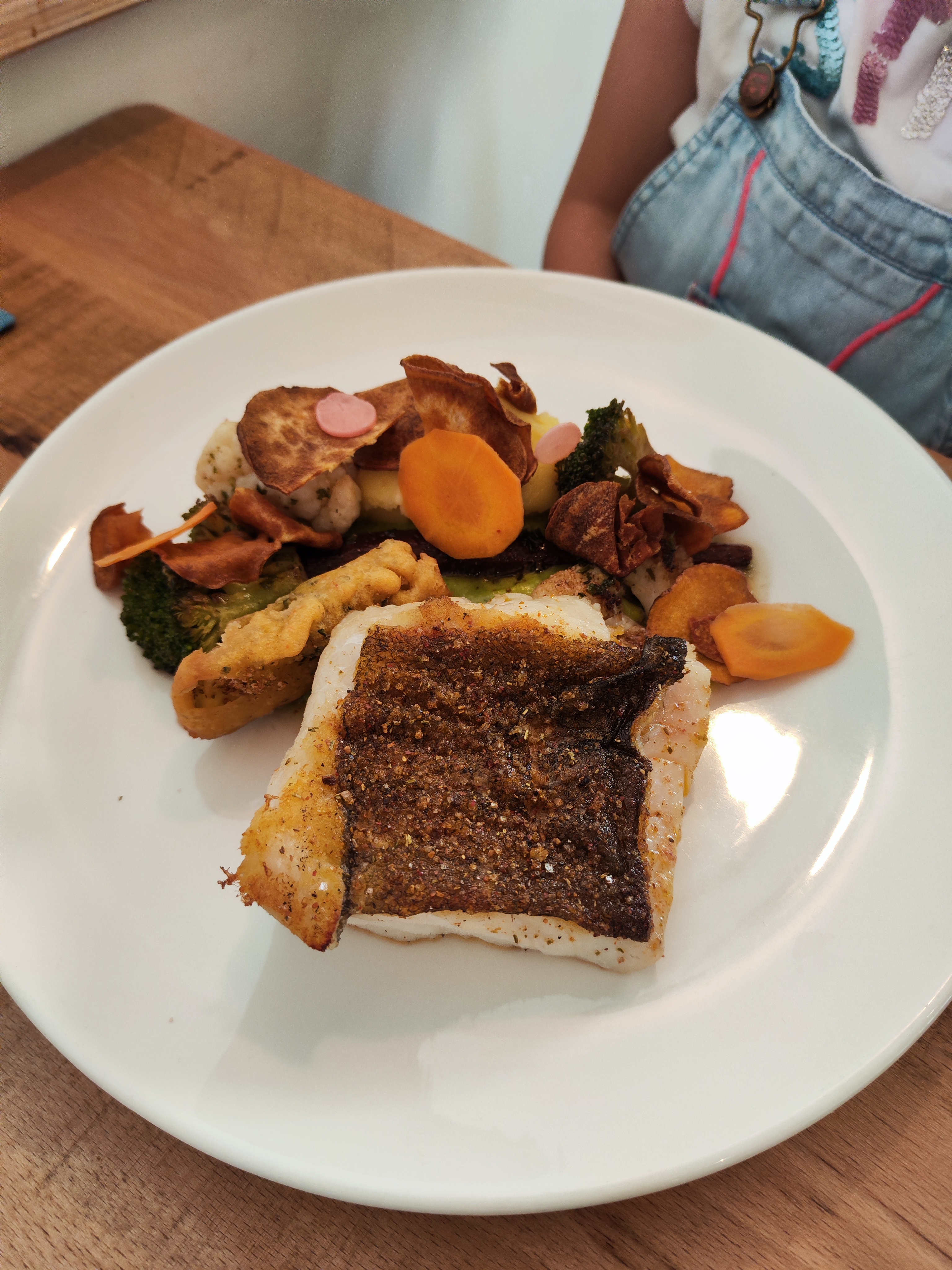 Super sympa ! Il y’a une jolie terrasse pour manger à l’extérieur et même un roof top. Les pièces du boucher (une saignante et une à point) étaient parfaitement cuites et bien tendres ! Le poisson du jour (cabillaud) était parfaitement assaisonné, les légumes étaient croquants et le cabillaud très savoureux. Le plat était raffiné et goûtu. Le cadre est également propice a simplement boire un verre ou prendre une planche à partager (qui ont l’air délicieuses)