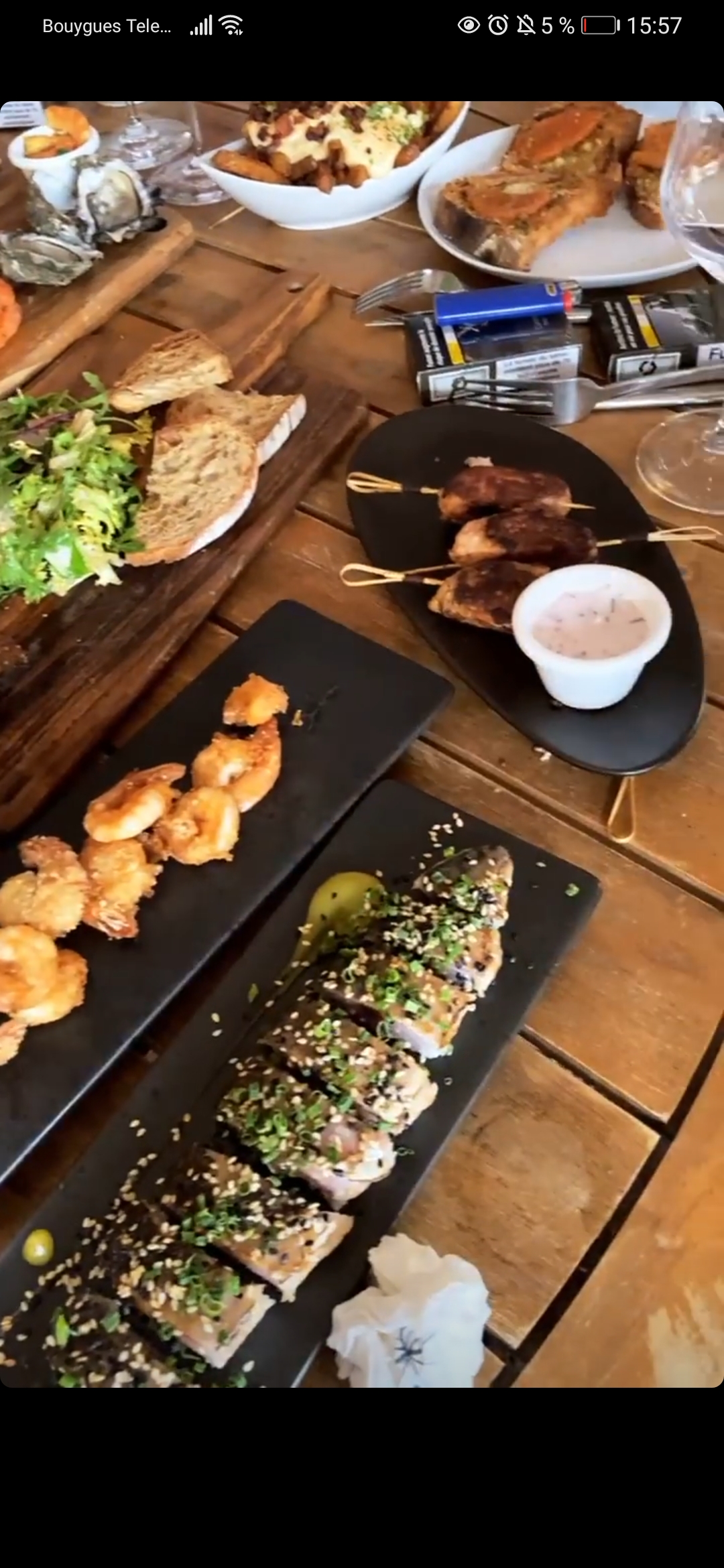 Nous avons pris des planches de tapas ( 12€ la planche ), assez bien garnies, et très bonnes avec produits qui semblaient frais. Nous avons poursuivies avec des moules frites, très bonnes ! Moules fraîches et frites maison ( ce qui est tellement rare maintenant ). Rapport qualité prix au rendez vous, personnel très agréable, et ambiance également car un DJ était présent. A éviter si vous venez avec de jeunes enfants par contre. Je recommande ce bar/ restaurant et je reviendrais certainement.