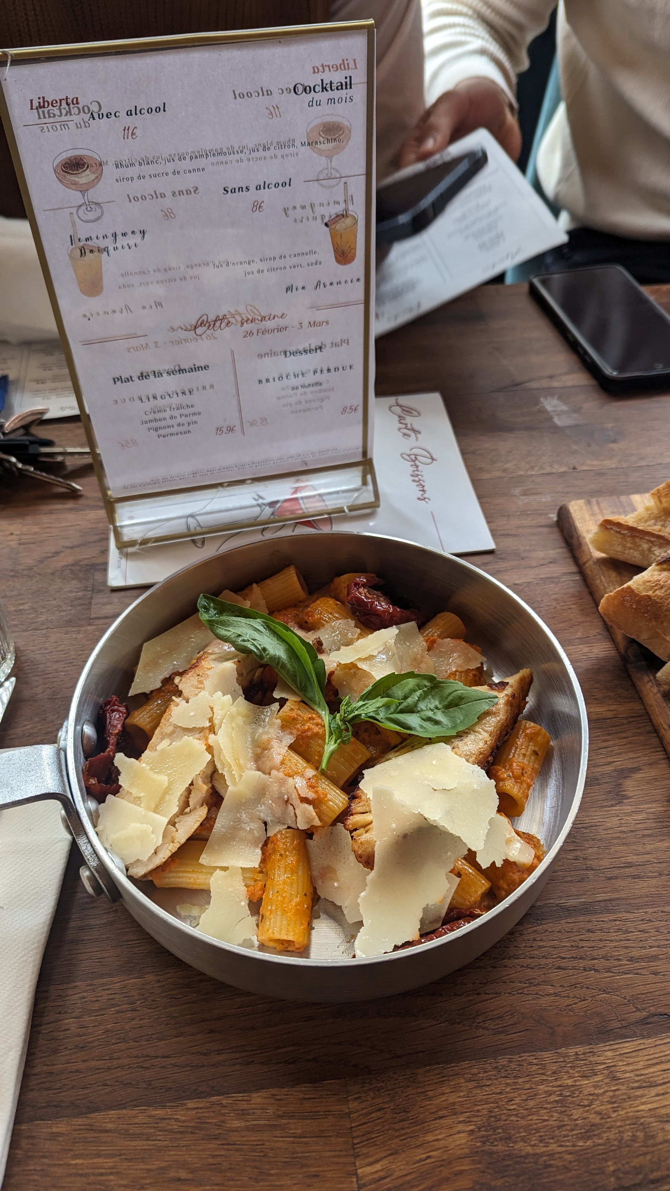 Juste à côté du forum des Halles se trouve Liberta. C'est un très très bon resto italien. Ça faisait longtemps que je n'avais pas mangé des plats italiens aussi savoureux. Risotto au poulet crémeux et bien équilibré, mafaldine bolognaise excellente également. Joli cadre et prix très raisonnable.