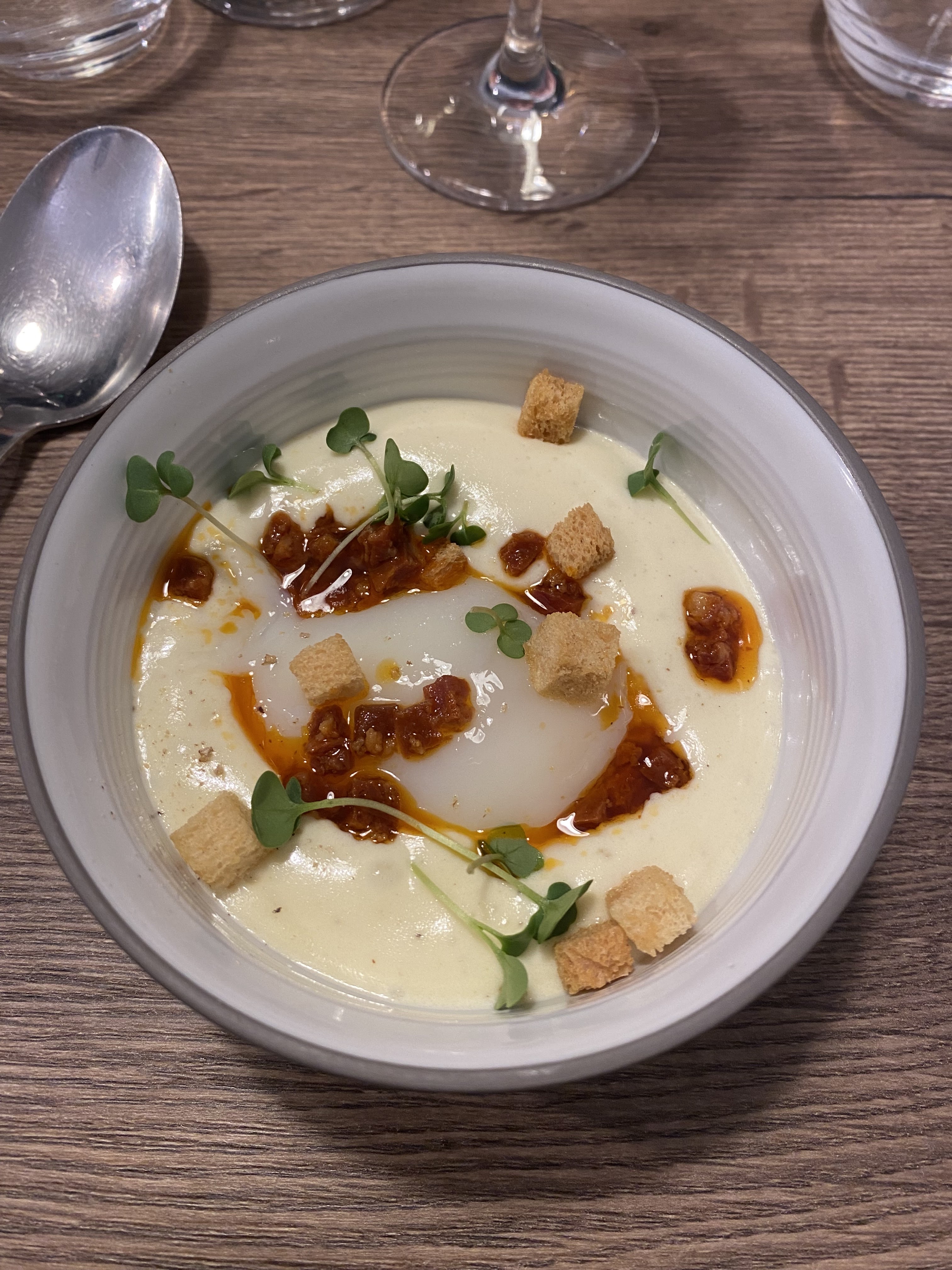 Nous avons pris le menu en 3 plats, l'entrée était excellente (espuma de pomme de terre et oeuf parfait avec morceaux de chorizo) et le plat également (malgré un changement de dernière minute dans sa composition). Le dessert était plus décevant (coulant chocolat caramel, en dessous des deux autres plats). Niveau service, rapide, mais avec très peu de conseil (pour le vin, le seul critère donné pour les choisir était le prix du verre, nous aurions aimé plus de détails sur les vins en eux-mêmes)