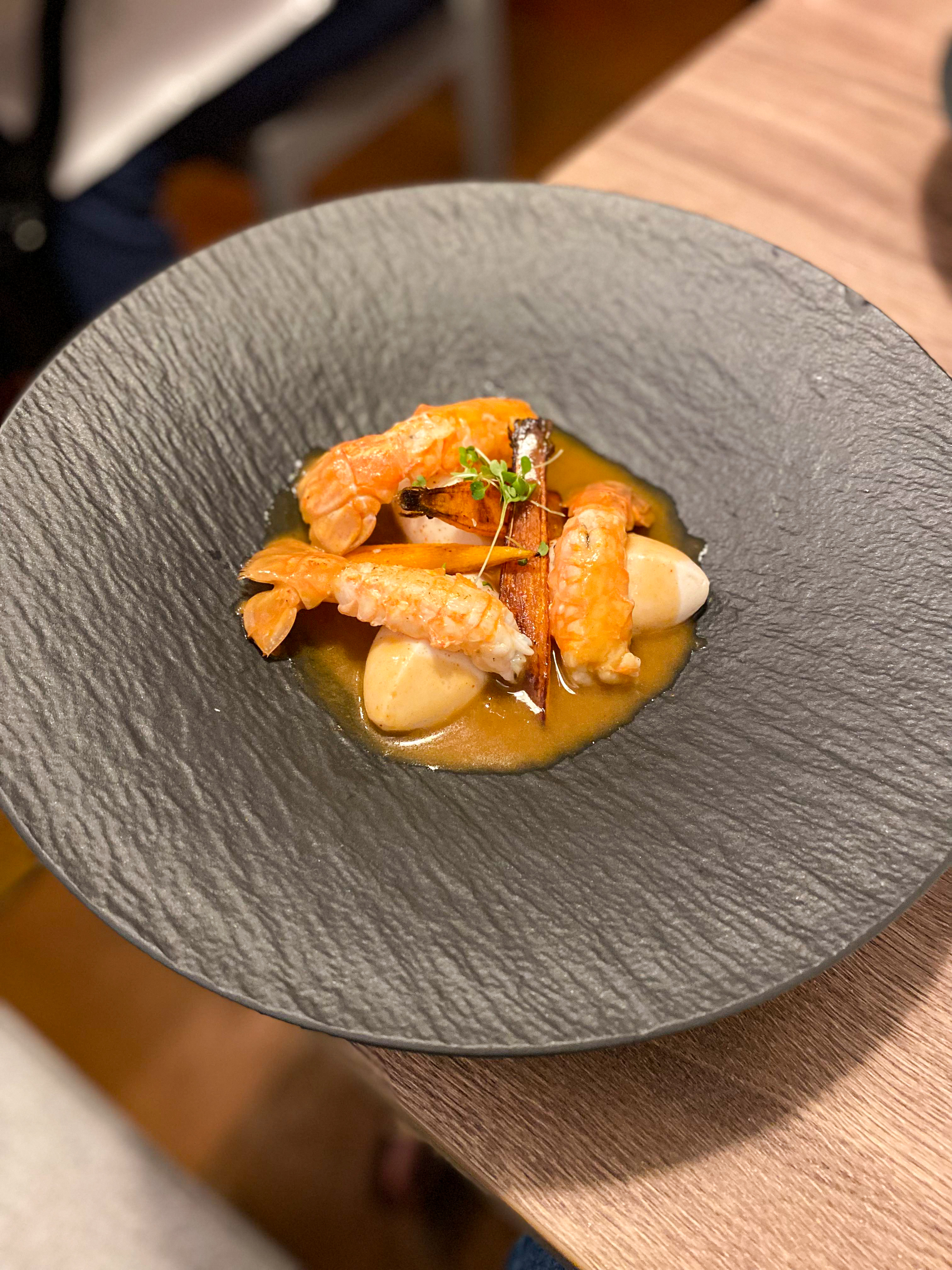 Expérience décevante Salle de restaurant très exiguë, on est très mal installé Les assiettes sont plutôt bien exécutées (langoustines et sole ) mais la pâte de la raviole en entrée était beaucoup trop épaisse Pour le service c’est compliqué puisque le chef est à la fois en cuisine et en salle donc difficile de tout faire correctement ! Vraiment on ne renouvellera pas, je ne comprends même pas le référencement dans le guide Michelin Très cher pour l’expérience proposée