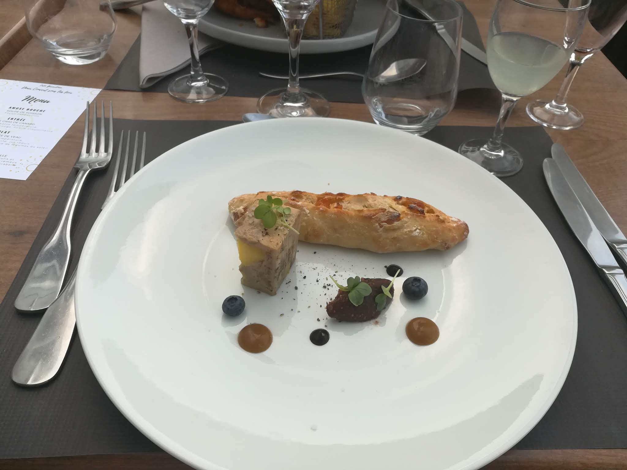 Repas au restaurant uniquement originalité menu surprise 4 services réa lisation parfaite de tous les plats,découverte degustative agréable et service très agréable également,merci