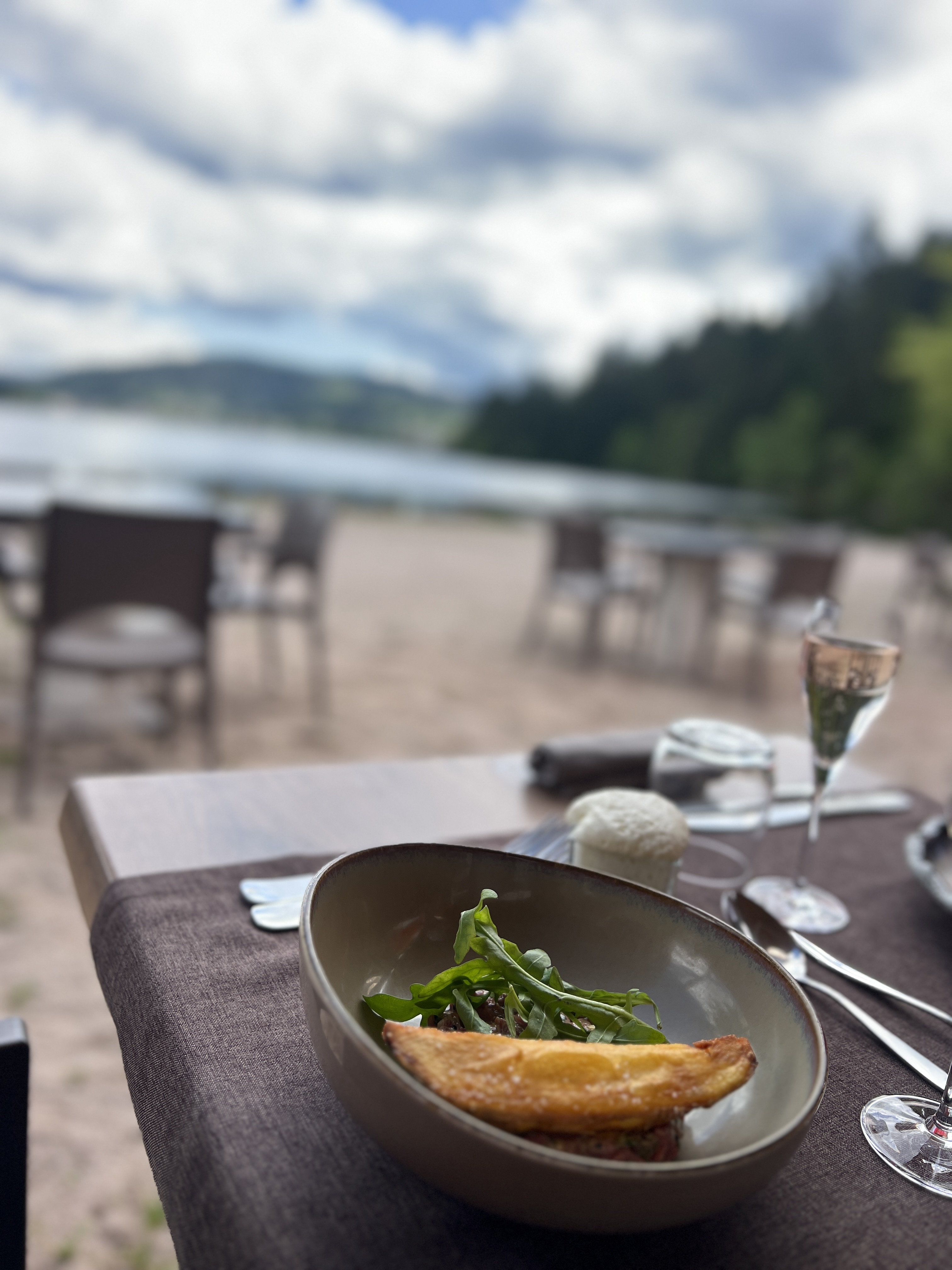 Dîner en terrasse devant le lac tellement majestueux ! Un moment parfait !