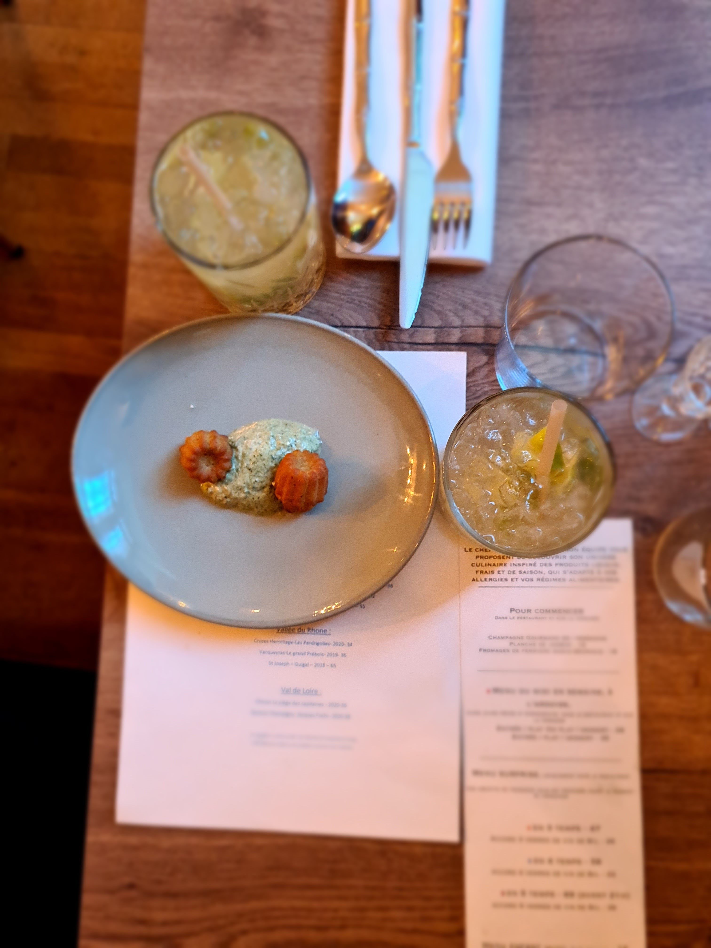 Une première visite dans ce restaurant à la carte appétissante, simple et efficace dans les dénominations. Un choix entre menu et plats à la carte. Une jolie table ovale à 5 dans une salle bien décorée. Une mention spéciale au sol en bois de caisses à vins et aux cadres dans les toilettes! Le serveur est très agréable et attentif à la gestion de la table, cependant, quelques petits accros nous font mettre 4 ou lieu de 5 étoiles: - un verre de vin blanc commandé pour le plat et qui doit être servi frais arrive sur la table avant la fin même de l'apéritif - un trio de la mer en plat qui arrive en mode duo poisson et moules sans les crevettes annoncées à la.commande, nous renvoyons l'assiette qui revient avec une seule crevette (qui n'est en fait qu'une demie crevette décortiquée). Notons tout de même que l'harmonie est présente dans le plat, lié par une bonne sauce - n'ayant ni nappe ni set de table sur ma jolie table en verre, il était dérangeant d'y poser les couverts, parfois sales entre 2 plats sans qu'ils ne soient changés automatiquement.