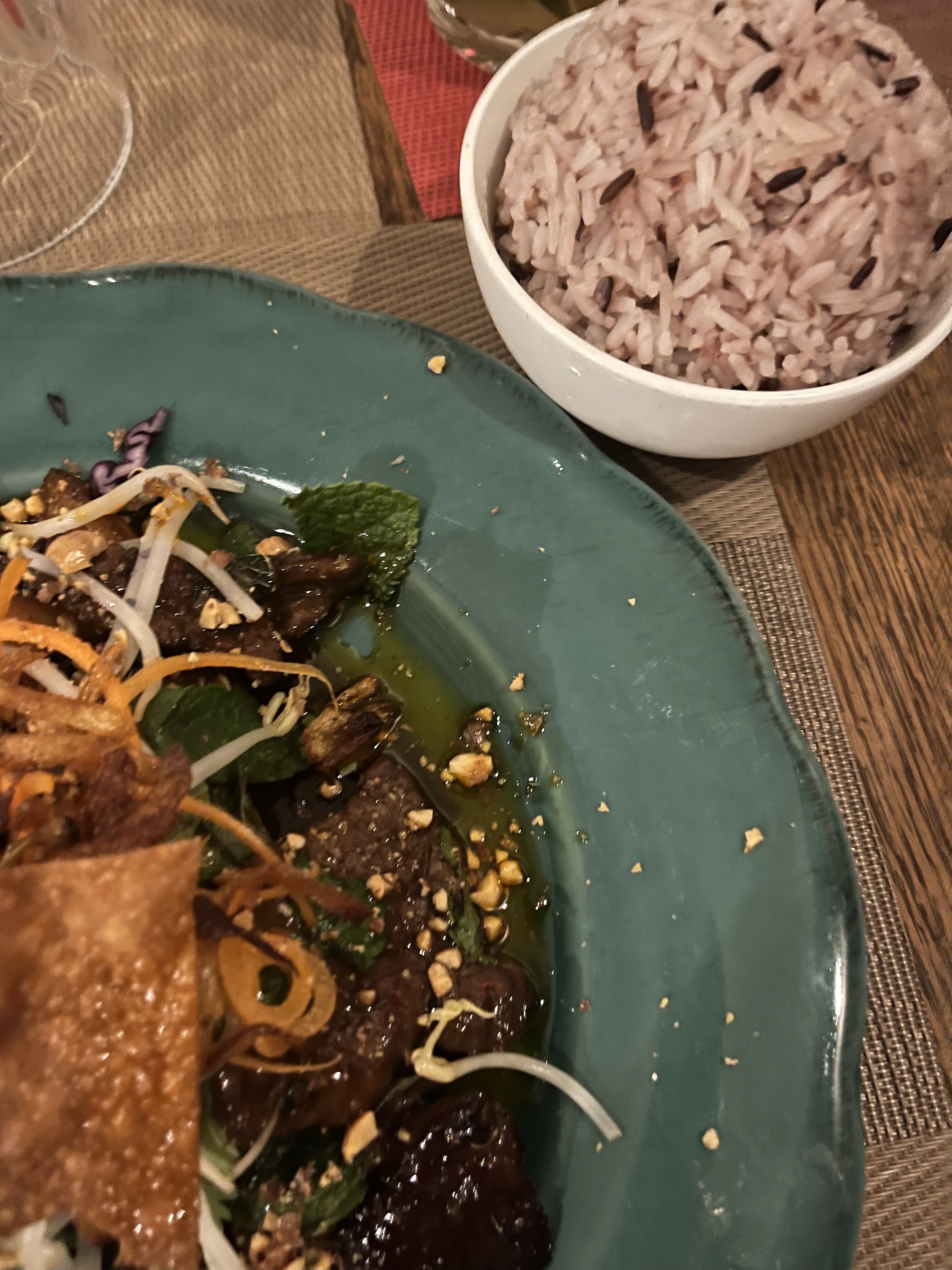 J'ai mangé des nouilles au bœuf grillé, façon originale de préparer. Un peu de curry. J'ai adoré les entrées. Nems excellentes