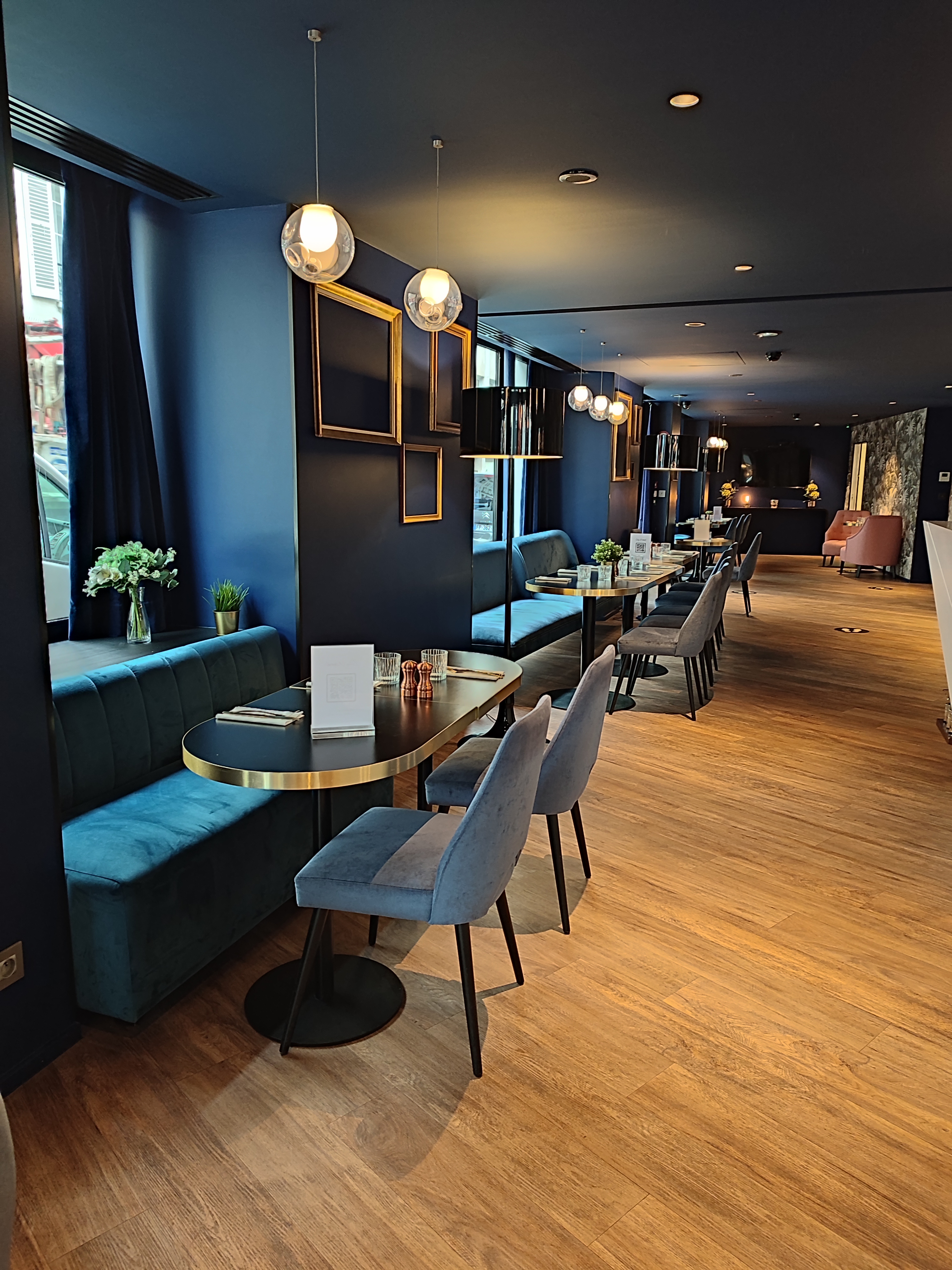 Hôtel-restaurant NH Champs Elysées 4*. Bonne conception des lieux, il dispose de fenêtres donnant sur la rue et d'une ambiance très agréable. Nous y sommes allés en groupe et le personnel nous a traités très rapidement et très amicalement. Les prix sont assez bons et la qualité est excellente. Bonnes portions. Le tartare de canard est fortement recommandé, c'était un délice. Le même espace est utilisé comme salle de petit-déjeuner de l'hôtel.