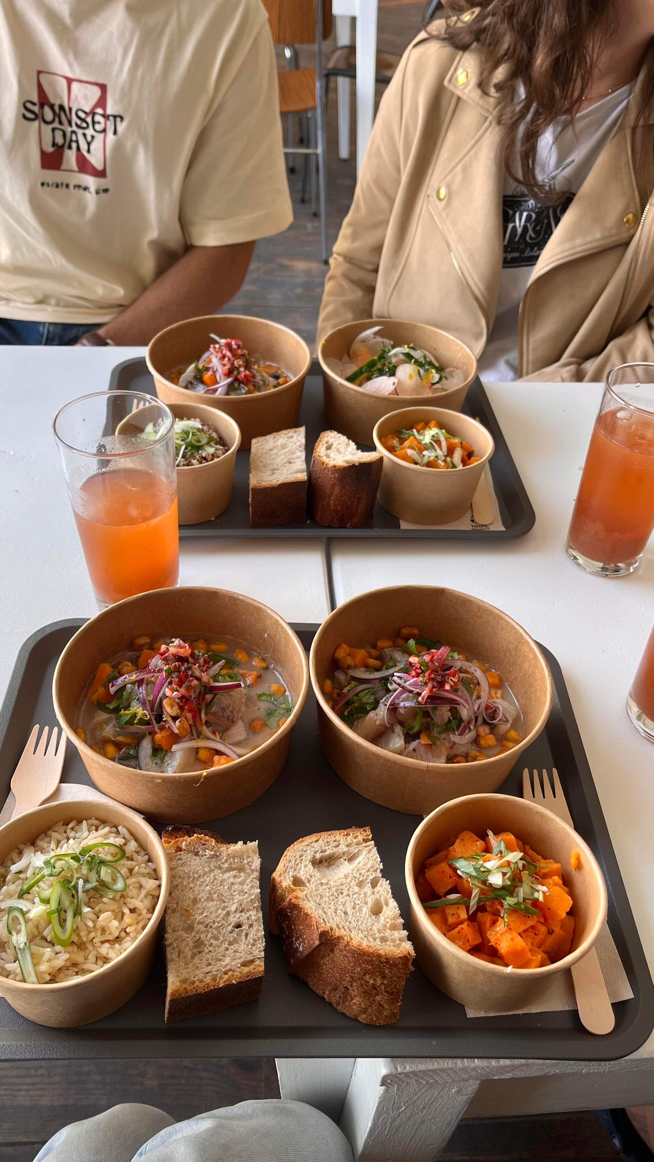 La nourriture était servie dans des récipients en plastique/papier. Ce qui est bizarre pour ce prix d'un plat. Nous avons commandé du ceviche - la taille du plat est très petite et le goût n'est pas bon. Je ne recommanderais pas cet endroit pour la nourriture, peut-être juste pour le café et de belles vues.