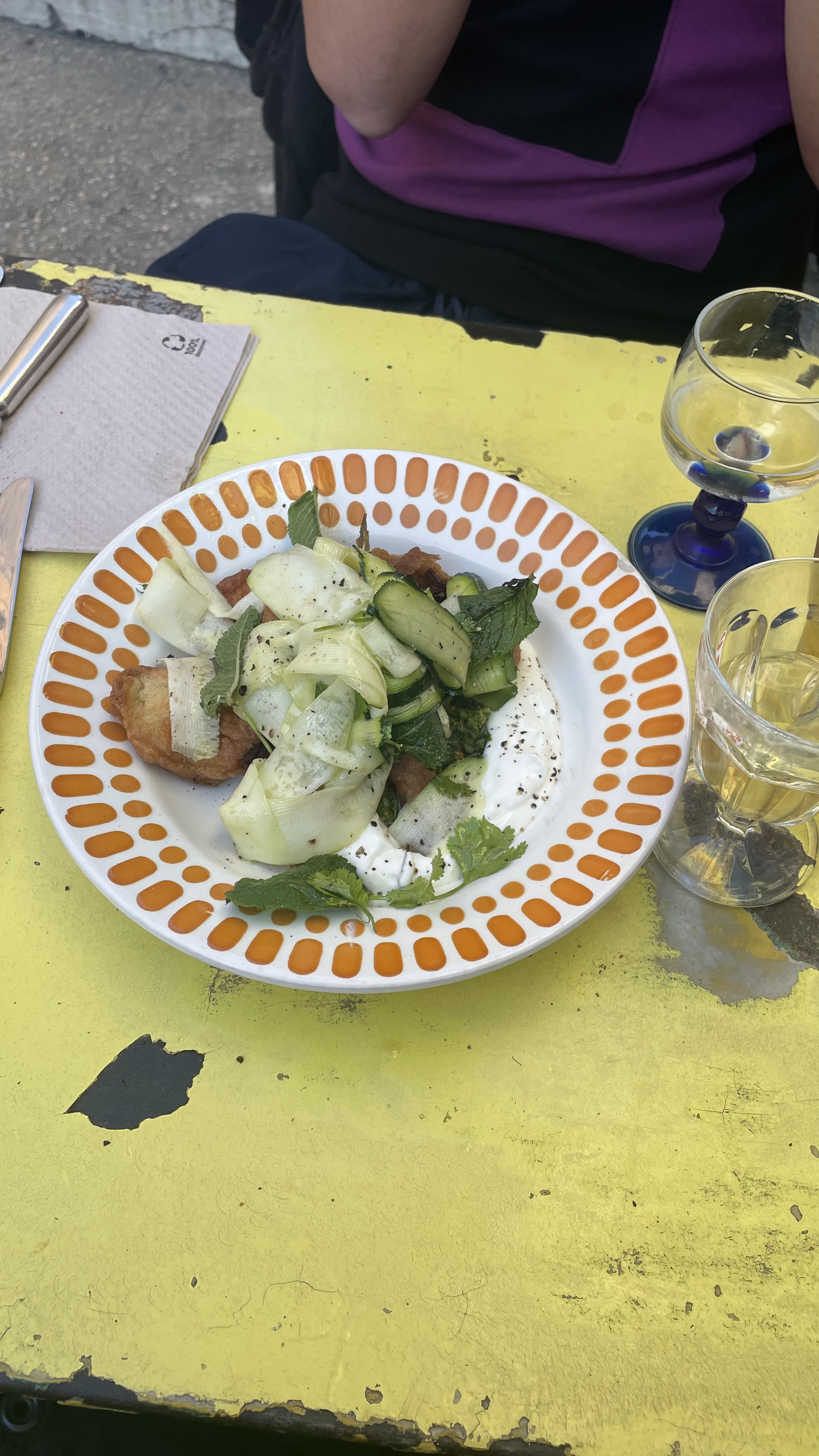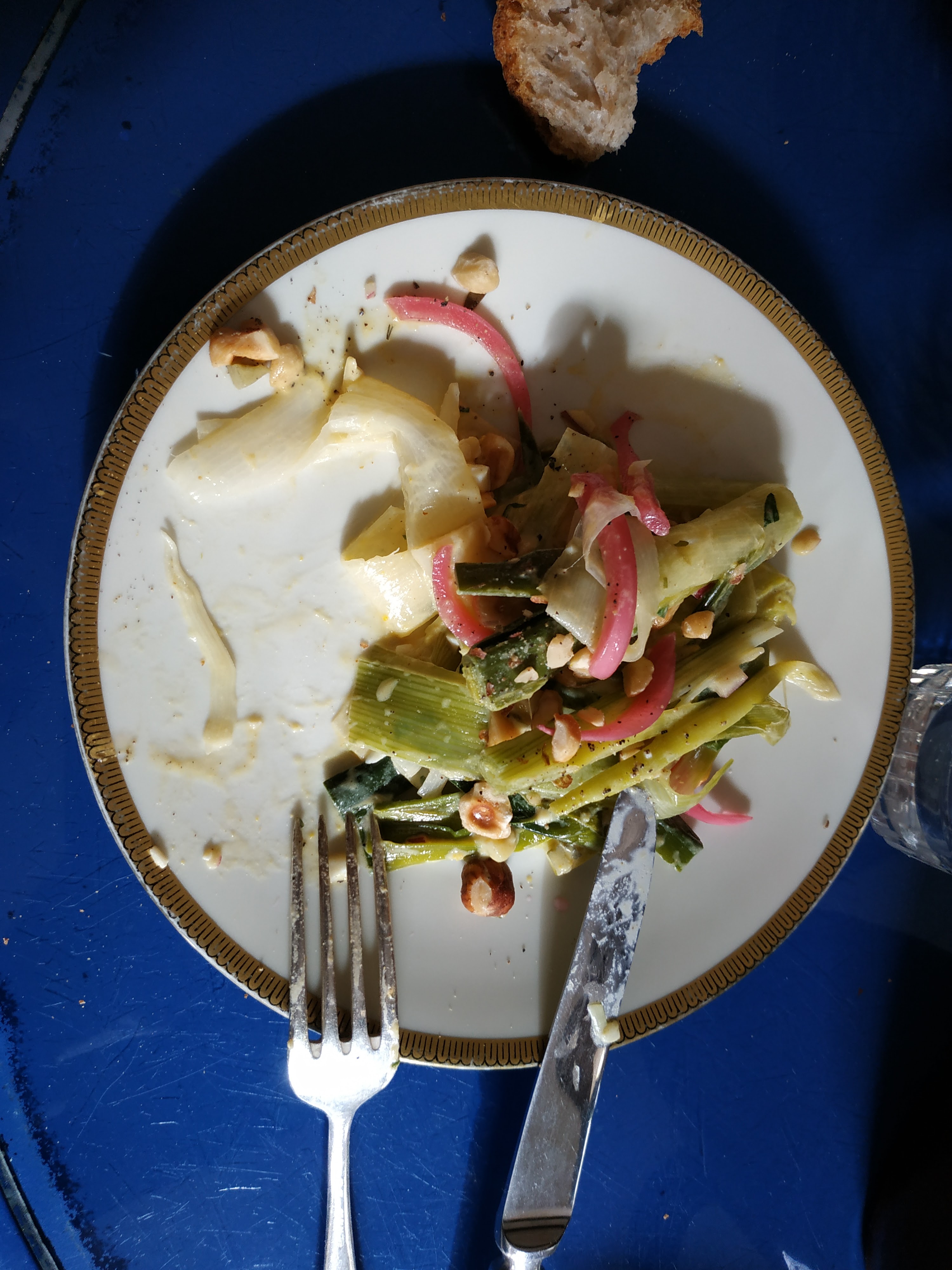 Limmat est l'un des restaurants les plus cool de Marseille. Tout le monde veut y aller, il n'y a jamais de place ou il y a une énorme file d'attente dehors avec l'espoir, tôt ou tard, qu'une table se libère. En plus d'être dans un quartier très animé comme Creature, l'ambiance à l'intérieur et à l'extérieur du lieu est également très animée. C'est une cuisine très contemporaine, voire d'avenir, faite d'herbes et de matières premières très simples mais bien mélangées. Au Limmat, on mange très bien et on dépense peu, pour : Cabillaud vapeur, poireaux poivrés grillés, pommes de terre vapeur, mayonnaise au fenouil, pétales d'oignons rôtis Putain je ne me souviens pas de la citrouille... en tout cas c'était parfait Labné au citron avec brocoli vapeur, graines de tournesol et piment frais Ailes de raie aux chicorées, oignons rouges et câpres Enfin une pavlova parfaite aux poires au vin rouge 4 verres de vin rouge pour un total de 56€ Venir à Marseille et ne pas manger au Limmat, c'est comme aller à Rome et ne pas voir le Colisée, plus ou moins