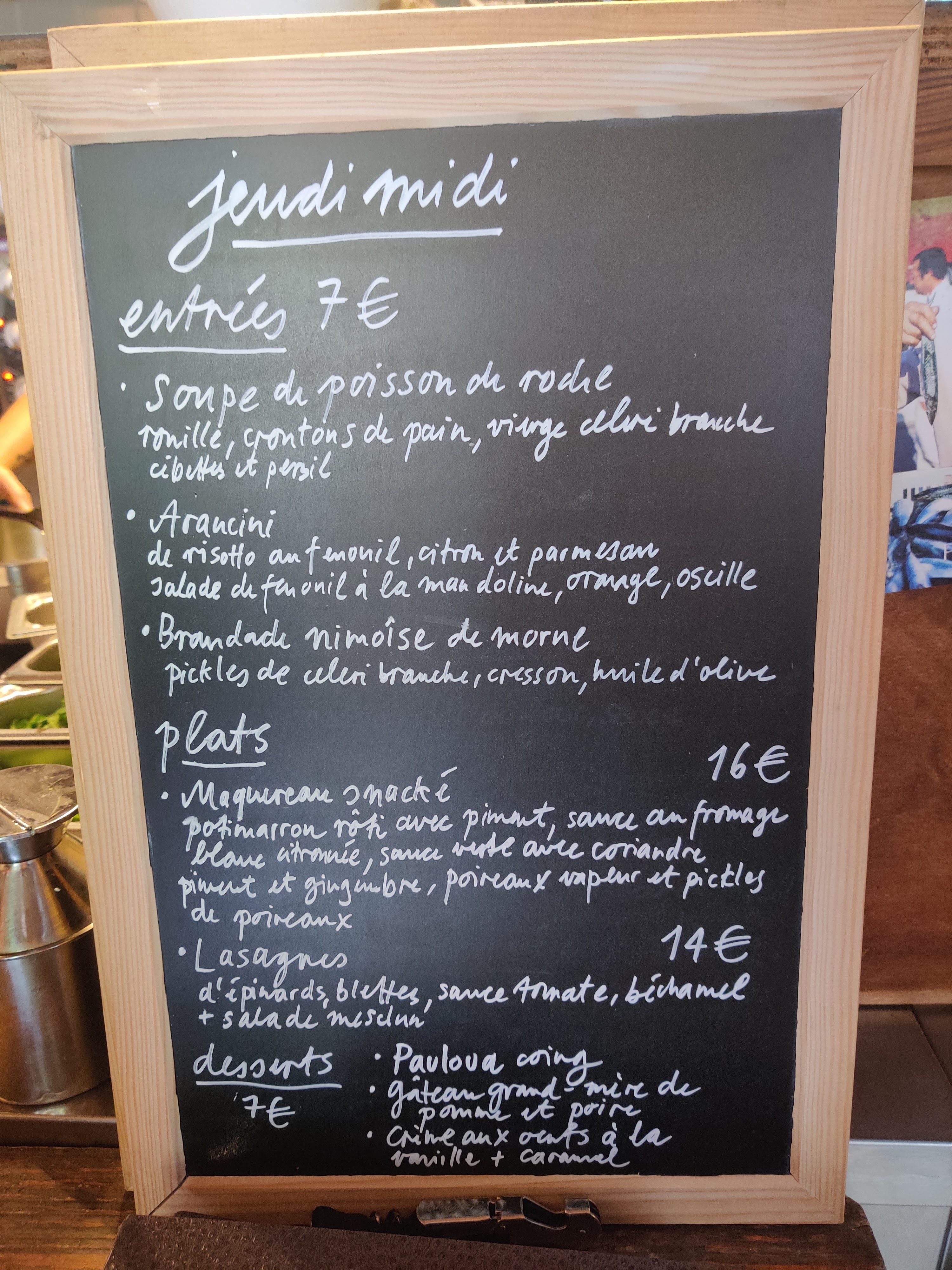 Incroyablement délicieux, produits frais et locaux, bien préparés, pas de chichis, juste plein de saveurs, un vrai vrai régal - il vaut mieux réserver pour avoir une table mais n'hésitez pas. La carte change tous les jours, c'est pas cher, vous êtes bien logés! Une vraie cantine délicieuse