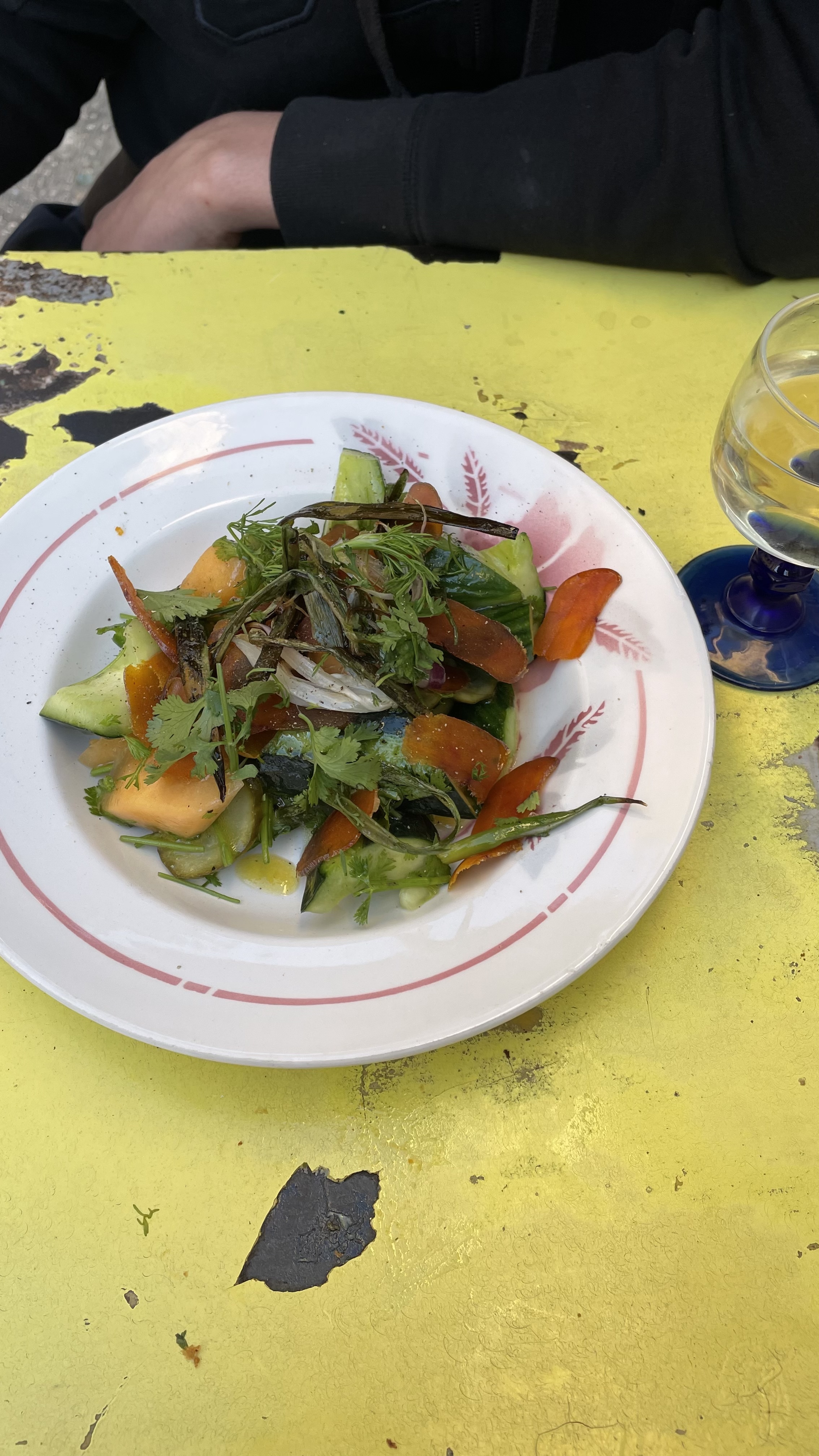 Un bon kiff ! Il y a quelques tables dehors et il faut réserver au minimum 2 jours à l’avance, l’expérience est très agréable dans un spot remarquable pour les chineurs de street art. La carte est très sélective et fonctionne sur un système de tapas à partager, les assiettes varient de 12 a 14 euros avec des créations fraîches colorés et sans viande.