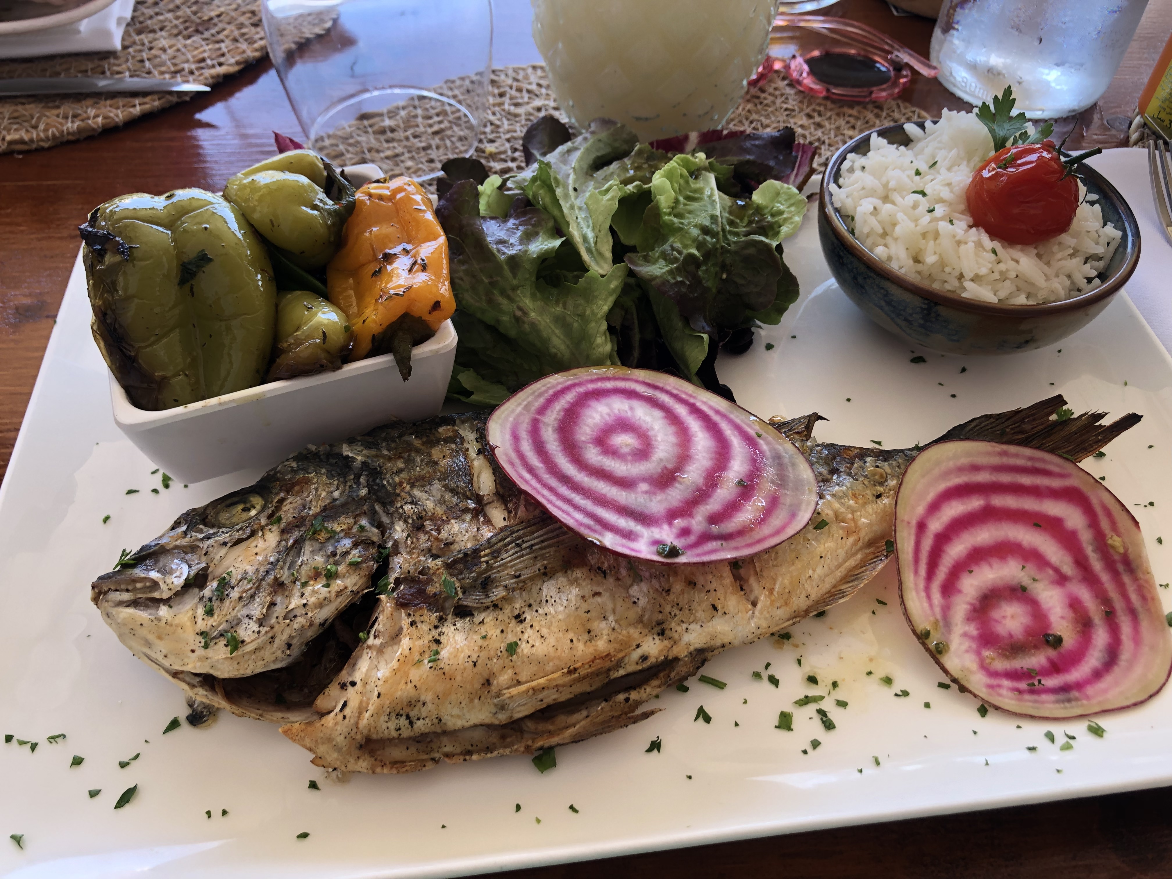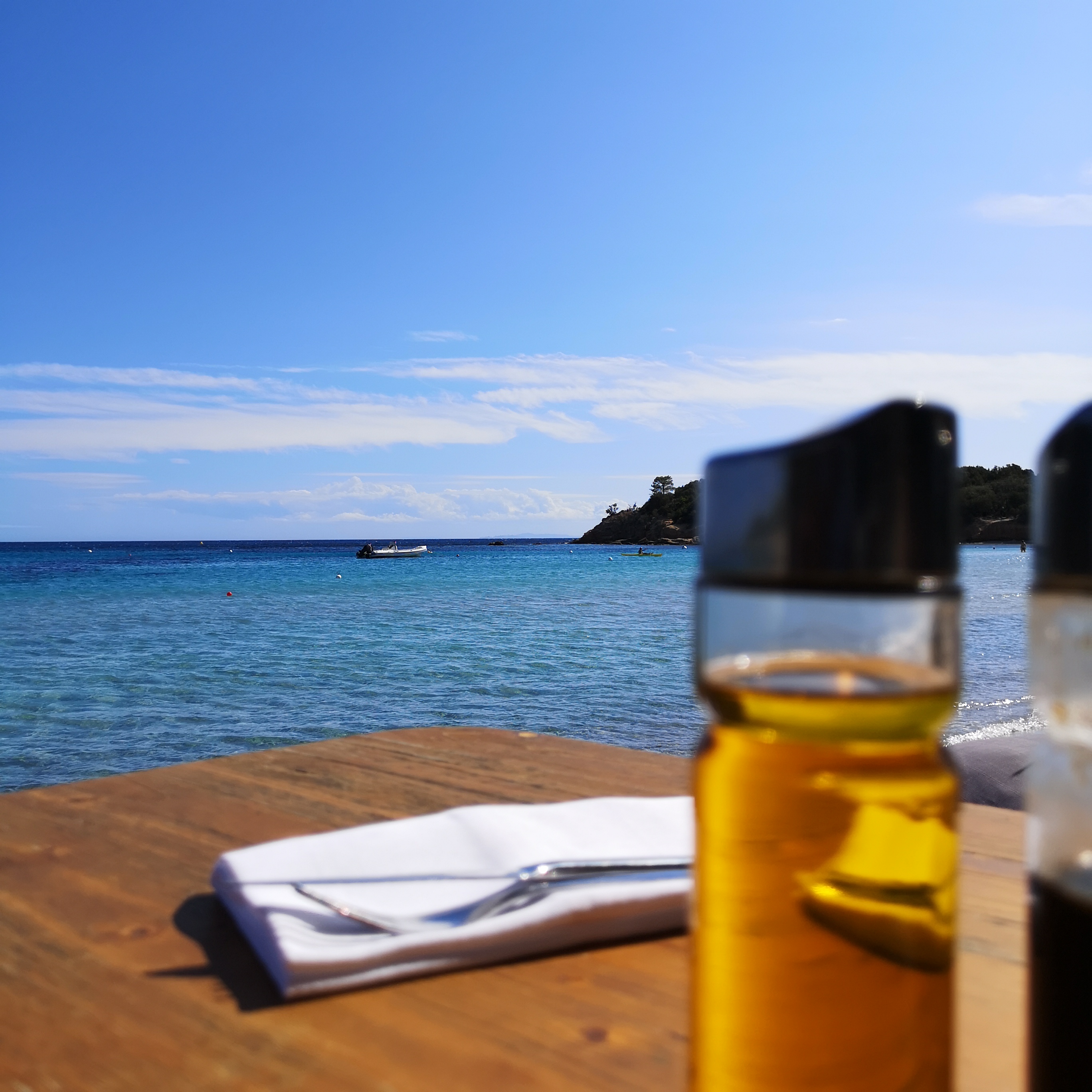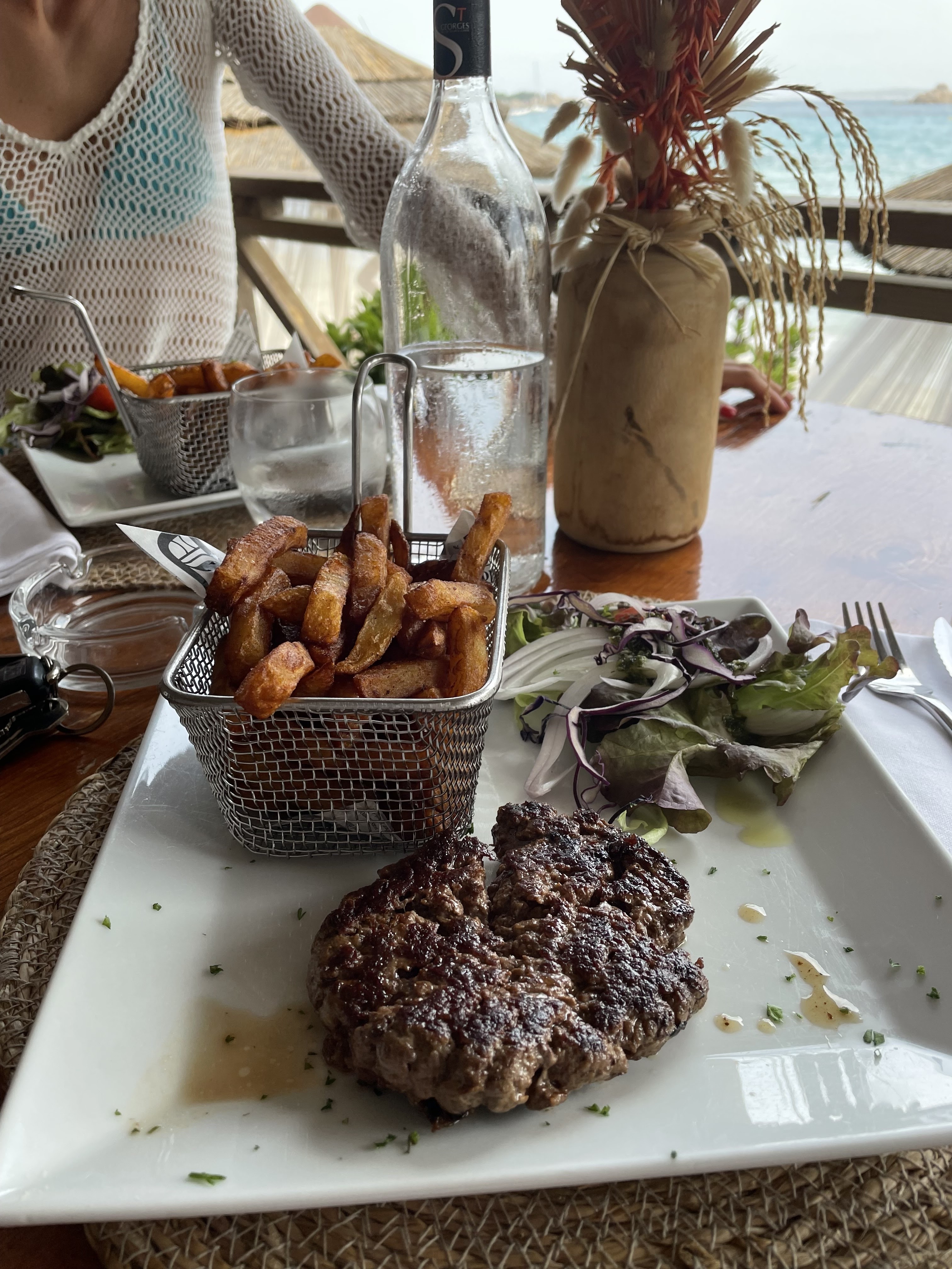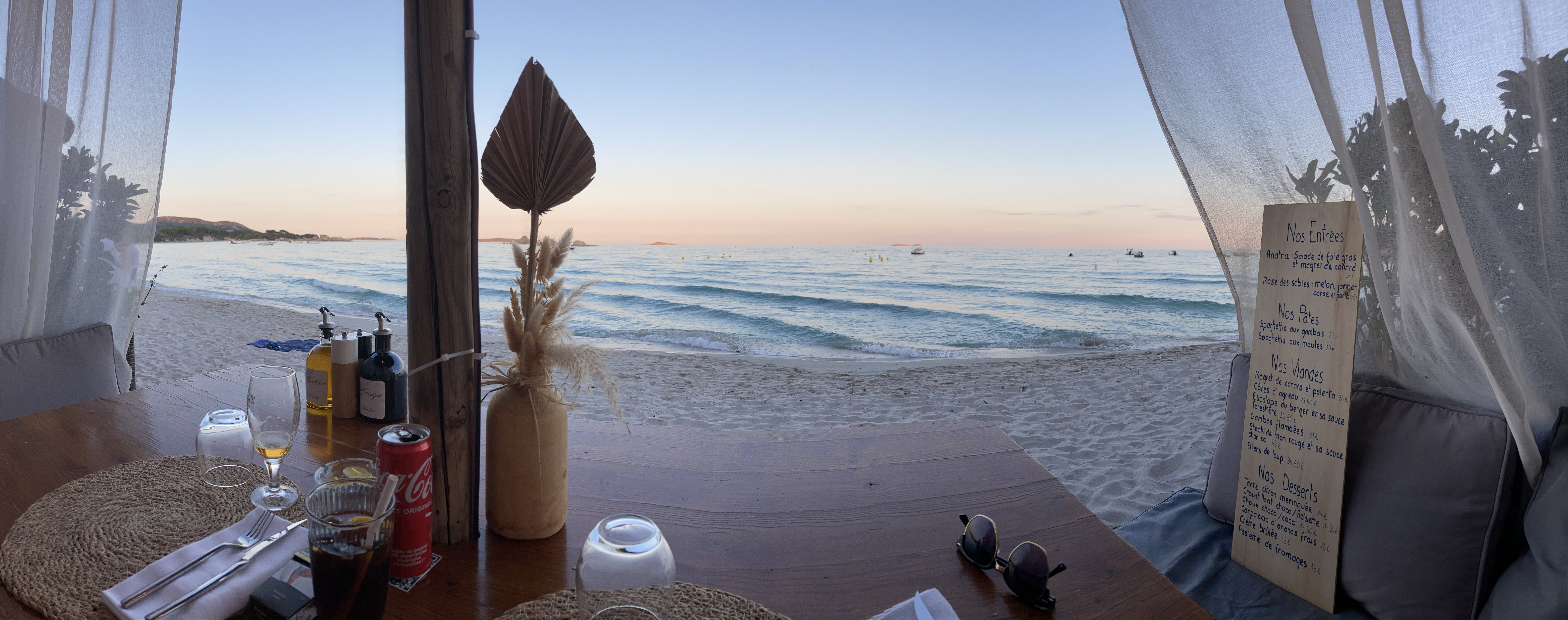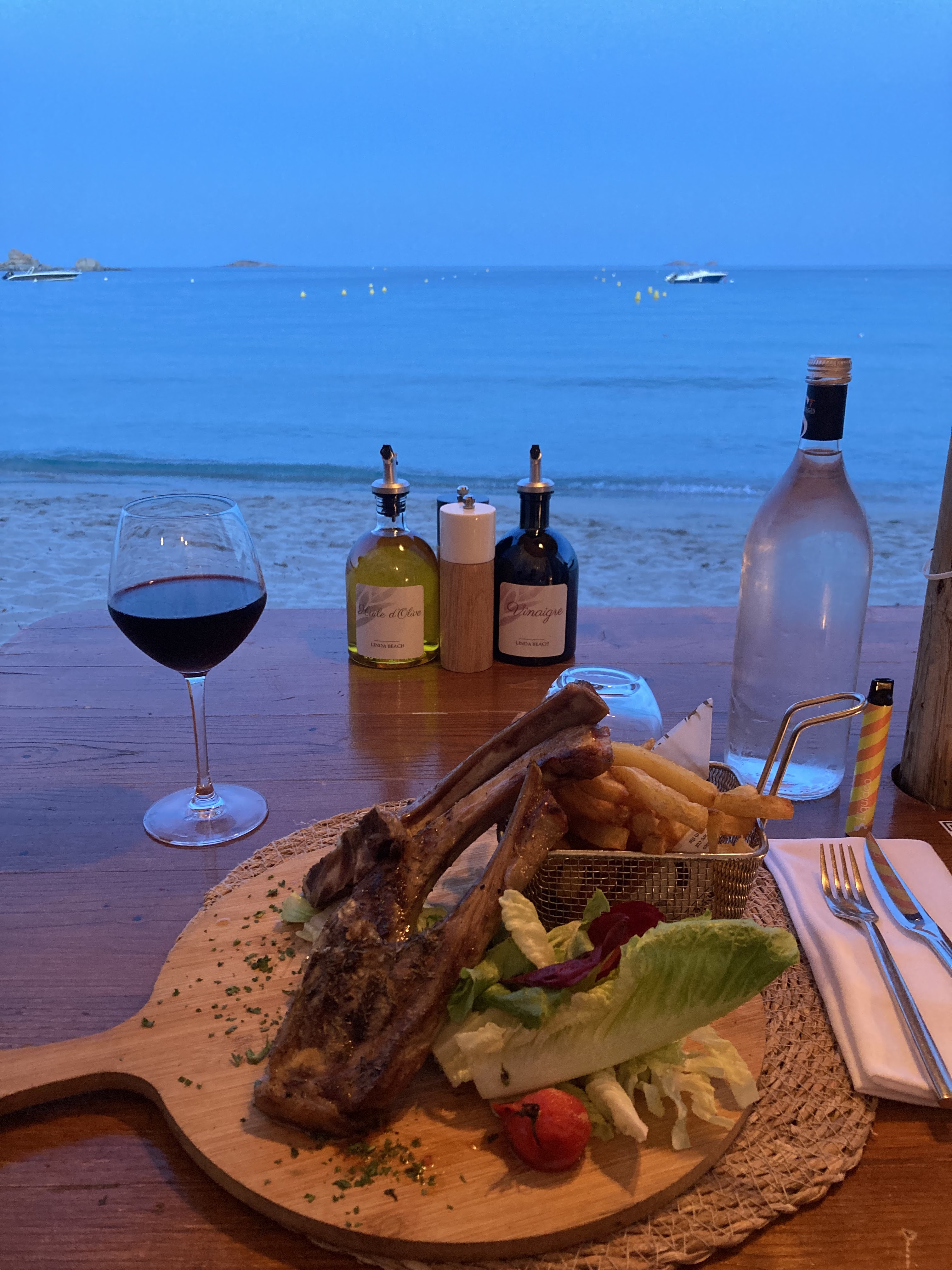 Nous sommes arrivés en soirée dans un cadre idyllique que ce soit, les tables, la plage, le point de vue, mais à part ça, tout est à redire. Le service est loin d’être parfait, la qualité des produits est plus que moyenne et les tarifs sont exorbitants. Si vous ne buvez pas d’alcool (soit vin, soit champagne uniquement) vous avez le choix entre l’eau plate ou de l’eau pétillante en bouteille et rien d’autre. Bref, un attrape touriste qui ne mérite pas le cadre dans lequel il se trouve.