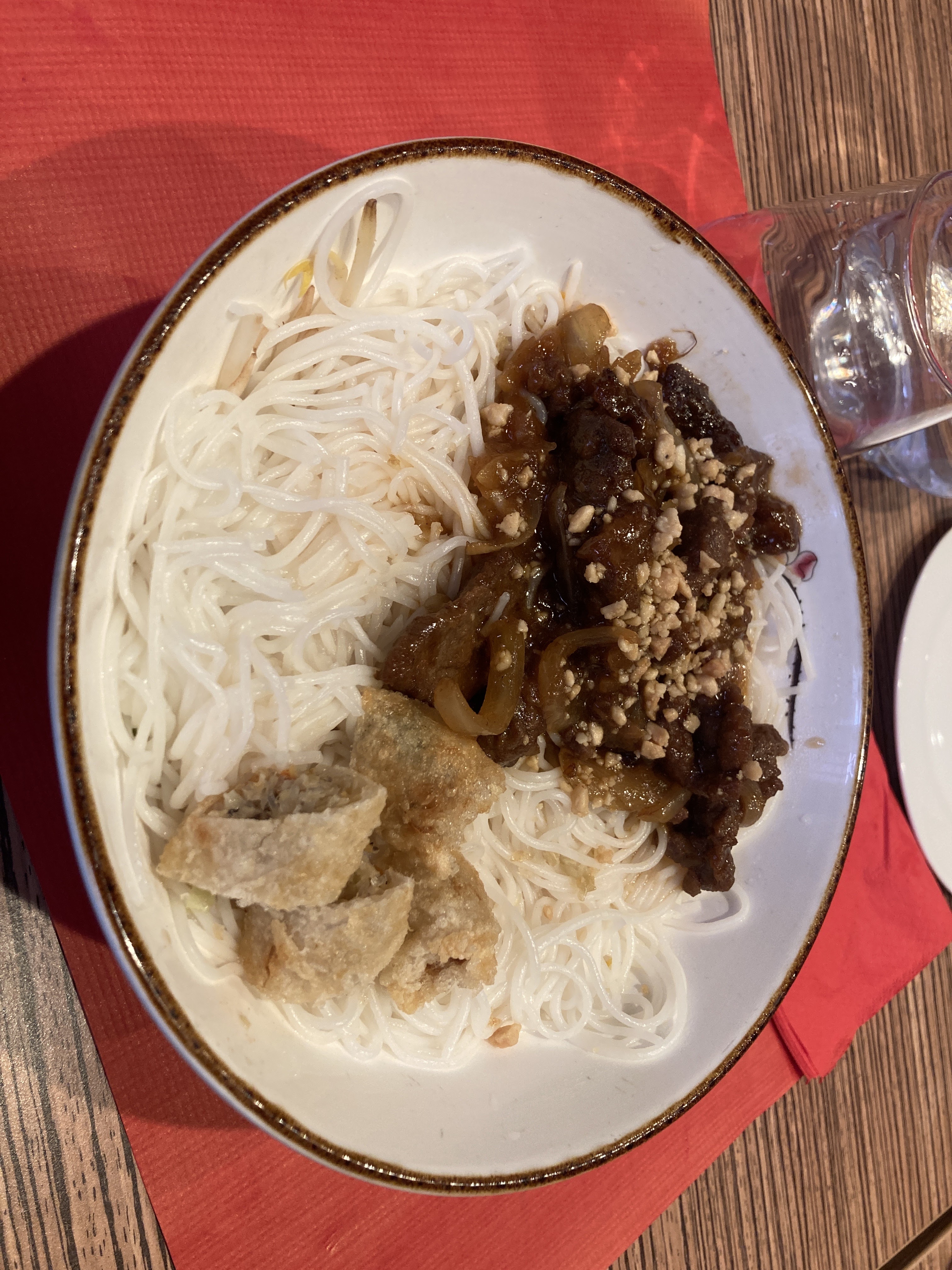Nous avons pris du steak de boeuf à la sauce soja et les crevettes hachées. Le boeuf était bon et les crevettes délicieuses. 1 étoile en moins car il y a pas mal d'attente entre le service de deux plats, ce qui fait qu'une ou deux personnes peuvent se retrouver avec des plat froids s'ils attendent. De plus, les prix indiqués sur le menu à l'entrée du restaurant sont faux, comptez 2 euros de plus par plat sur le menu.. Les prix sont donc élevés et les portions pas quantitatives mais plutôt qualitatives. 3.5/5