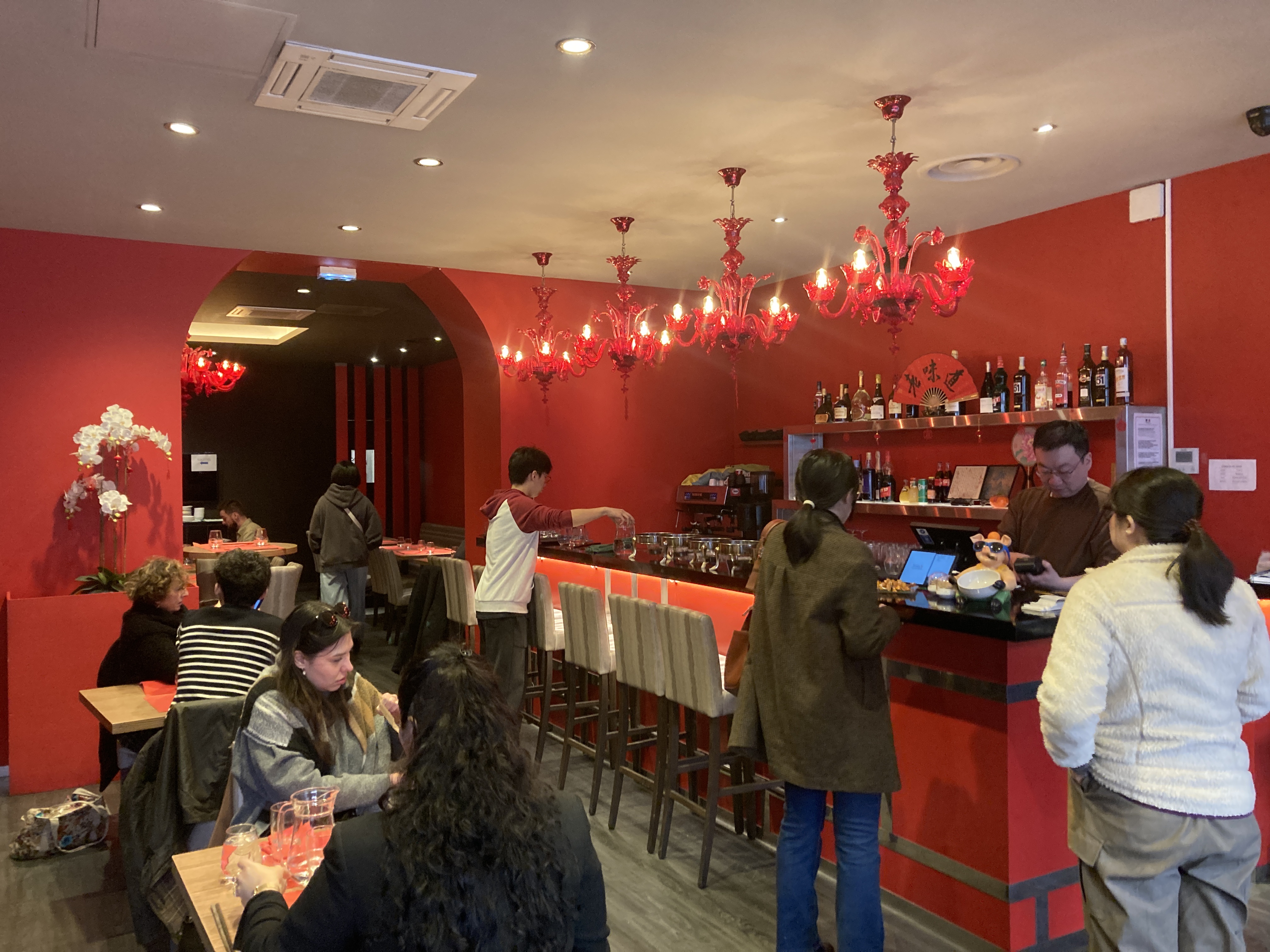 Mon avis est mitigé et reflète avant tout mes goûts personnels .... ce restaurant est je pense un très bon restaurant et un VRAI restaurant chinois, j’avoue que je préfère les versions européanisées.... beaucoup de choix à la carte et salle sympathique... Trois étoiles car service sans plus et la vision de trois serveurs derrière le bar plongés sur leur téléphone, j’ai trouvé ça moyen (même si ce n’est pas un drame...) C’est un détail mais les bouteilles de présentations derrière le bar recouvertes de poussière, ça aussi un peu bof....