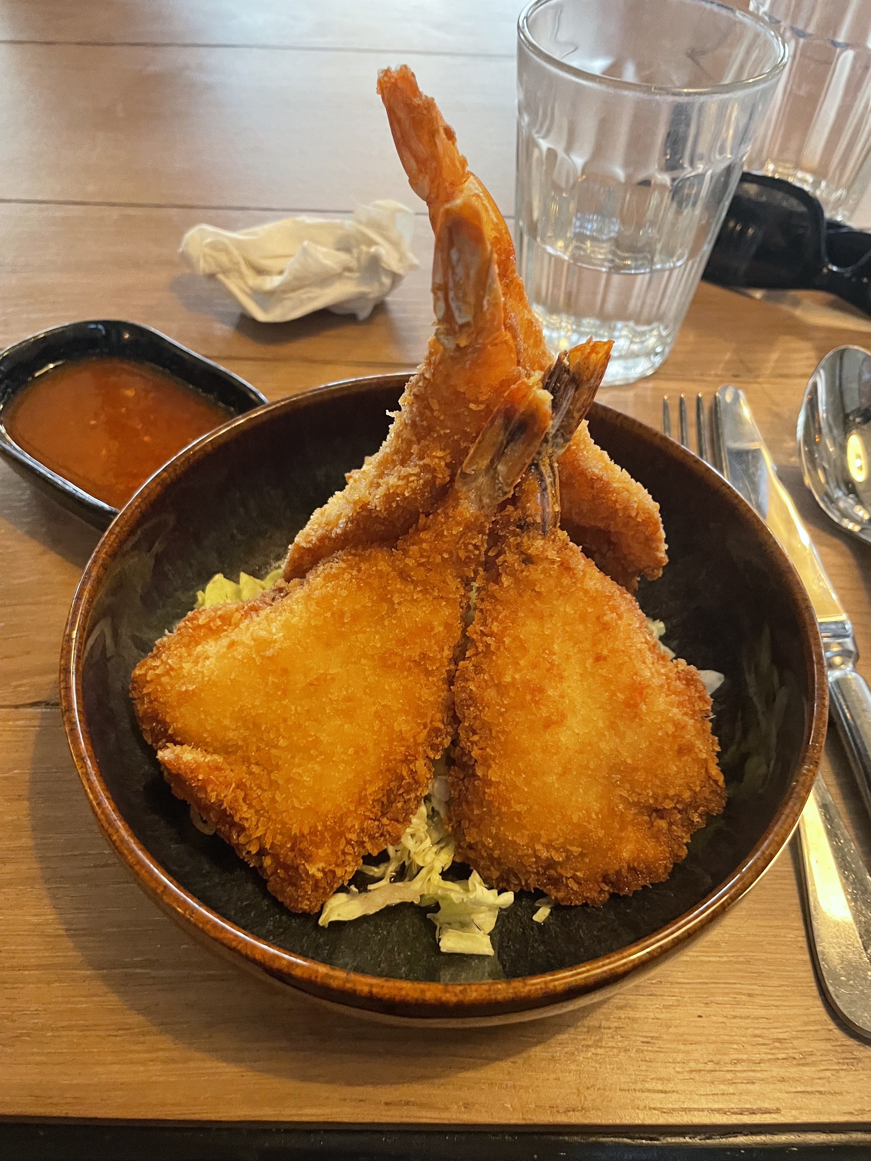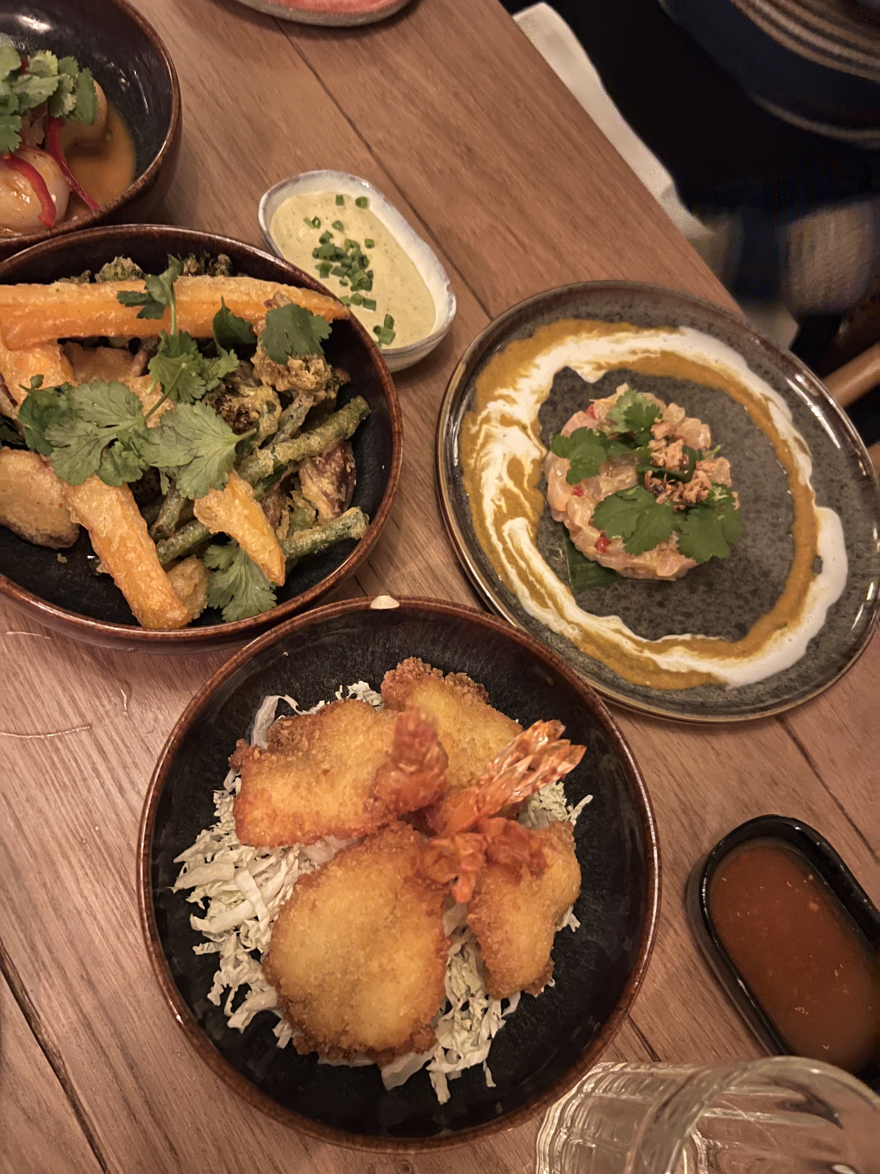 L'atmosphère était animée et chaleureuse. Le service était bon. J'ai aimé l'assortiment de tempura, la sauce était également savoureuse, mais les manger avec une fourchette est un défi car dès que la fourchette perce la tempura croustillante, la nourriture se brise en morceaux. Nous avons demandé des baguettes, qui sont des ustensiles typiques pour les tempuras, on nous a dit que les baguettes n'étaient pas disponibles, nous avons donc fini par ramasser la nourriture avec nos mains. Le crabe et la poitrine de porc au piment jalapeño auraient été savoureux s'ils étaient moins salés. La soupe était bonne. La tarte au citron en dessert était excellente.