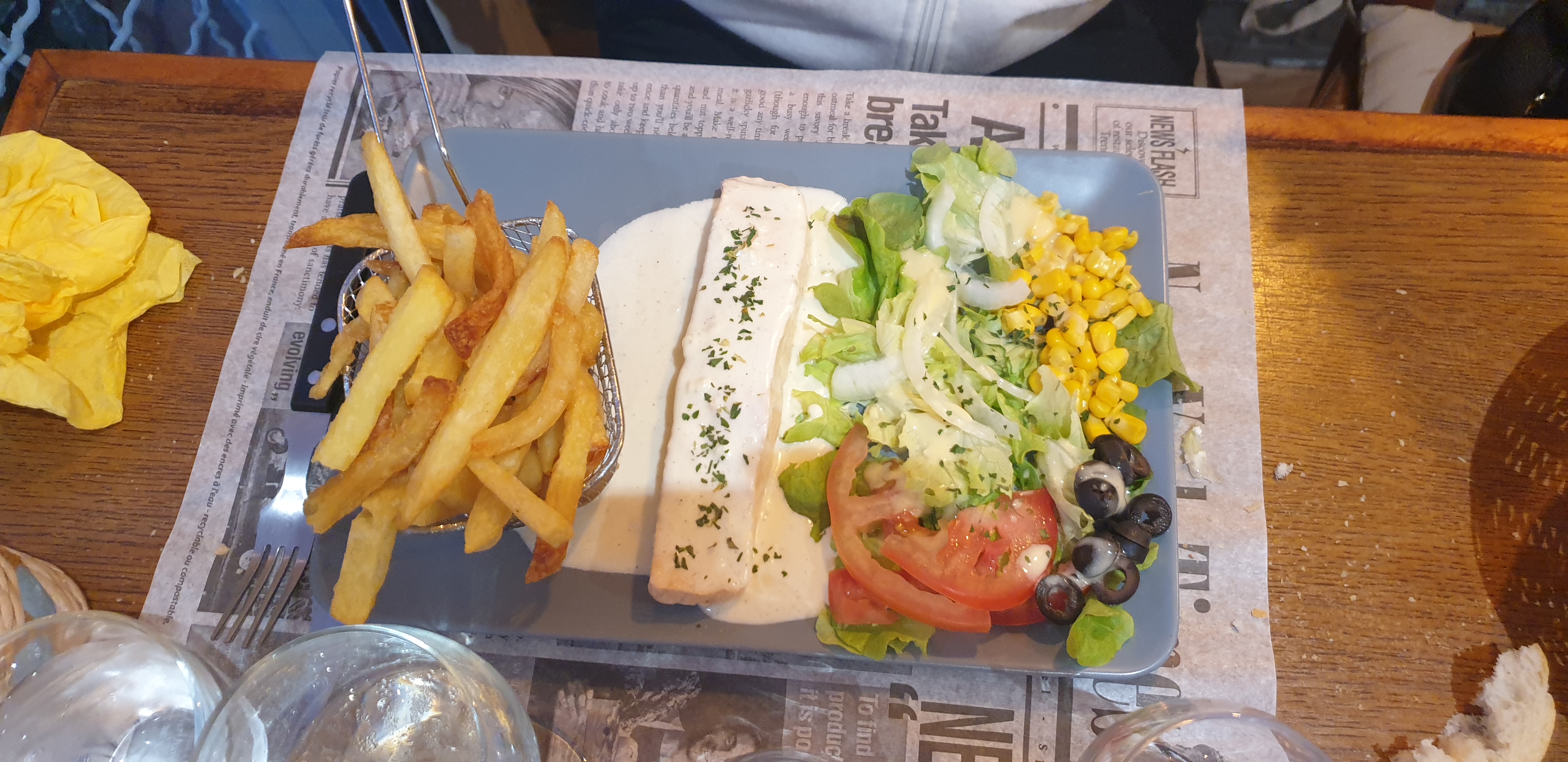 Repas très bon, poisson frais. Menu du jour : entrée+plat+dessert, 16,90€ ainsi qu'une choucroute de la mer à 14,90€. La serveuse était très agréable. Pourquoi n'avons nous pas eu de gâteau apéritif alors que certaines tables en ont eu ? Je n'ai qu'un reproche à faire, l'humour du patron qui laisse à désirer, une façon de parler qui ne me convient pas à mon goût.