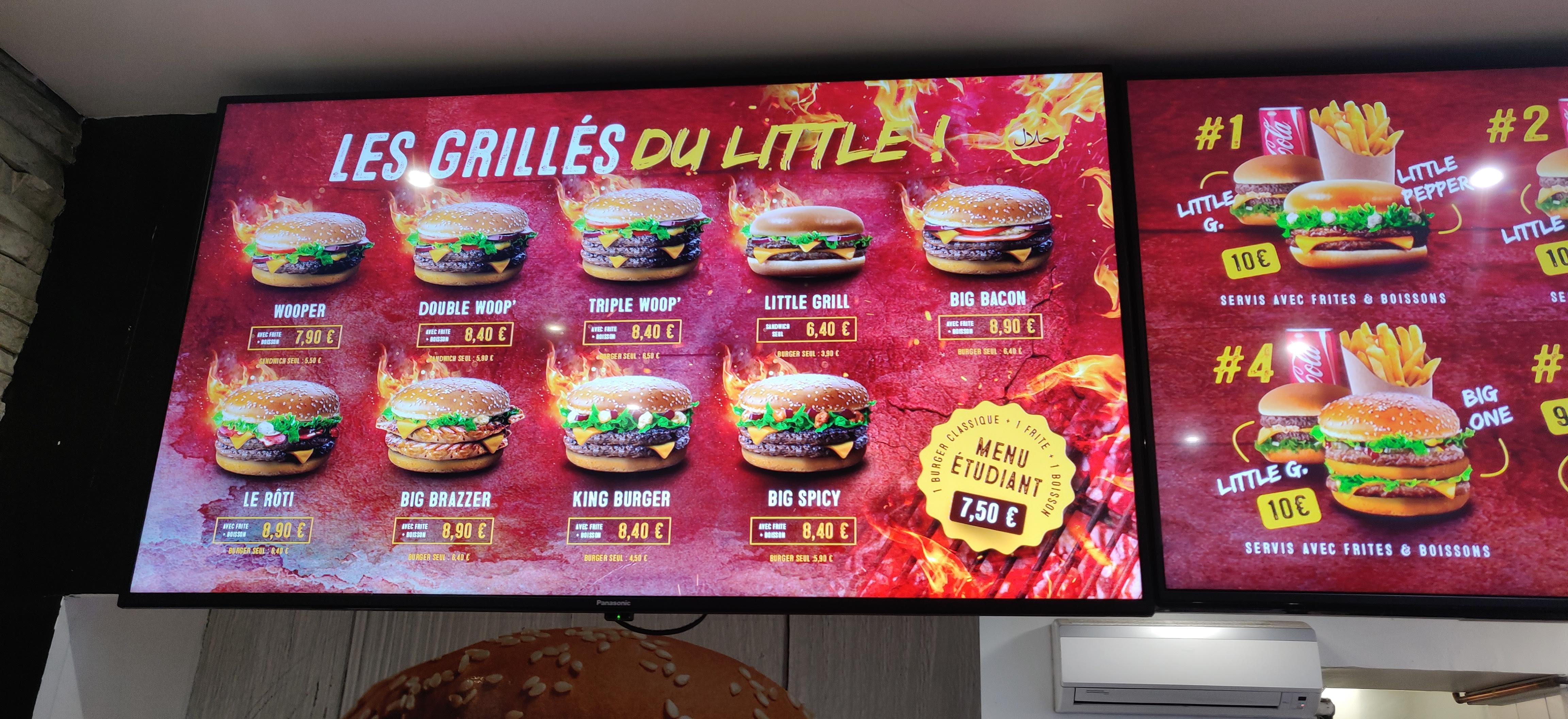 Fast food halal avec un grand choix de sandwich Burger une 20aine différent en moyenne entre 7-8 eu un menu avec frite boisson on peut commander par téléphone pour prendre ça commande sur place ou à emporter ils ont des frites spécial seul a faire ca dans le monde il y a des gens qui aime et d'autre qui aime pas