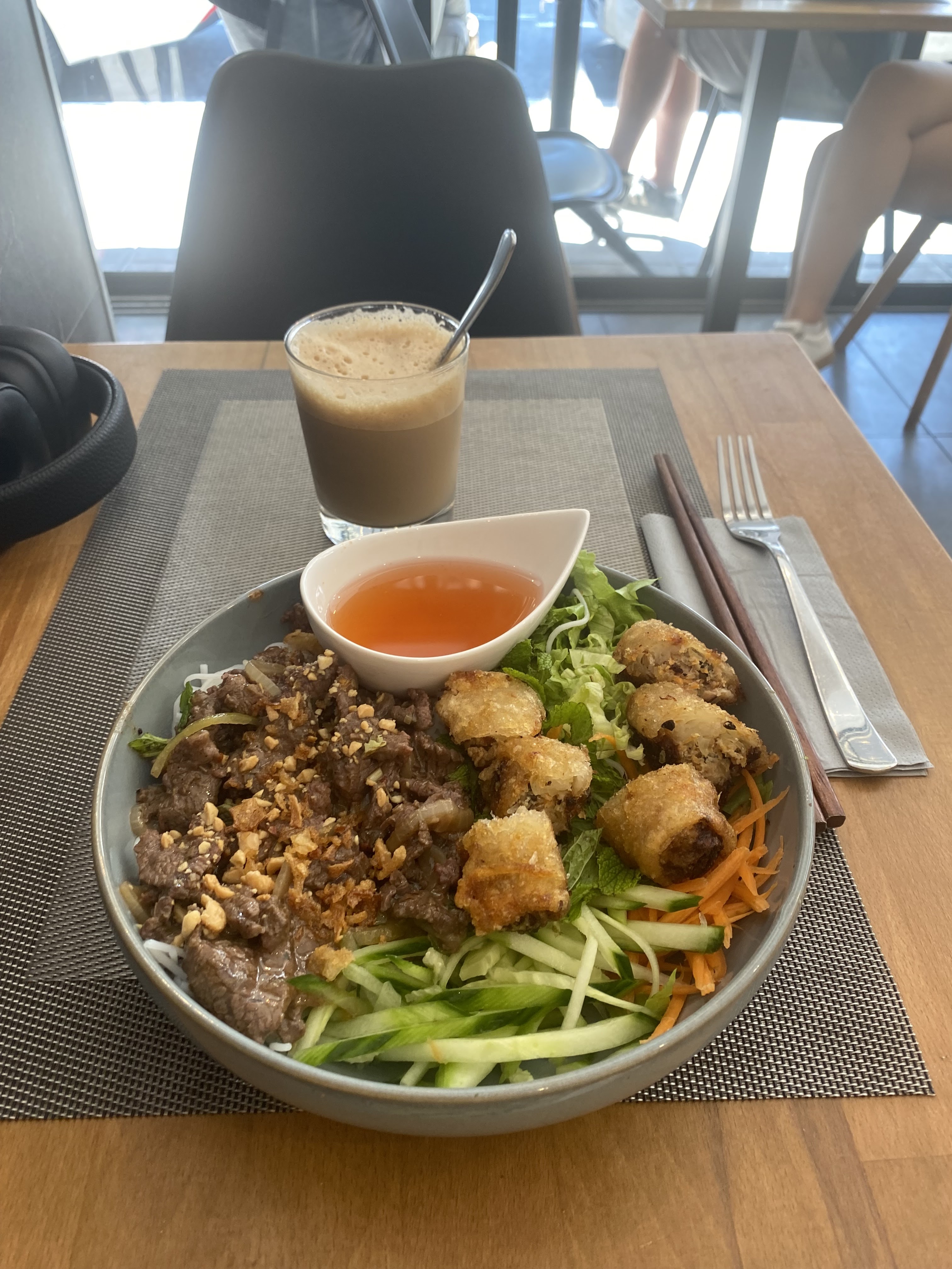 Parfait petit endroit authentique, nourriture excellente et excellent service. Le Boef bo bun nem (salade de bœuf et rouleau de printemps) est parfait.