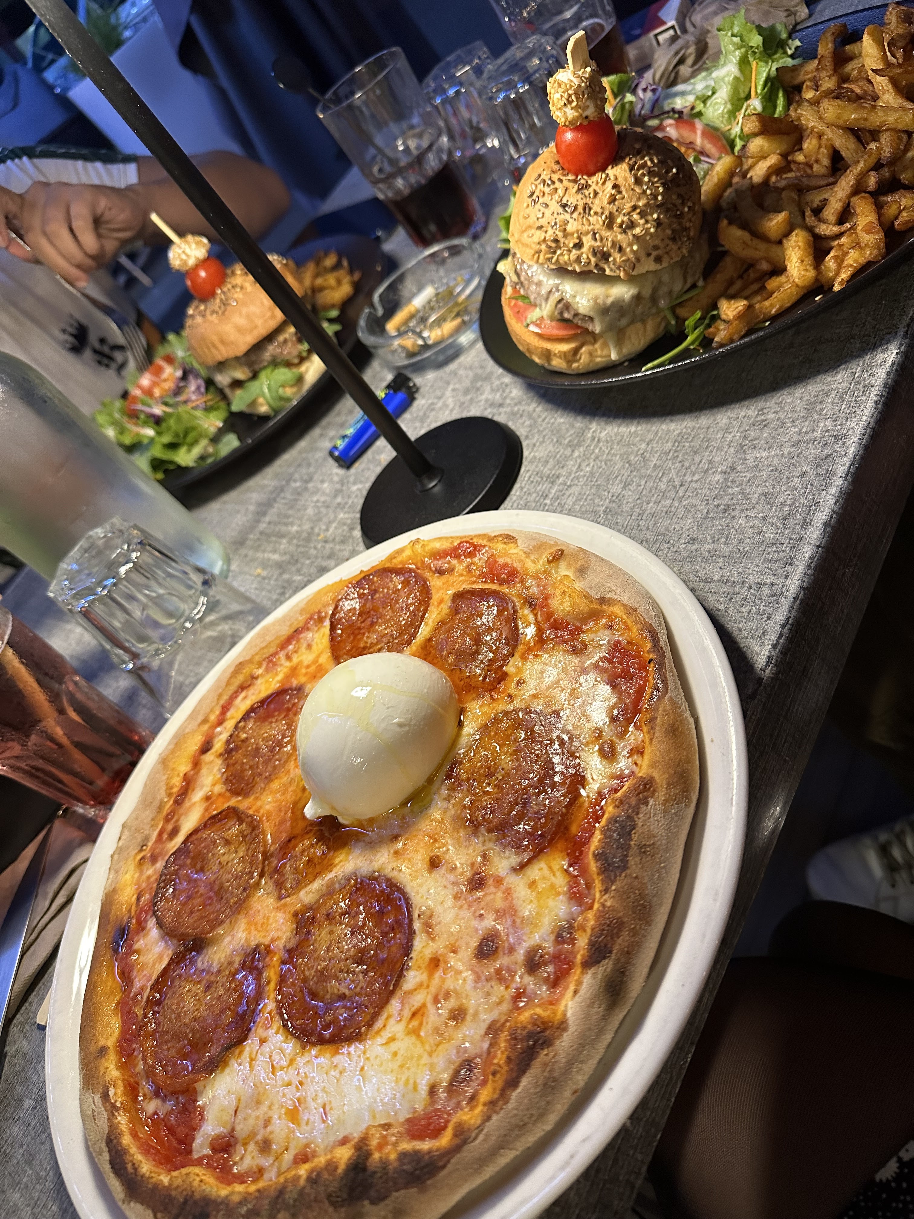 Nous avons commander des burgers et une pizza. l'un de mes amis a été déçu du Burger demander saignant qui au final ne l’étais pas donc renvoyer pour recevoir un autre Burger non saignant. malheureusement il n’a pas osé le redire, car il a vus le personnels de cuisine souffler quand il a renvoyer son plat.. du coup il a été déçu de son repas. Pour la pizza elle était assez bonne mais beaucoup trop d’huile.. ce qui fait que c’était vraiment pas agréable et évident pour manger… de plus malheureusement j’ai été malade juste après… Sinon serveuse vraiment agréable et sympathique.
