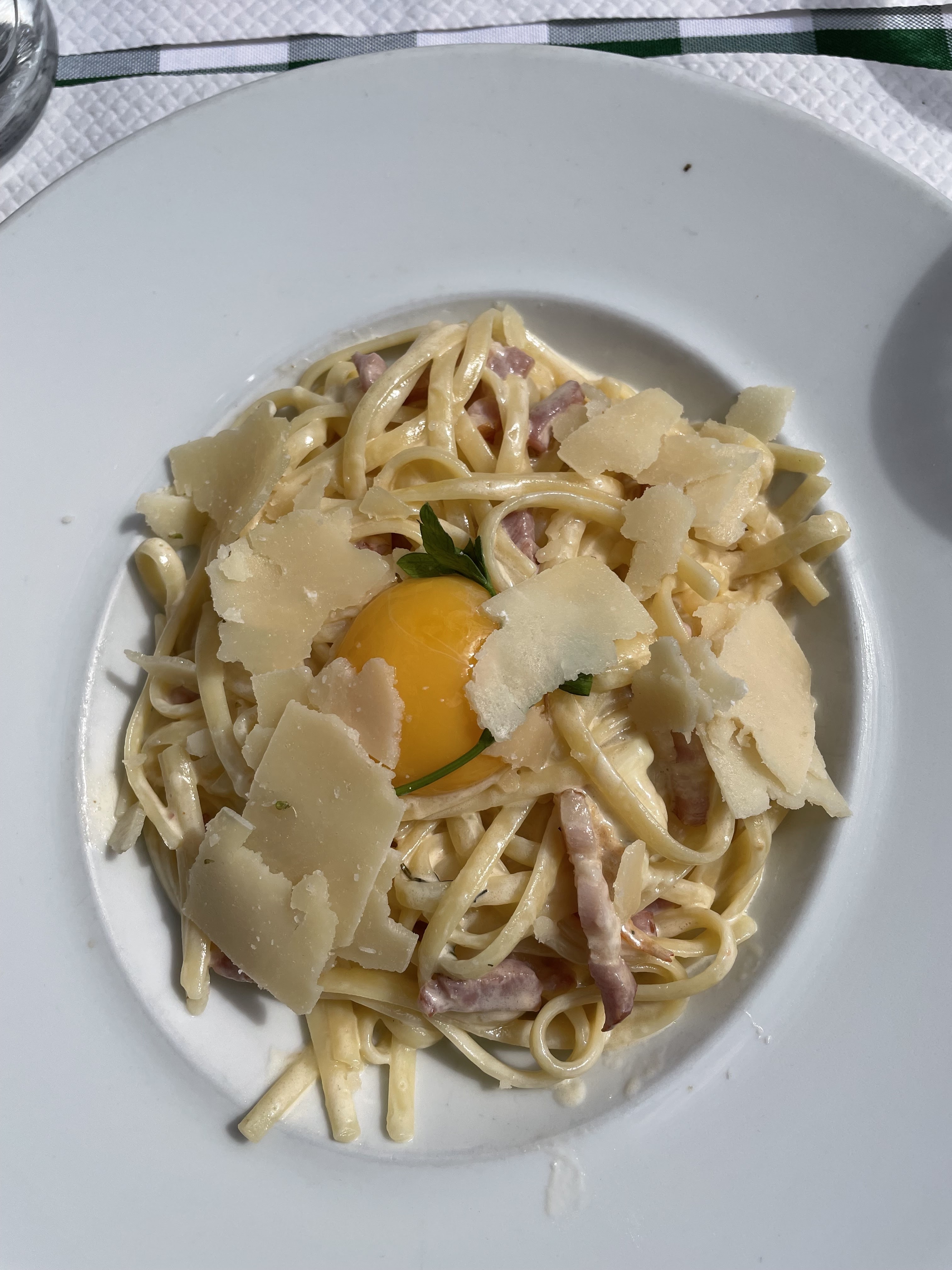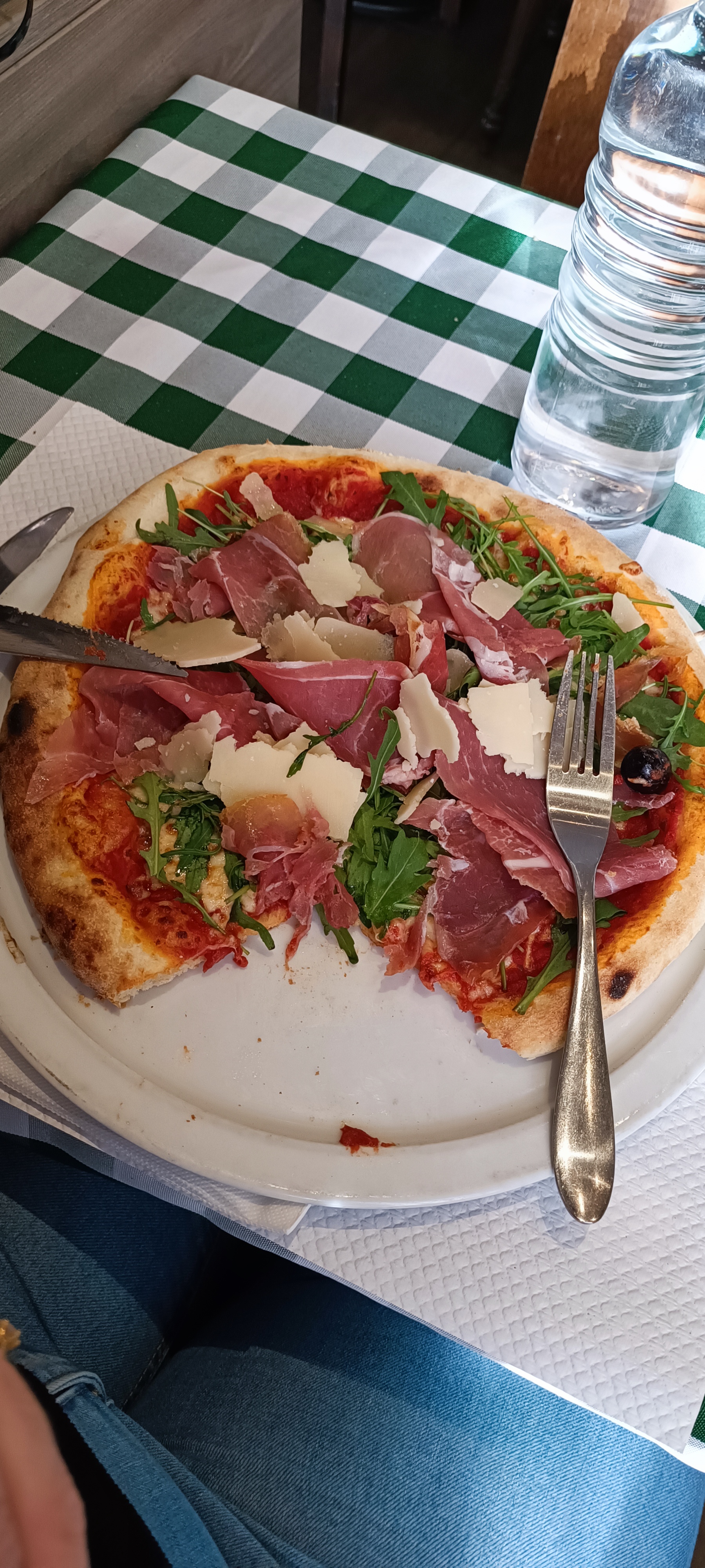 Je suis adepte inconditionnelle des bons restaurants italiens. Je ne publierai pas la pizza parma (déjà nombreuses photos).excellente. Les pâtes carbonara classiques mais très bien servies (boîte a emporter pour petit appétit ok). Mon commentaire pour souligner en très positif a la carte des vins l'excellent Montepulciano (mon favoris) En léger négatif la présence du mari de la patronne ? Très présent et expressif - comme a la maison ! A laisser a la maison si possible