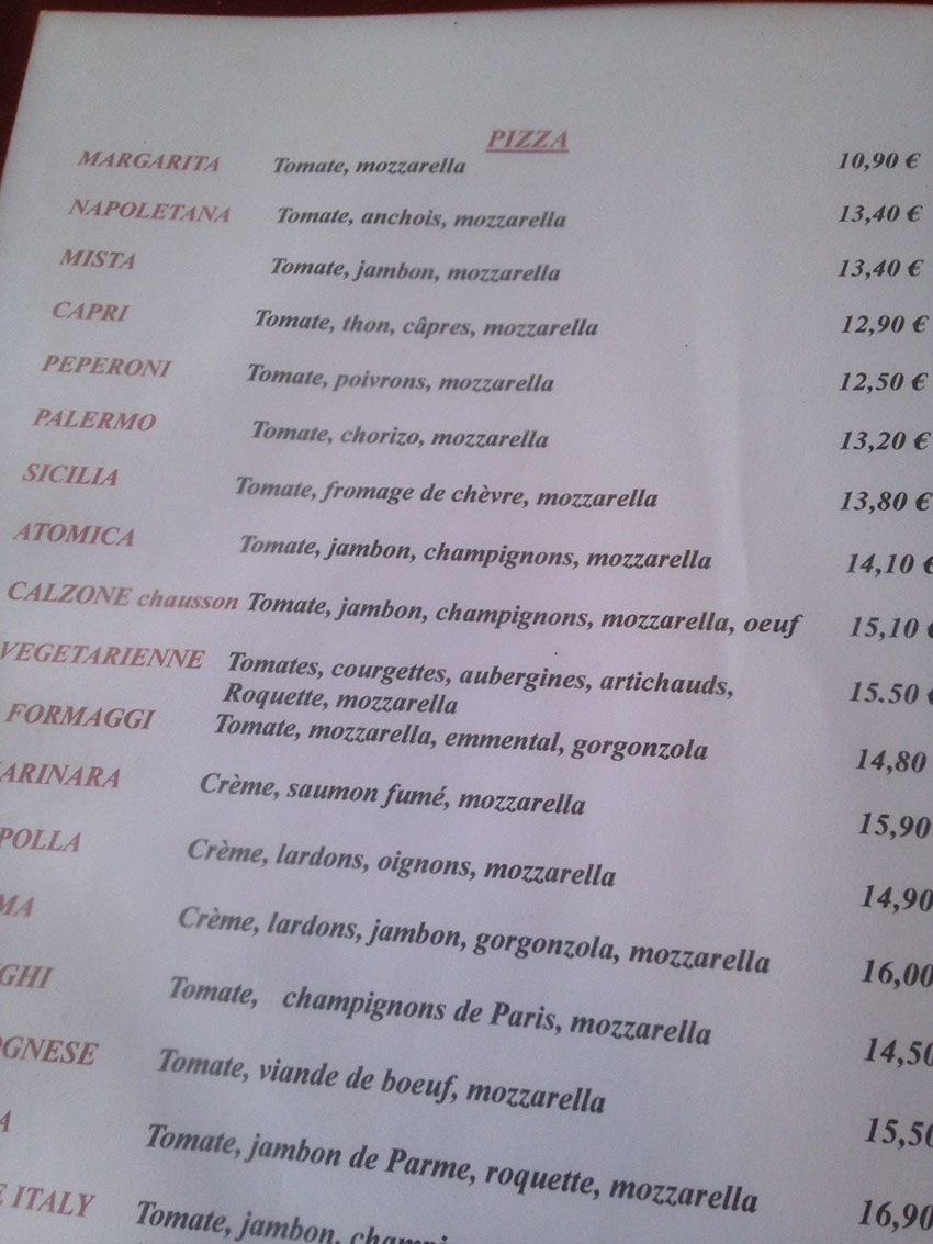 Prix : trop cher pour la qualité. Pizza passable, pas à la hauteur pour un restaurant italien. Le cadre, parcontre, est sympathique.
