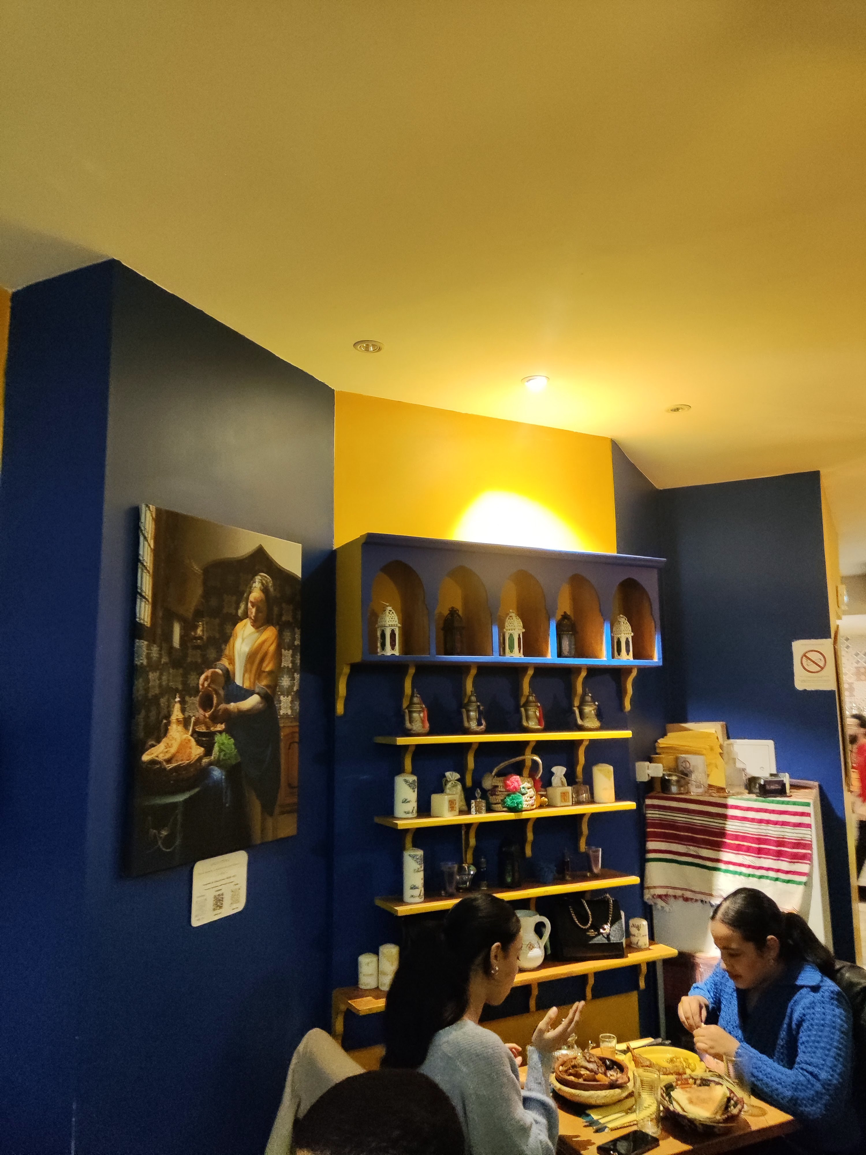 Petit restaurant charmant situé non loin de la mairie du 18ème. Les plats proposés sont authentiquement marocains, avec des classiques tels que la pastilla, la h'rira et d'autres tagines. L'accueil à l'arrivée est doux et sympathique. L'expérience de réservation via Instagram était également très agréable. On m'a proposé de pré-réserver le plat du jour (rfissa) et la confirmation de la table s'est faite très facilement. Point d'amélioration selon moi : Je vais être un peu difficile, mais la h'rira manquait cruellement de goût, confirmé par l'ensemble des convives. Sans être mauvaise, elle était fade, au point que je ne l'ai tout bonnement pas terminée. Le service était un peu étourdi (pas de pain à l'arrivée de nos plats, relance pour la théière), mais cela peut s'entendre, car le restaurant était complet dès 20h, et les deux serveurs faisaient ce qu'ils pouvaient. Pour le reste, la loubia était excellente, et mes amis ont apprécié leurs plats respectifs. Dommage qu'il n'y avait plus de bricks. La pâtisserie était bonne, mais rien de décadent. Bien que nous étions un peu éloignés de la porte, nous ressentions le froid (forcément, il faisait -1°C). J'ai eu l'impression de voir un rideau d'air chaud au-dessus de la porte ; cela aurait été top de l'enclencher. La déco était très cool, avec des reprises de tableaux hollandais à la sauce marocaine.