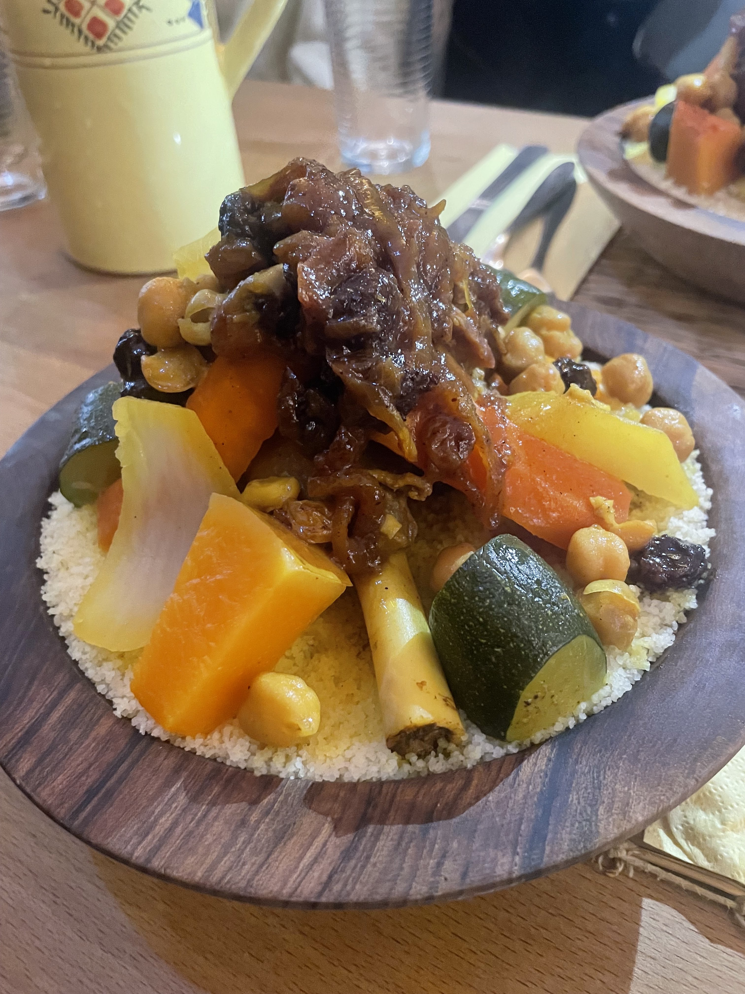 Bon goût de la nourriture !!! C'est un endroit un peu cosy, alors assurez-vous de réserver à l'avance ! Ils ont normalement 2 services le soir. Nous avions beaucoup de nourriture à partager et toute la viande de tajine et donc bien réservé et sans os ! Les sauces sont super riches et savoureuses ! Les couscous sont bons et ils vous donnent de la soupe au cas où elle serait trop sèche. J’ai particulièrement aimé le thé à la menthe car il n’est pas trop sucré comme avant. J'ai entendu dire qu'ils avaient aussi des desserts incroyables, mais nous ne pouvions pas manger plus. Dans l'ensemble, c'est un excellent endroit ! Je reviendrais certainement