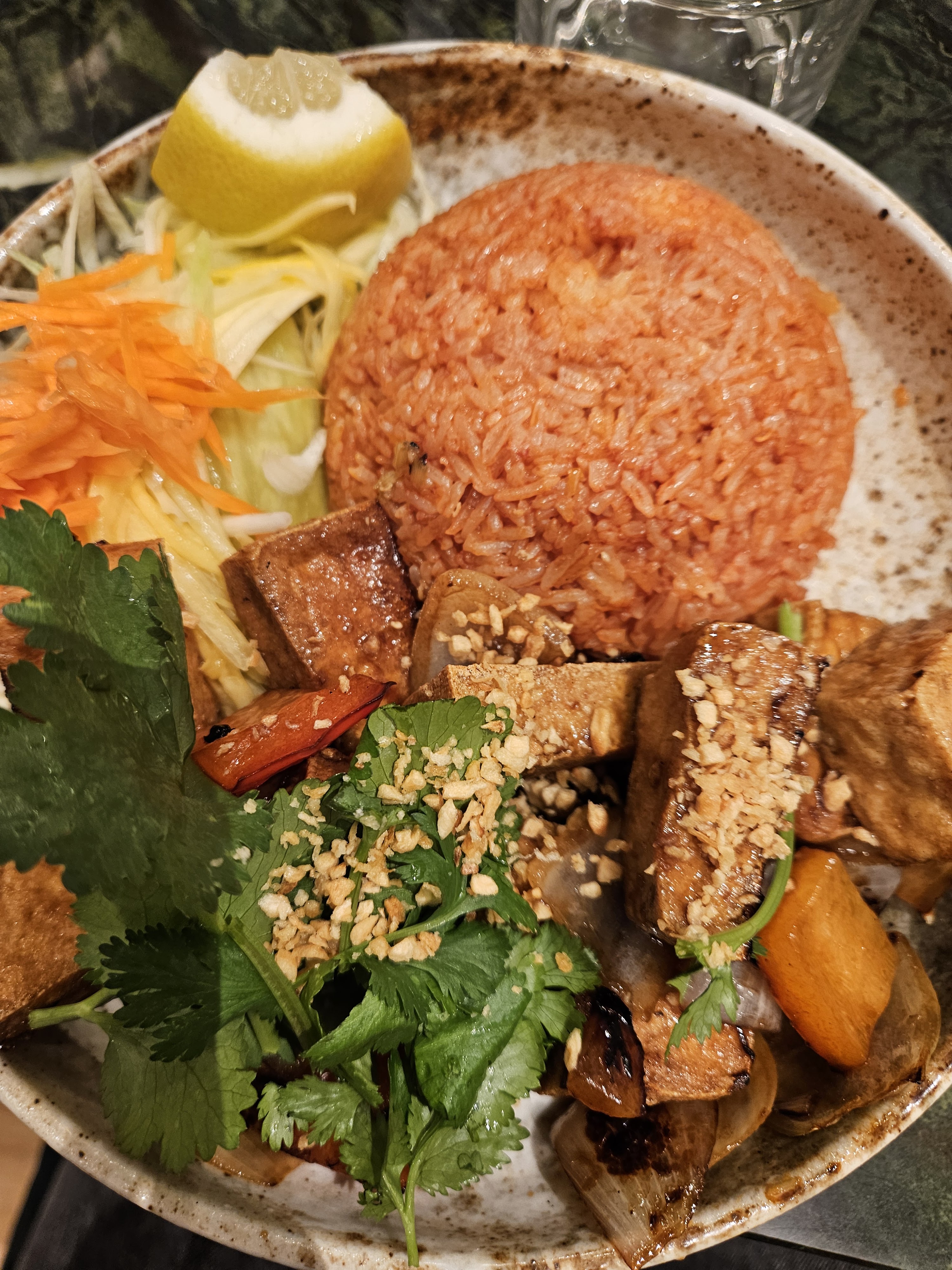 Personnel très gentil et possibilité d’avoir des options végétariennes en plus (loc lac vegan avec du tofu à la place du boeuf). Par contre cela reste un peu cher, 15.90e pour le loc lac. Le plat était plutôt bon.