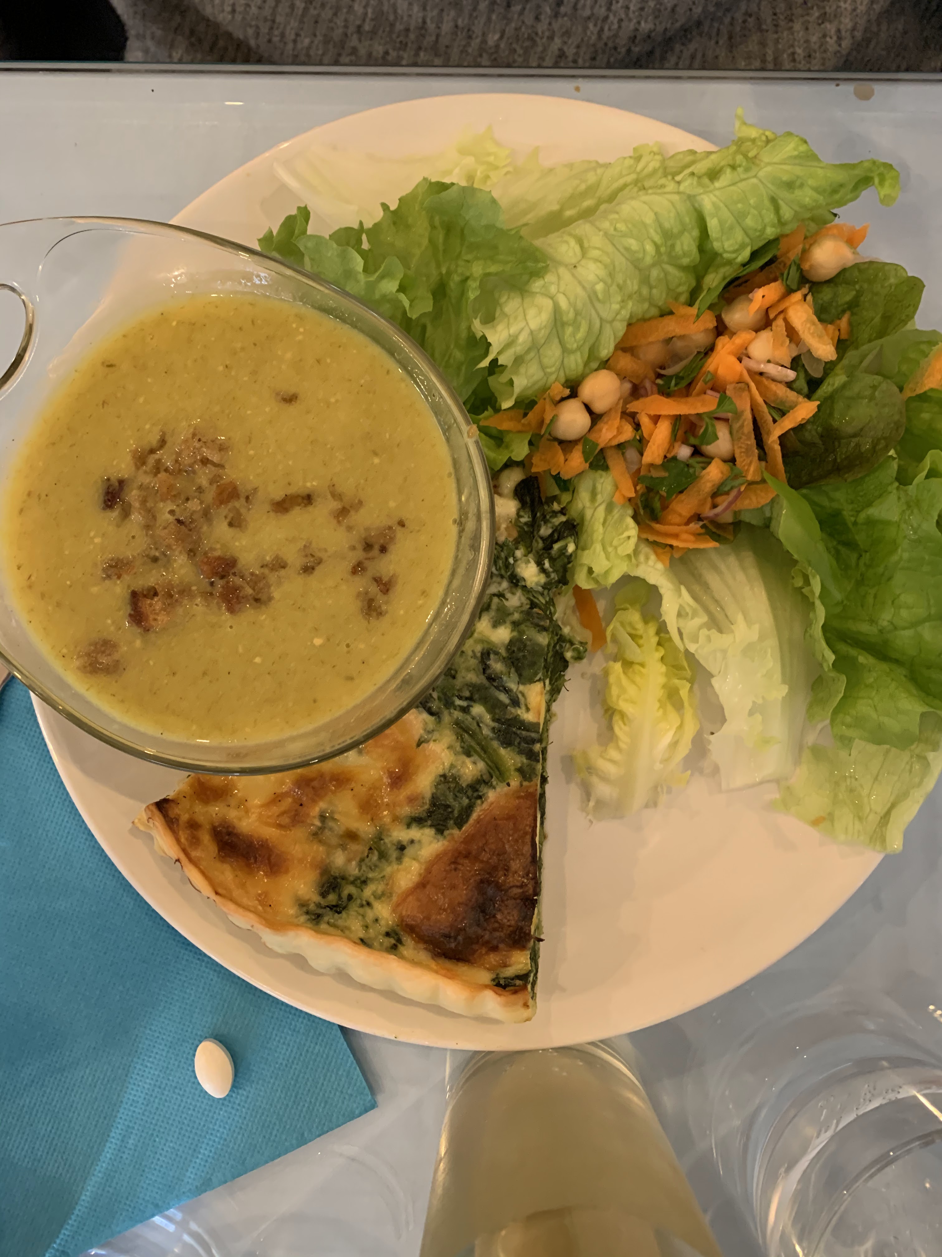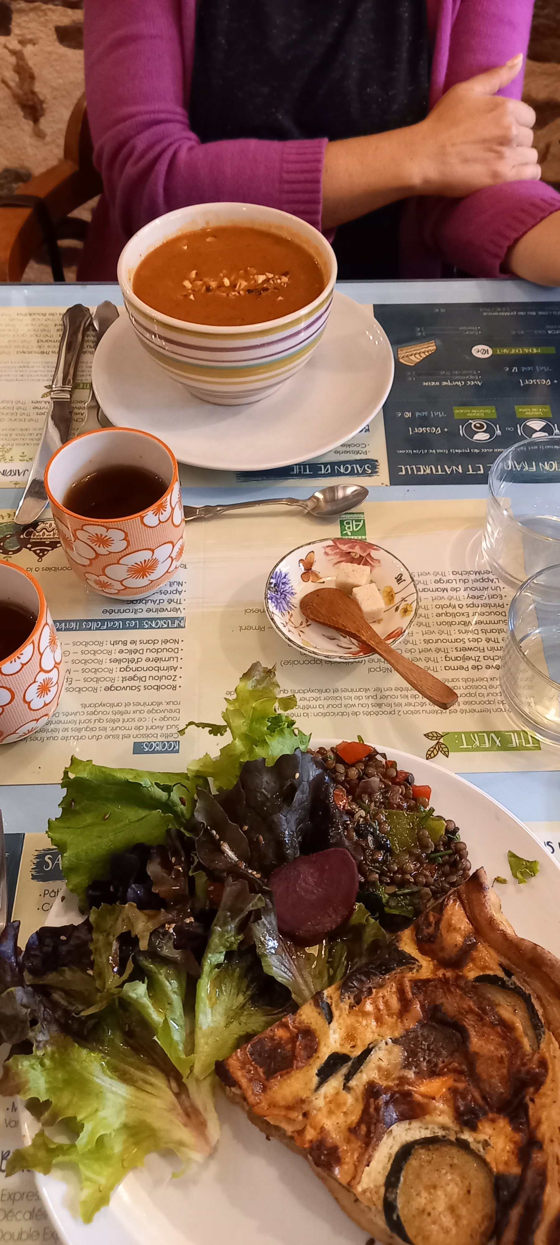 Très bonne adresse, c'est copieux et très bon pour le déjeuner. Sur la photo, soupe navet, miel et noisettes. Salade composée et quiche aux épinards... 👍👍👍