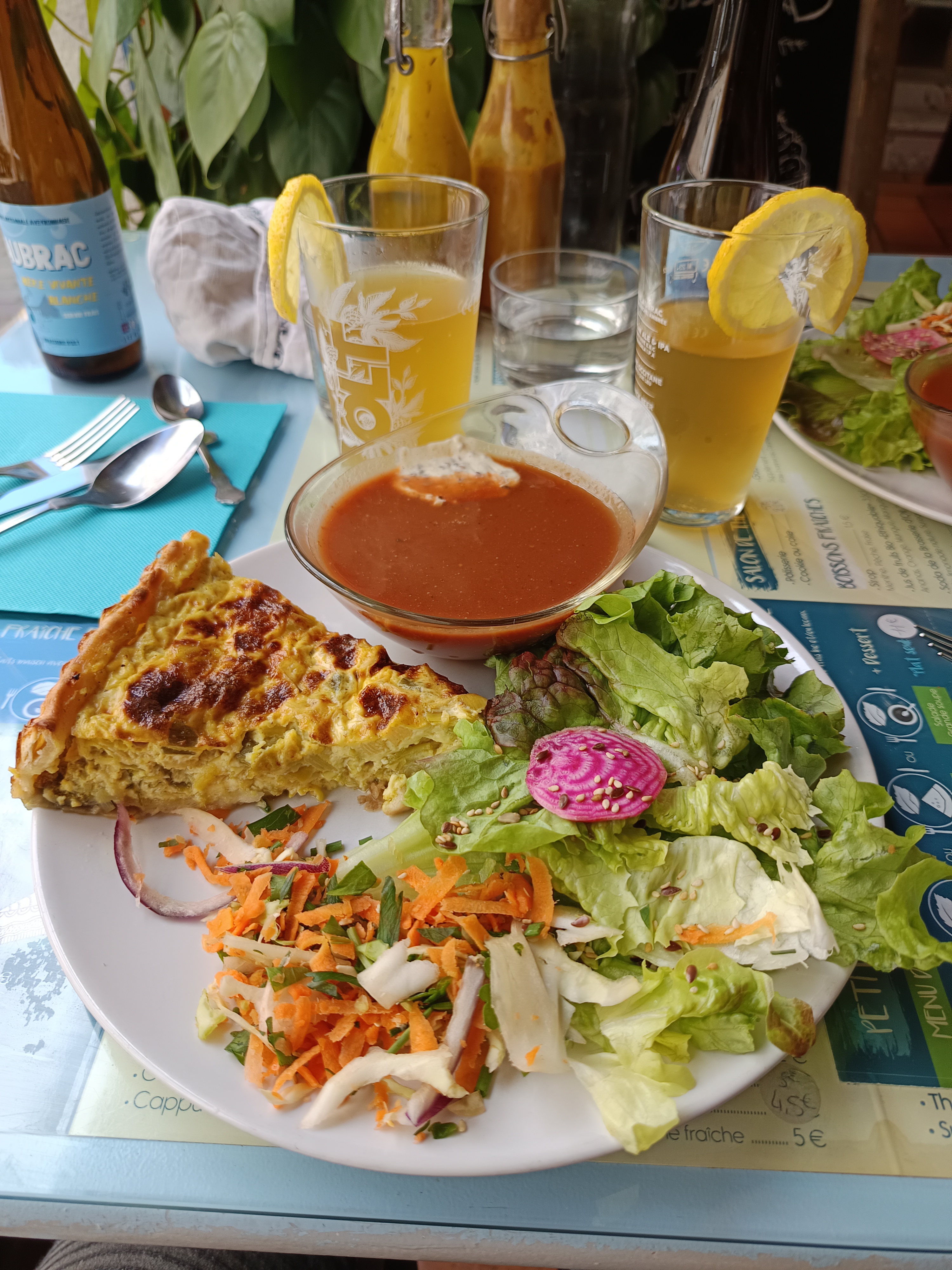 Déjeuner en terrasse, jolie vue sur les maisons en colombage, dans une petite rue tranquille, sans voiture. Plat composé d'une salade, tarte et soupe froide : un régal sans compter le service efficace en sourire 😇