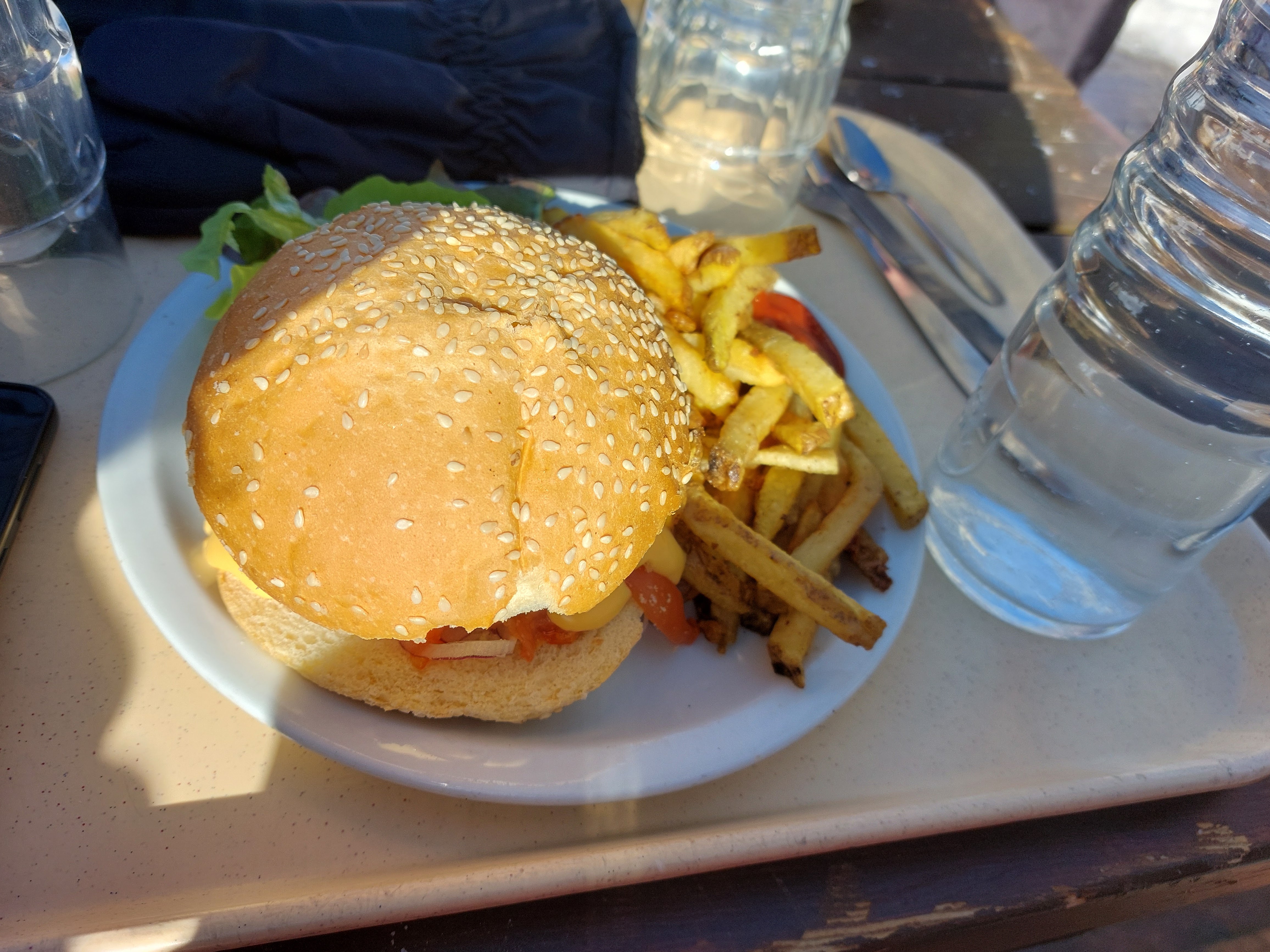 La vue ici est magnifique et vous pouvez également profiter du soleil. Nous avons mangé dans la partie restaurant mais il y a aussi des plats à emporter. Les repas ne sont pas bon marché mais ils sont très bons. J'ai commandé le repas soli burger et vous obtenez beaucoup de nourriture (beaucoup de salade, des frites/chips et un gros hamburger). Le goût de tout le repas, en particulier du hamburger, était également excellent