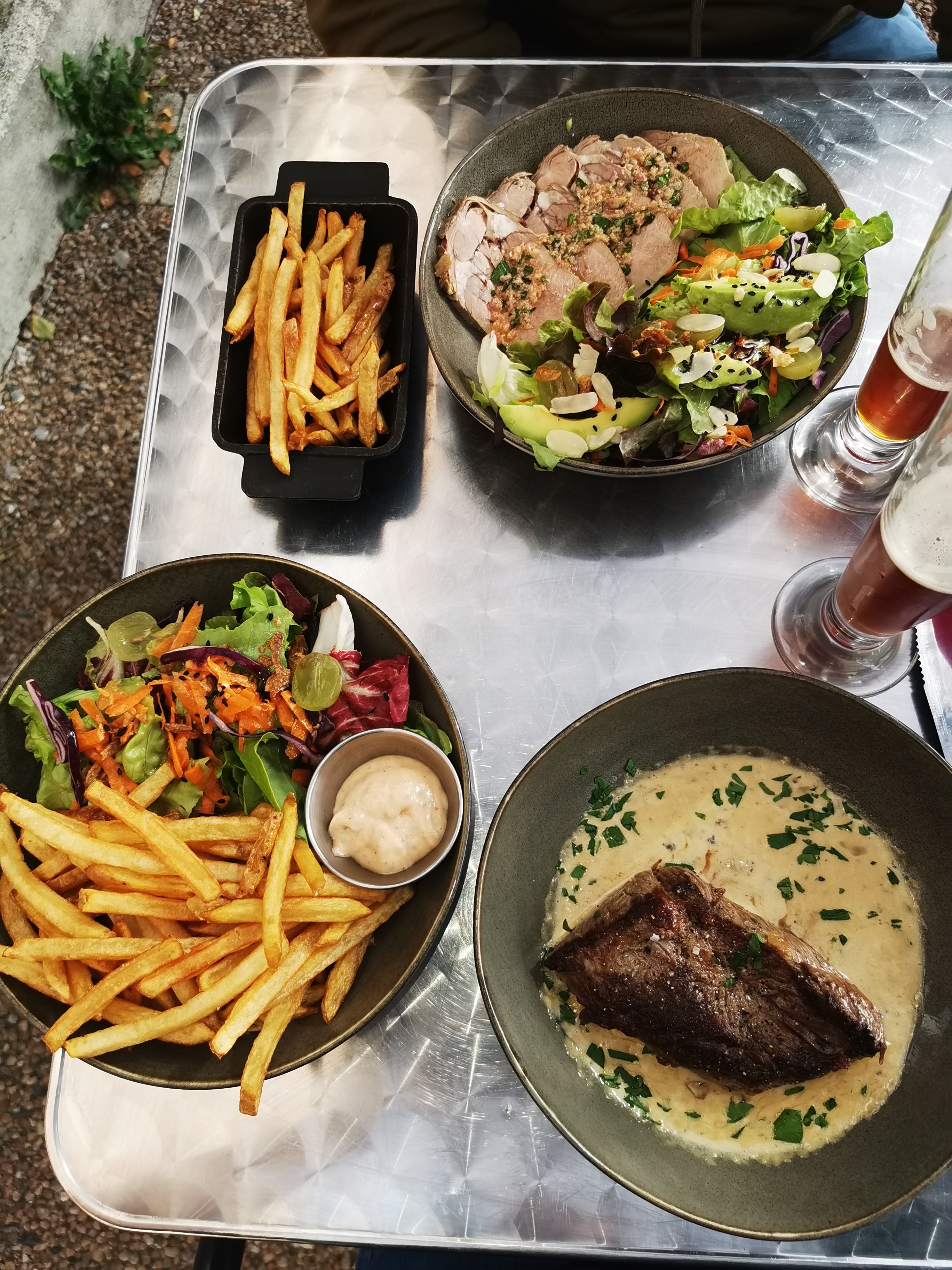 Franchement déplorable.Steak du burger cru et froid,salade moitié flétrie.Frites trop cuites et pas digestes du tout avec pelures de pommes de terre dedans sous concept antigaspi. Suprême de volaille jaune fluo. Vaisselle sale. Pas de sel et poivre a table. Pas de cendrier . L'eau et la bière avaient un sale goût. Et le final...cuistot qui passe un coup de fil devant nous a la fin du repas en crachant par terre. La totale!