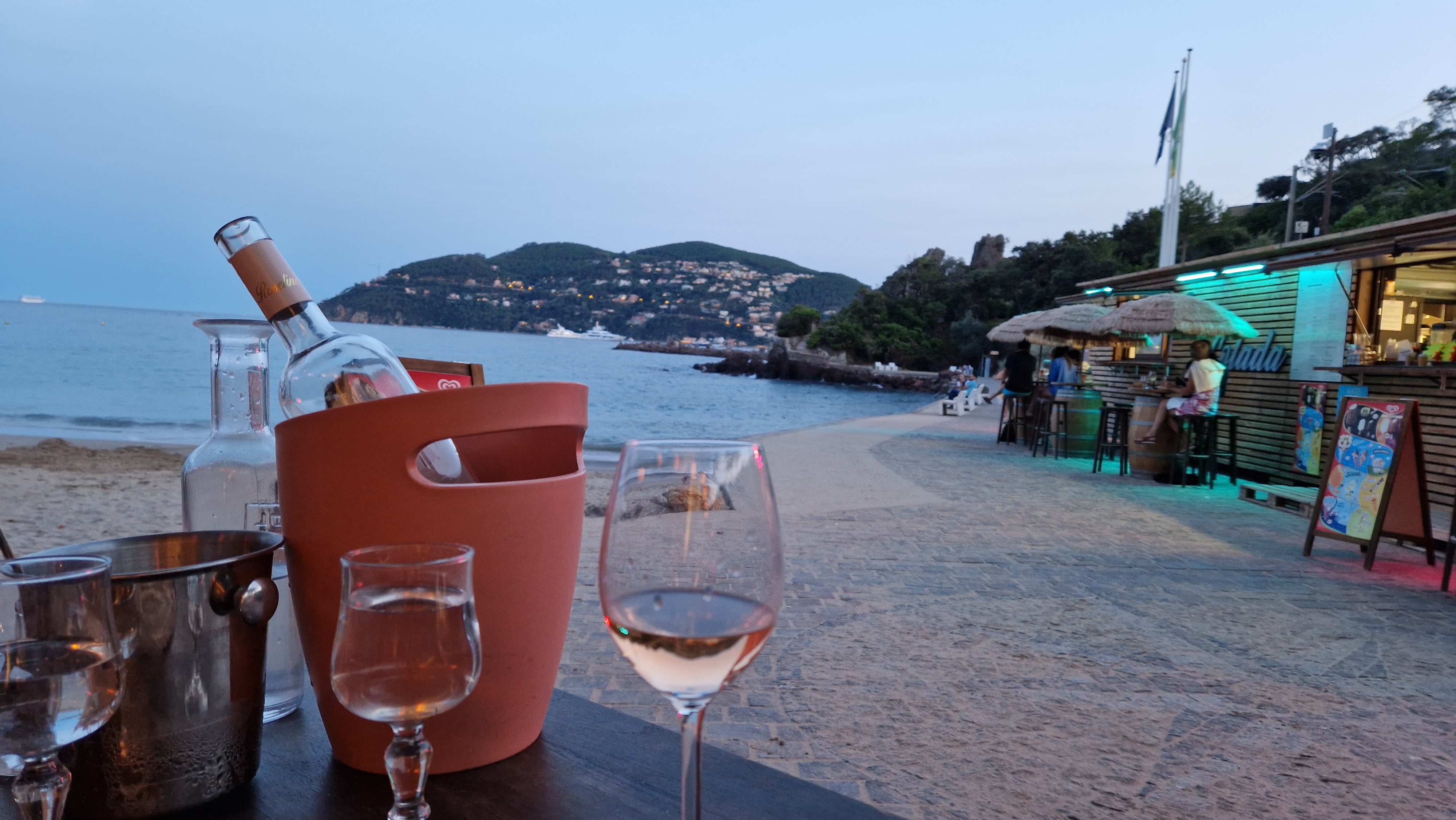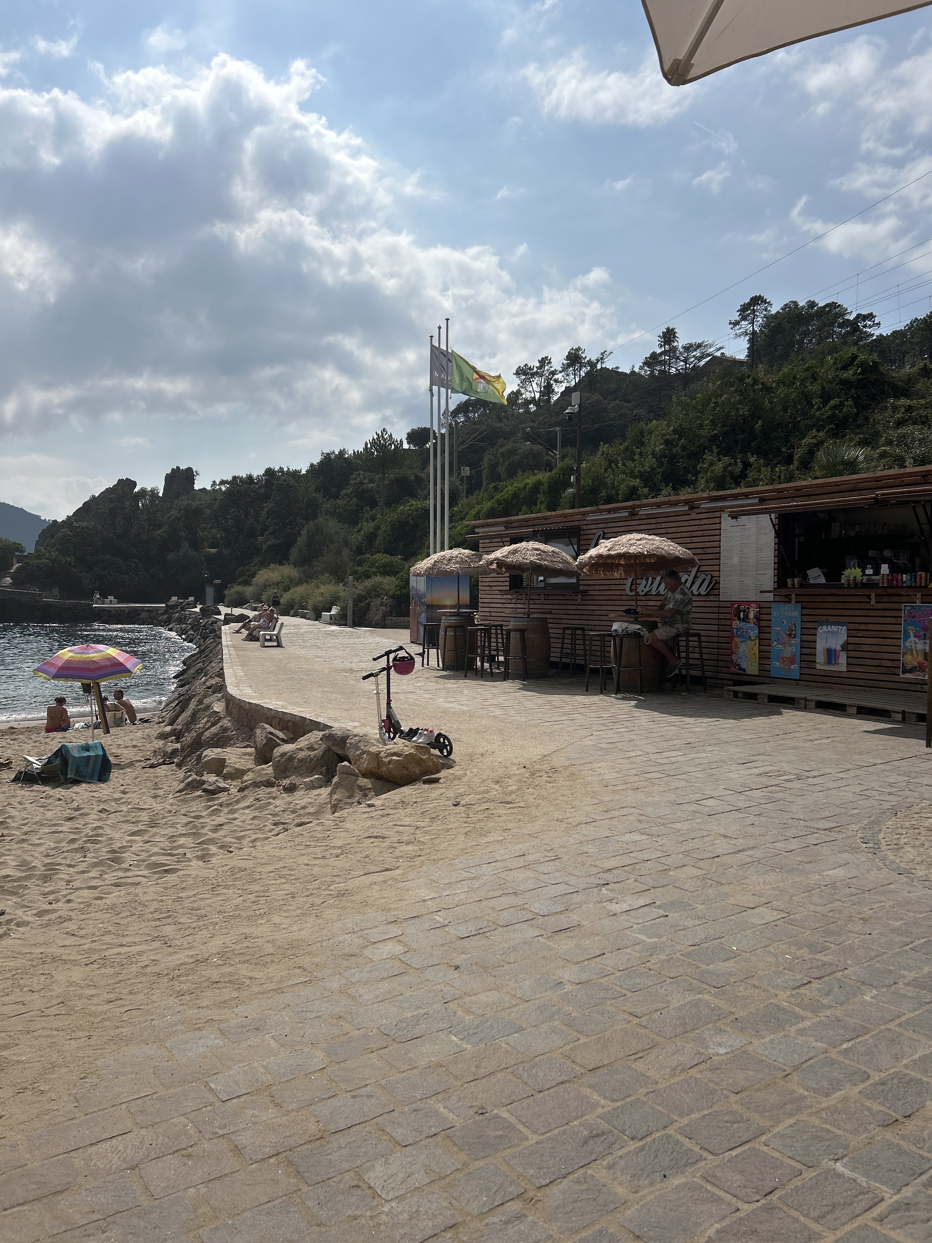 Grand kiosque de plage, derrière le château de La Napoule, avec une partie restaurant sur une petite terrasse charmante à proximité. Emplacement idyllique sur la plage de la Raguette. Personnel aimable. Pas trop d'attente en fin de saison estivale. Cuisine snack améliorée avec plats en suggestions du jour. Un effort est fait sur la présentation des plats malgré des moyens limités. Dans l'ensemble, nous n'avons pas été déçus. Carte des vins succincte mais la bouteille de rosé était honnête. La pièce du boucher était savoureuse, le magret de canard un peu moins mais la sauce au miel en accompagnement était bonne. Les desserts auraient pu être un peu plus froids. Malgré tout, un rapport qualité prix tout à fait convenable et qui plus est pour tous les budgets, avec de surcroît un cadre magnifique... Et la pleine lune du 31 août qui illuminait le ciel azuréen !