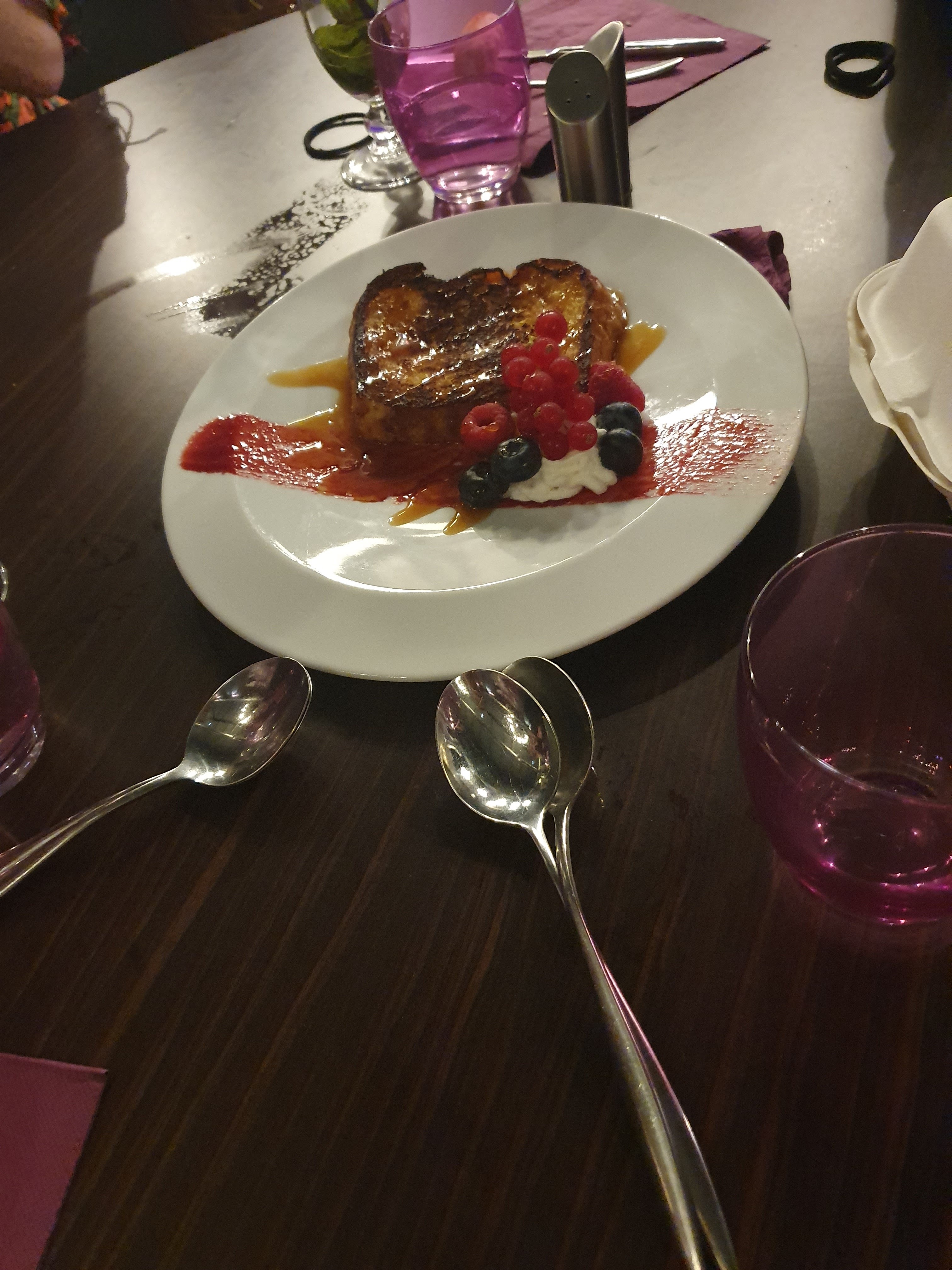 Vraiment de très basse qualité au regard du prix : - magret de canard encore congelé à cœur, revenu trop cuit; - boeuf Wellington : viande dur et le feuilleté industriel ; - burger : avec l’ajout de la galette de pomme de terre dans le pain vraiment trop lourd. Nous nous sommes pas risqués pour le dessert!