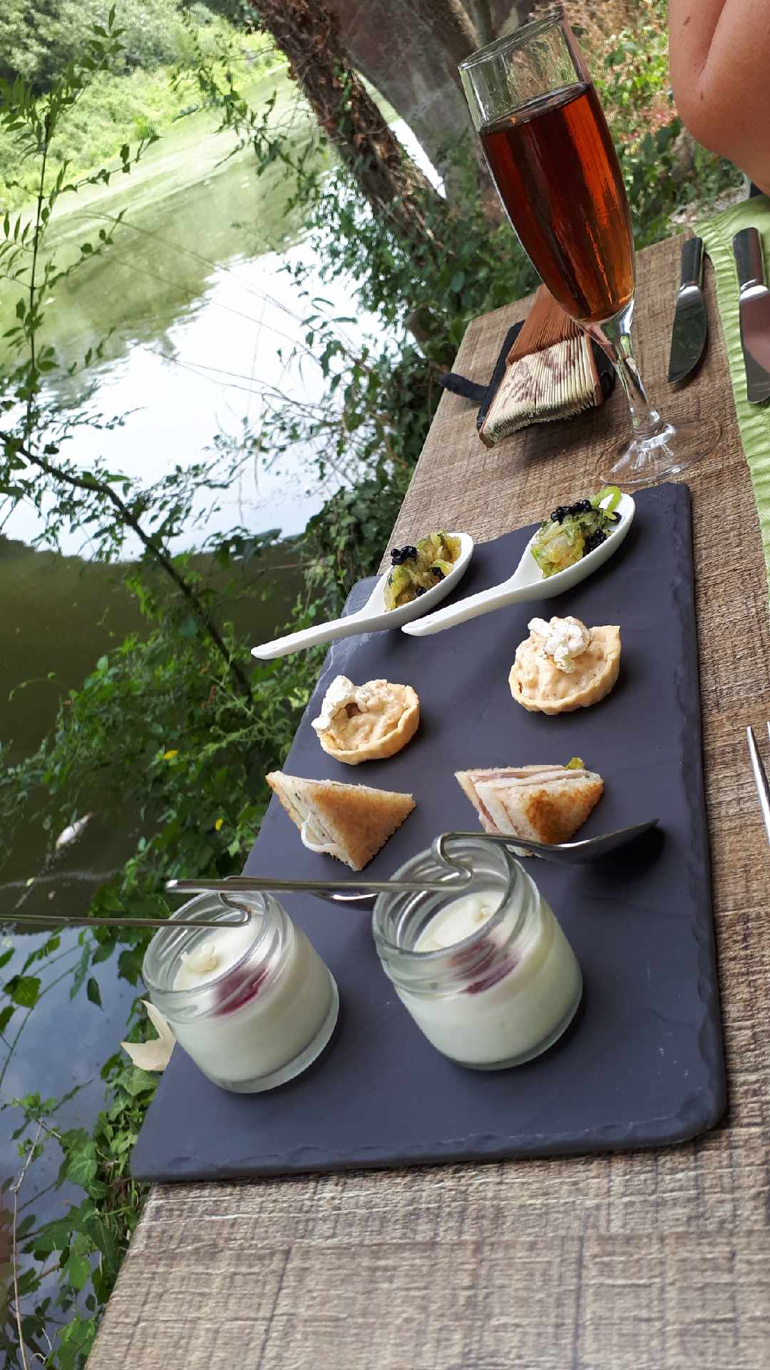 Tres joli coin plein de charme en bord de rivière. Le repas en terrasse au coucher du soleil est un enchantement. De surprice en decouvertes ce repas est une douceur qui nous conduit dans la nuit. Tres agreables moments plein de surprises et delicatesses.Bravo et merci.
