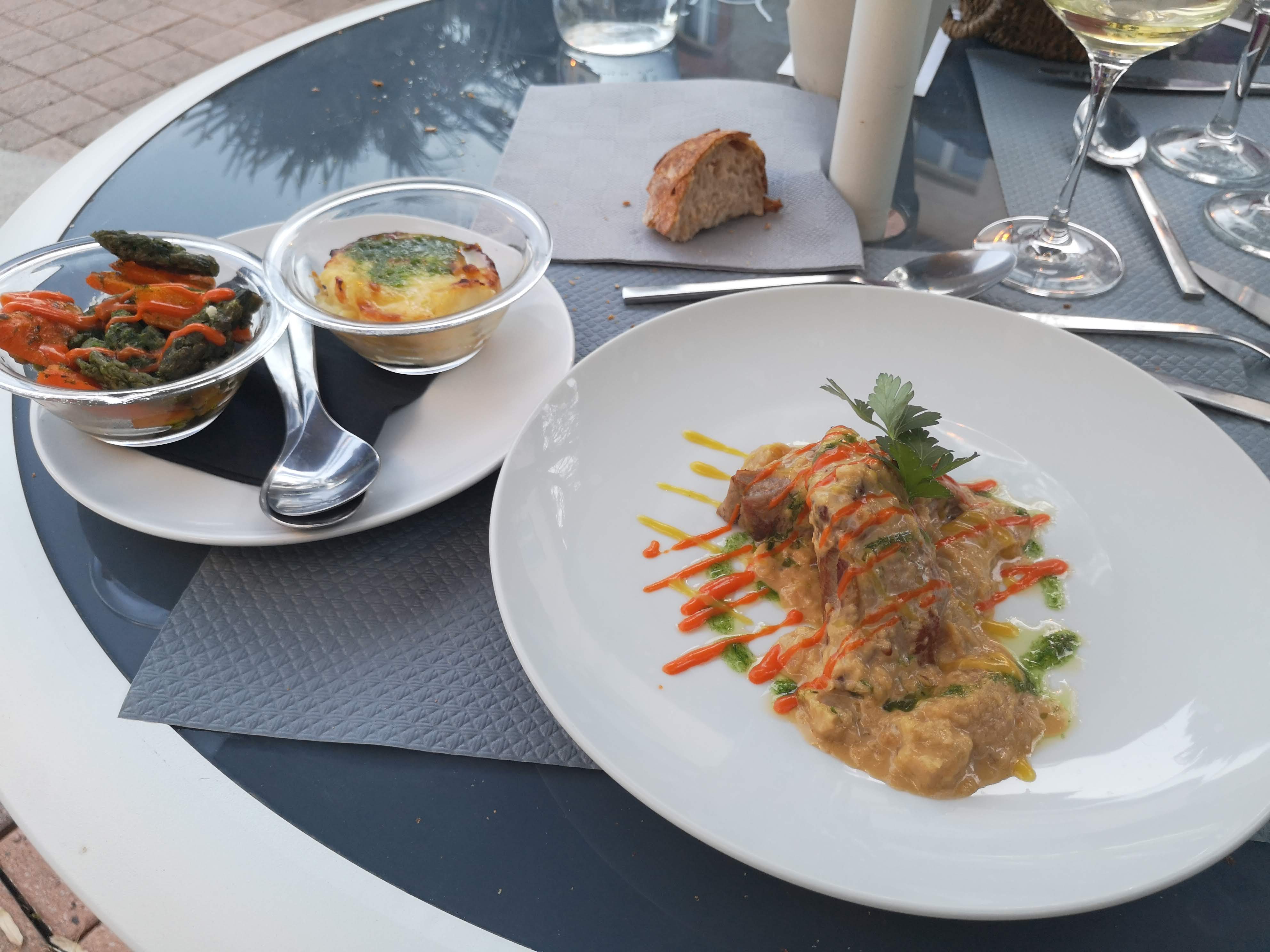 Le cadre est beau. Il est vrai que le dommage est que vous êtes au bord de la route. Mais il y a l ombrage et la verdure. Le repas a été plus que correct. Juste les plats chauds sont arrivés très tiède. Mais vous m avez entendu. L entrée bonne et dessert copieux.