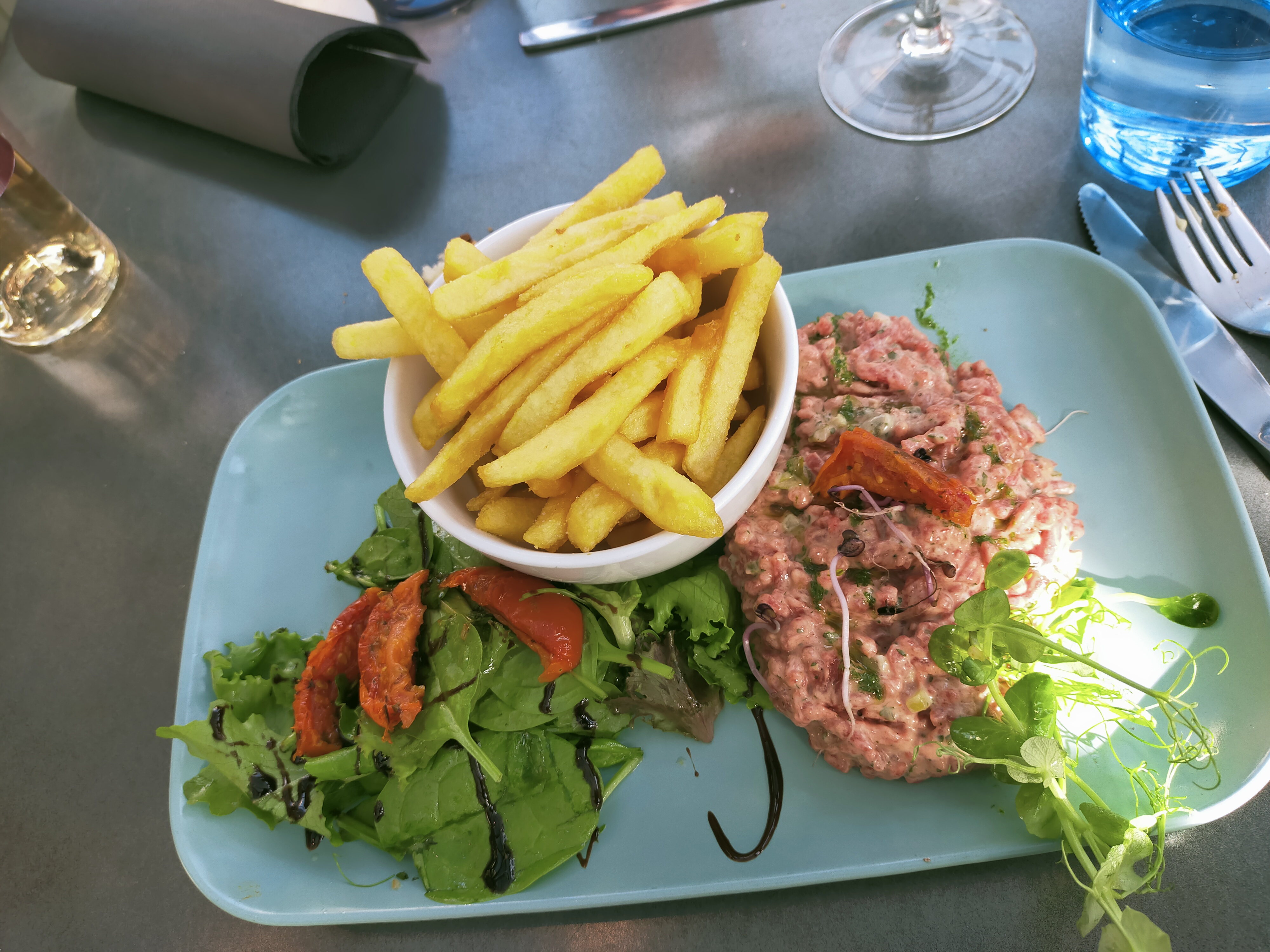 Restaurant ce midi. Des bonnes choses : salle agréable, présentation des plats irréprochable, qualité de la viande, des moules, des desserts. Des choses qui nous laissent sur notre faim : grosses frites n’ayant rien de frites maison, des mesures Covid moyennement prises en compte (distance entre les tables si faible que nous ne pouvions pas passer entre, masque de la serveuse en permanence sur le menton et serviette éponge au lavabo des WC), propreté des vitres (en ce dimanche midi, les vitres à côté de nous sont vraiment sales). Donc plutôt satisfait du repas mais rien d’exceptionnel.