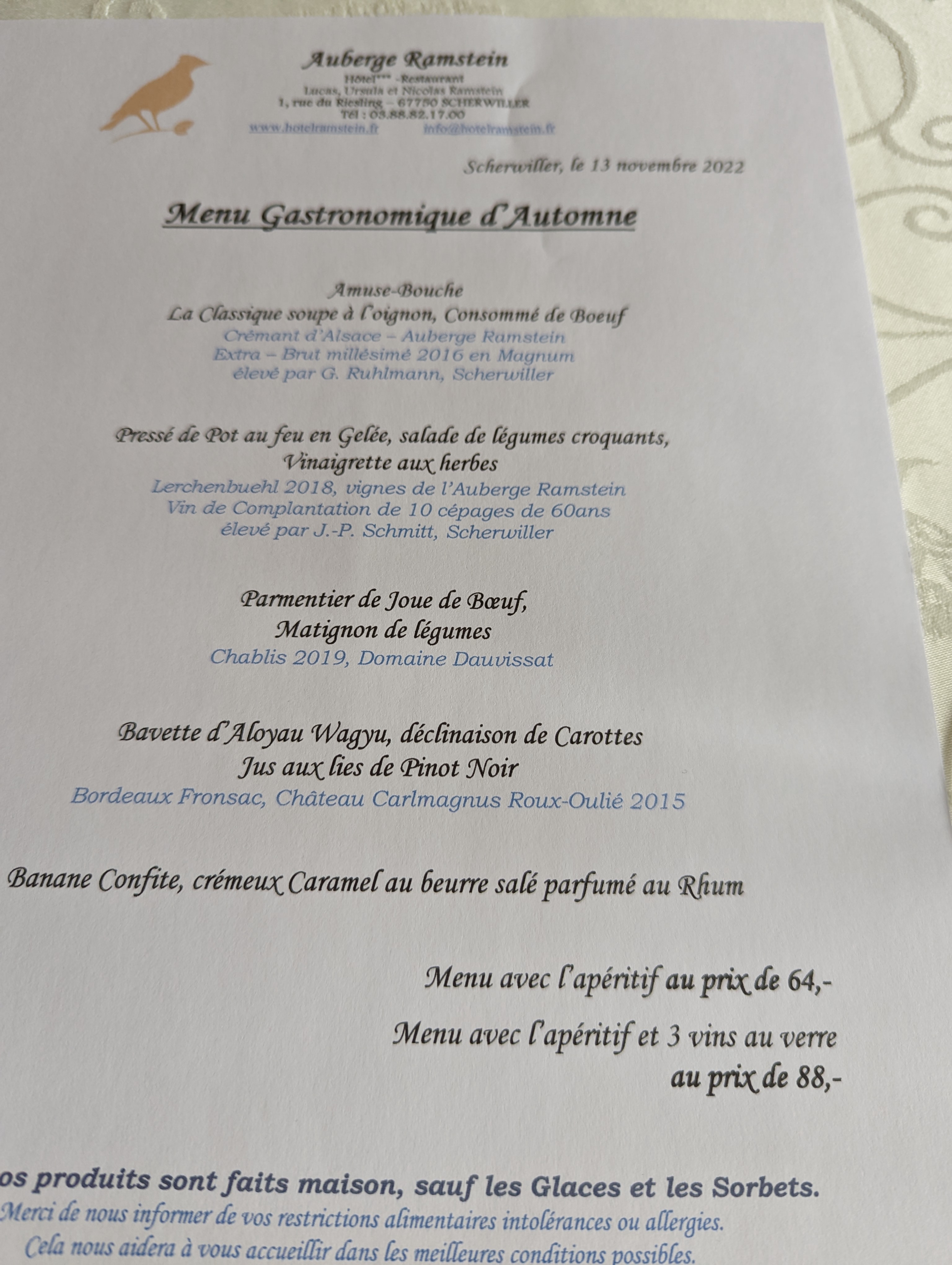 L'hôtel nous a particulièrement gâtés lors de notre court séjour avec sa cuisine exceptionnellement brillante. Le menu de 4 plats a été brillamment concocté. Chaque plat est parfaitement préparé, finement équilibré et constitue une petite œuvre d'art culinaire à part entière. Cuisiné avec passion. La situation de l'hôtel au pied des Vosges et au centre entre Colmar et Strasbourg, au milieu des villes alsaciennes caractéristiques et des destinations d'excursion, ouvre de nombreuses possibilités d'excursions. Nous avons vraiment apprécié notre séjour entre amis et aimerions revenir.