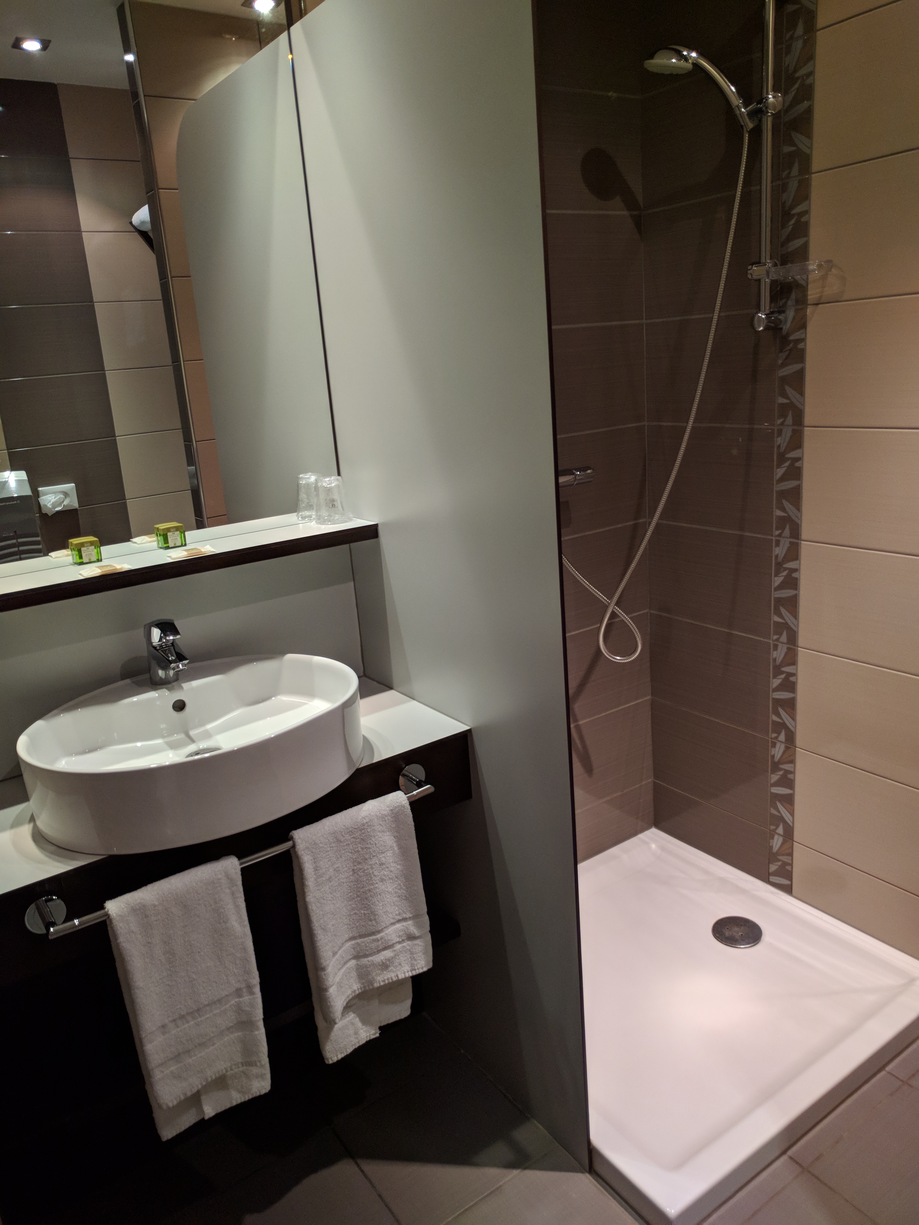 Bon accueil. Propre. Salle de douche bien conçue. Chambre un peu juste en taille car avec les bagages ça investit vite l espace pour une nuit ça va. Petit déjeuner avec du choix.