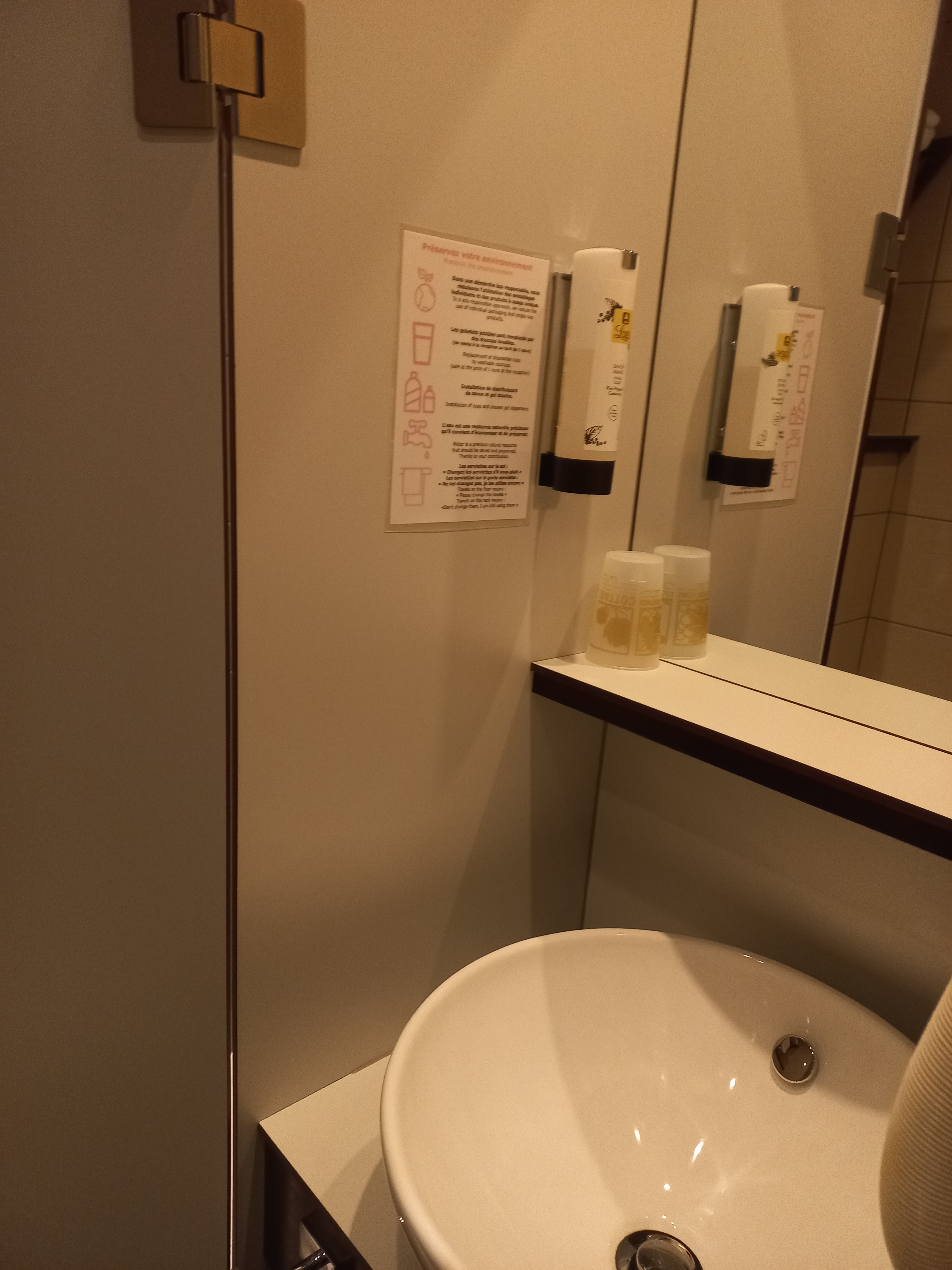 Hôtel accessible avec un grand parking qui reste ouvert toute la nuit. Pour la réception, un code vous sera fourni pour que vous puissez rentrer dans votre chambre sans problème. La réception est ouverte à de grands horaires je trouve et peut vous dépanner si comme mon compagnon, vous avez oublié votre brosse à dents (comptez 2.50 euros le kit dentaire avec brosse et dentifrice). Les chambres standard, voir les photos sont classiques et parfaites pour une nuit. Un placard avec des cintres, une télé, une bouteille d'eau est fournie ainsi que des petits bonbons. Literie correcte, propreté des draps... ça dépend. Je les trouvais un peu rêches. Clim réversible avec notice pour changer ou éteindre l'appareil, très bon point. J'ai éteint. Pensons à la planète. Seul bémol la salle d'eau. Déjà la porte de douche qui n'est pas une porte de douche... même en étant au fond on met de l'eau partout ! C'est pas pratique. Et côté wc, faut pas être trop gros (je suis obèse c'était limite!). Le savon/shampooing est fourni. Ainsi que deux gobelets recyclabes, qu'on peut acheter si on les aime je présume ? Serviettes ça va. Un peu petites je trouve mais ça va. C'était très calme, rien à signaler jusqu'à 7h où on entend les femmes de ménage parler nutrition u.u qu'elles parlent un peu moins fort y a des gens qui dorment... j'ai bien aimé le coin bureau, moins la prise assez loin du lit. Lumière ok mais y avait des toiles d'araignée dans des coins... 4/5 car c'est agréable dans l'ensemble. Des chambres sont accessibles pour les PMR. Les toilettes à côté de la réception sont propres 😌❤️