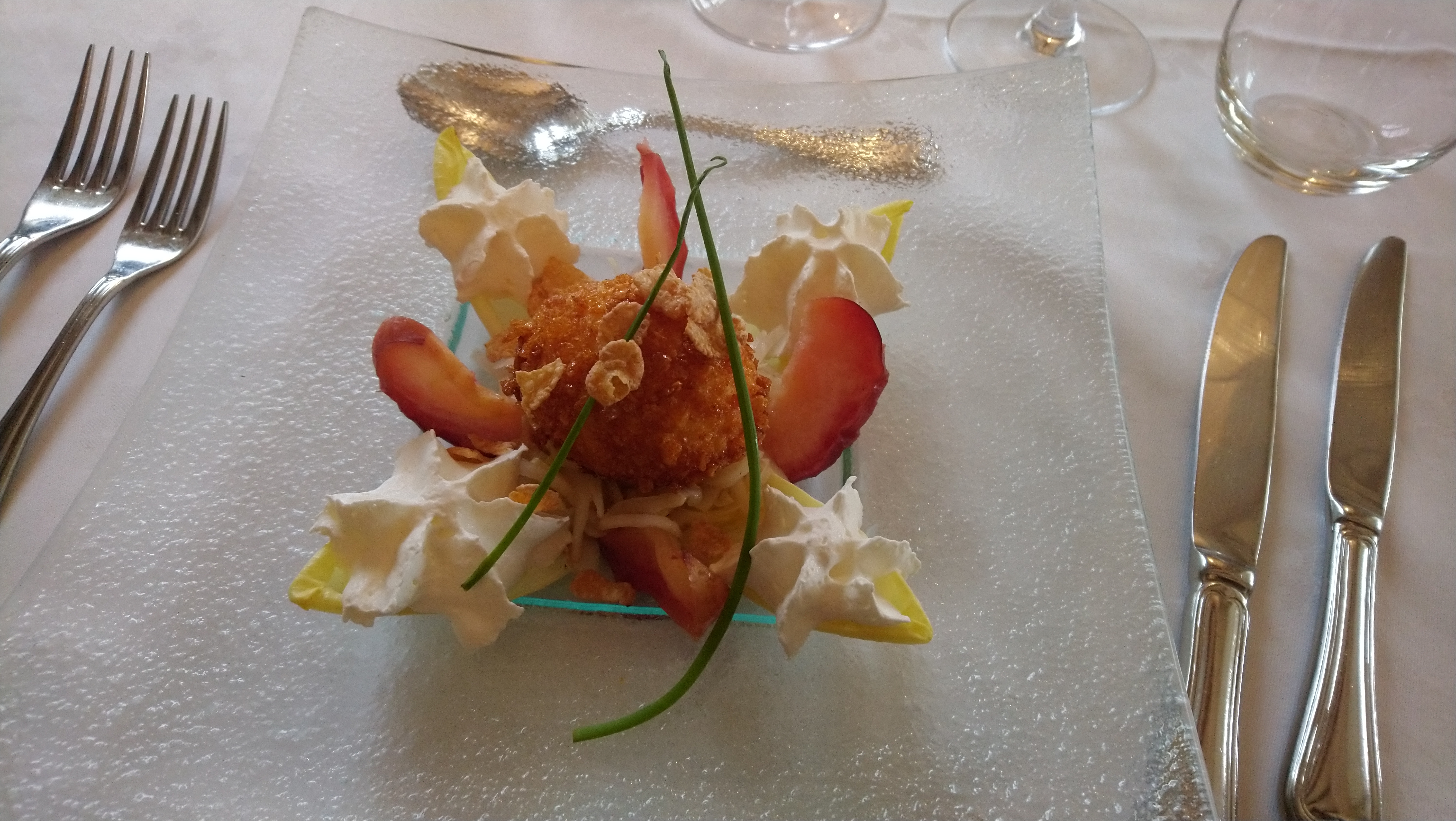 on ne nage pas dans l excellence mais plats bien dressés excellente présentation mais gout banal, non relevé un peu sans gout, meme le foie gras ma femme le fait mieux quant au plat revisité toujours sans gout mais sauce divine un desert classique note correcte mais donne pas envie de revenir ah! petit asterisque , choix une feuille avec 4 entrées au choix 4 plats au choix et 4 desserts au choix décevant.....