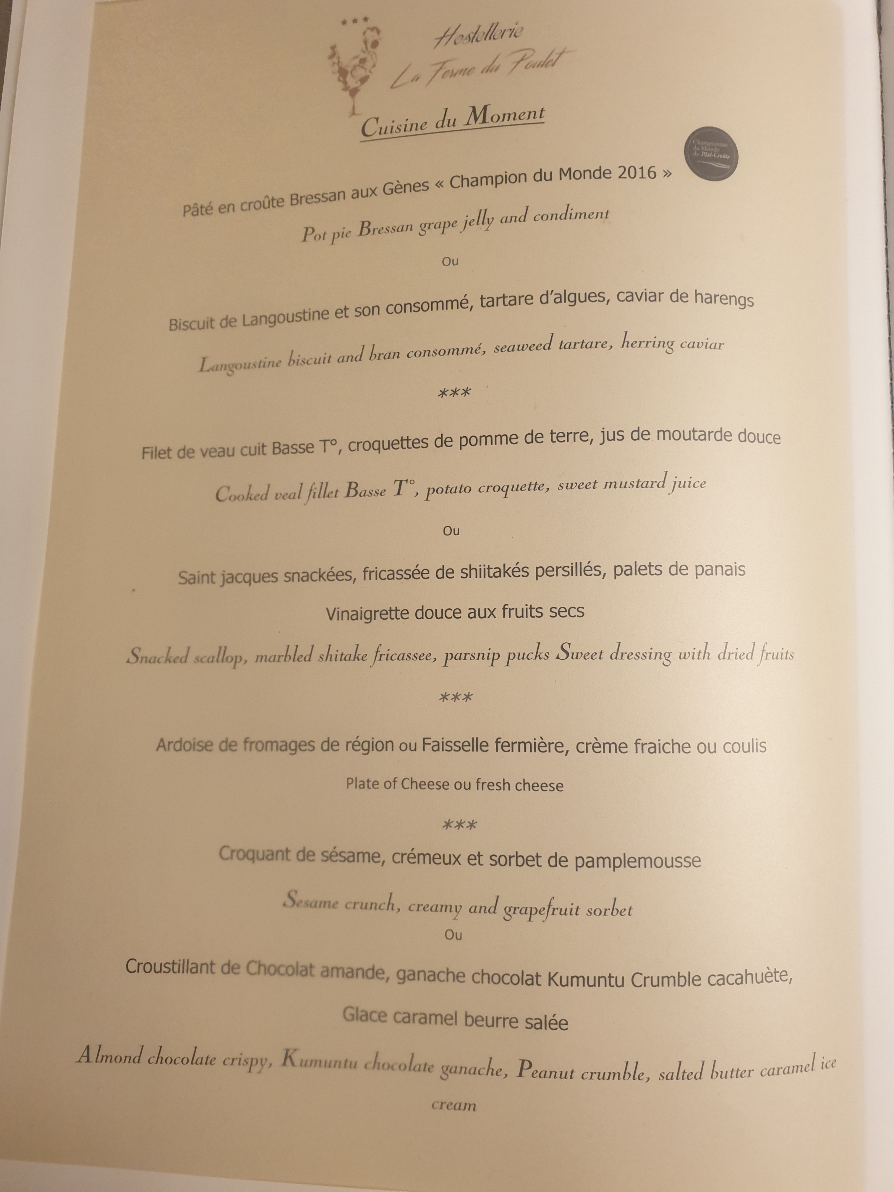 Entrée, plat et dessert à la hauteur de nos espérances. Le pâté en croûte mérite son titre de champion du monde ! Plat assez minimaliste mais tellement bien réalisé... Personnel agréable et service plutôt rapide.