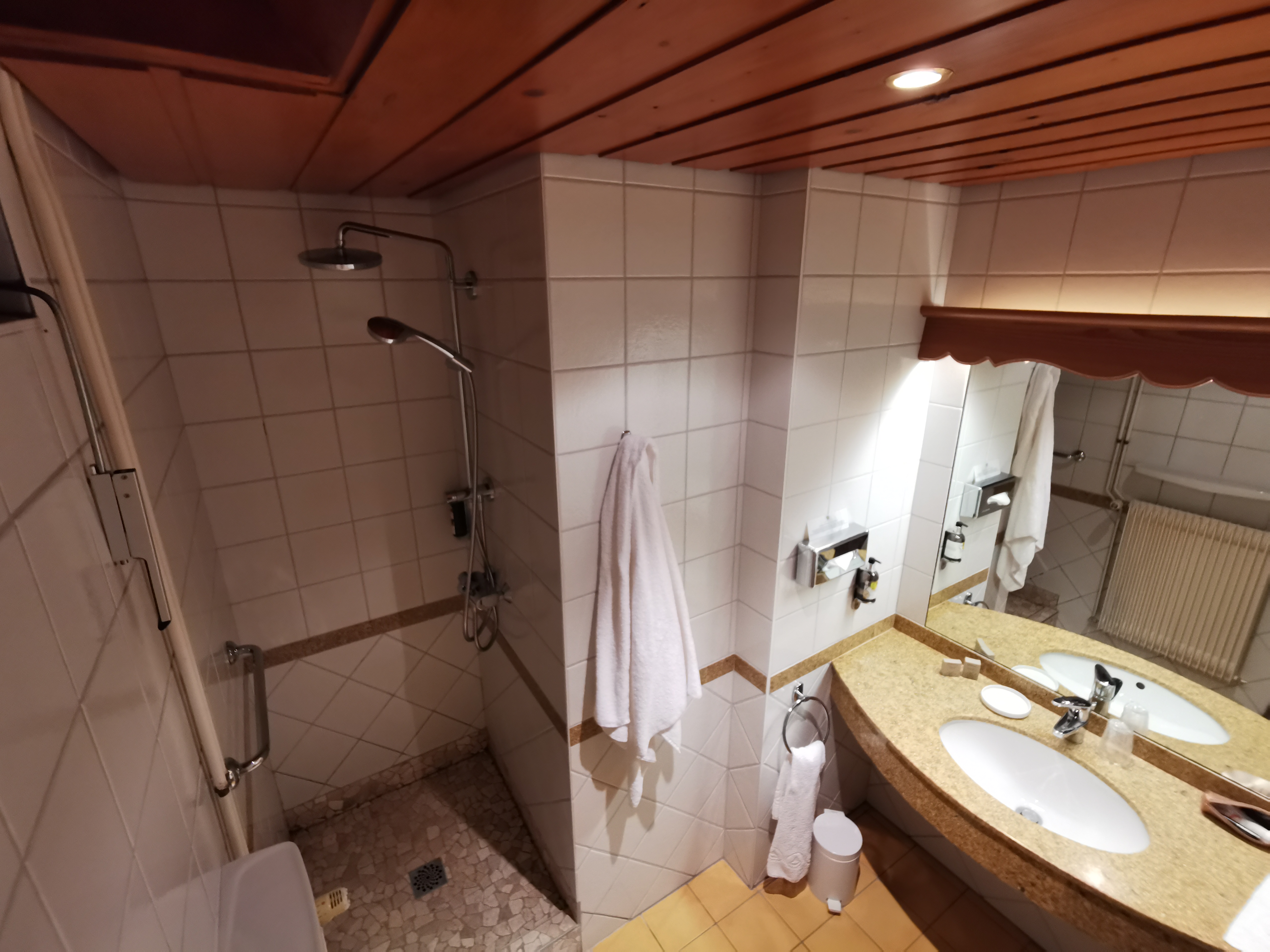 Chambre à la décoration alsacienne avec une petite salle de bain. Les prix des produits du mini bar sont relativement élevés. Cependant le personnel est agréable et souriant. Le petit déjeuner est complet et les produits servis sont de qualité.