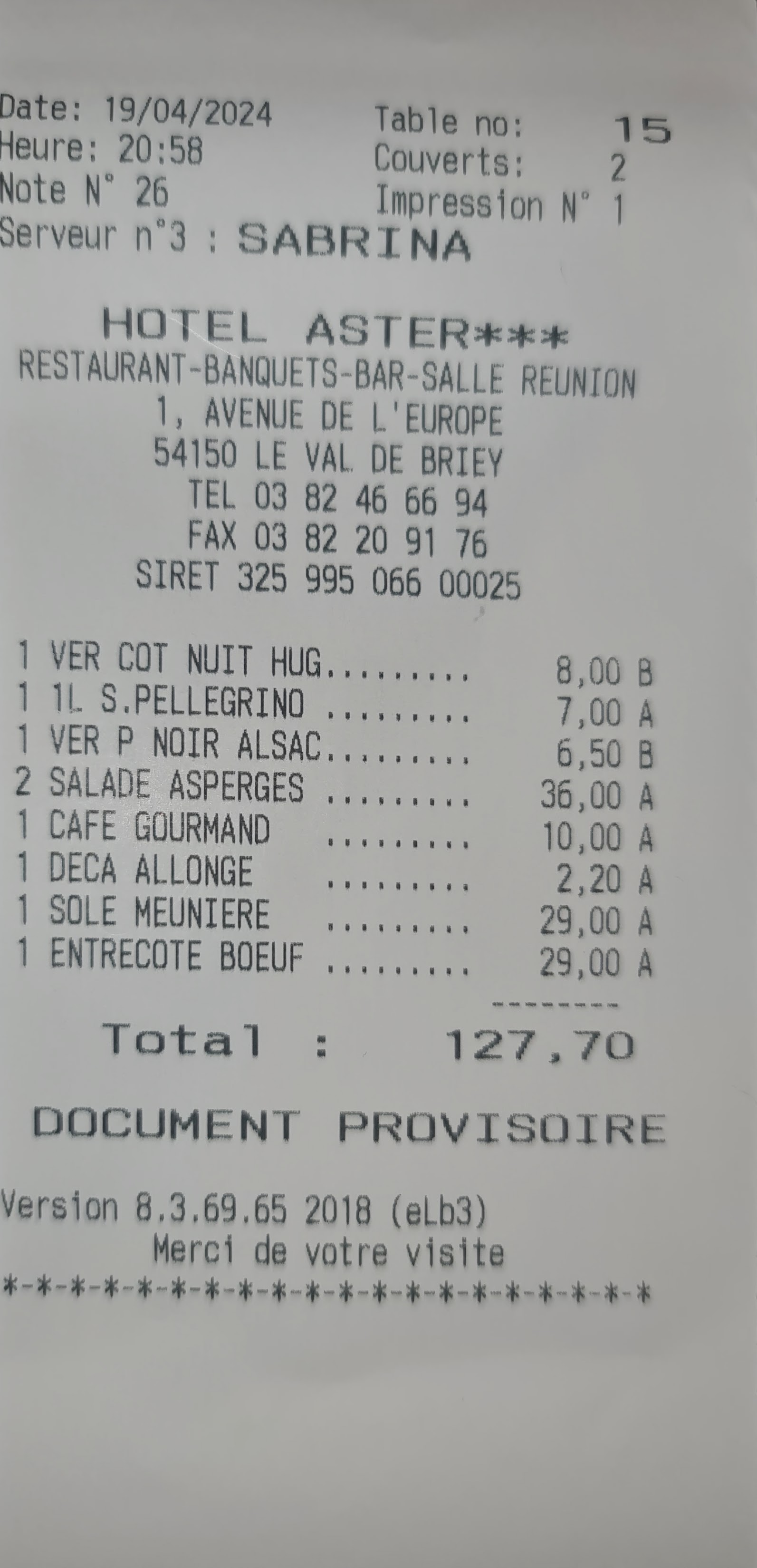 Impeccable ! C'est avec plaisir que je met 5 étoiles pour le restaurant de l'hôtel aster. Nous avons fait notre mariage en petit comité la bas, salle privatisée, repas excellent, amabilité du personnel, tout y été parfait ! Nous avons passé une très belle soirée et très bien mangé. Nous sommes ravis et nos invités aussi ! Je recommande fortement ! Merci pour tout !