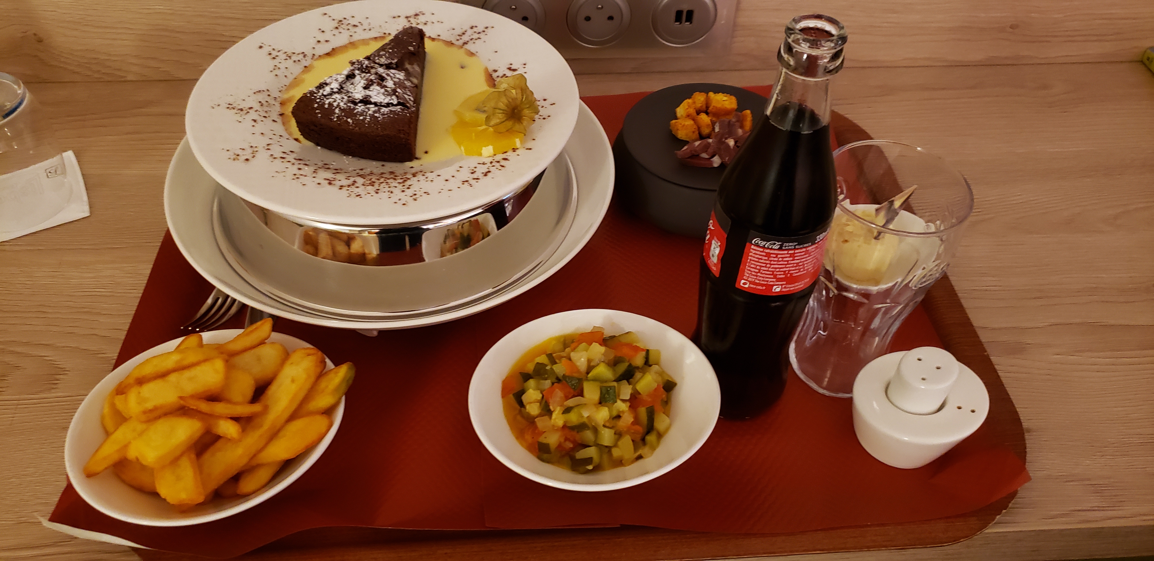 Salle de repas non climatisée. Apéritif trop commun (feuilletés surgelés) et servi dans un endroit trop exigu. Plat principal : viande trop sèche et présentation peu recherchée. Idem pour la présentation du dessert. Aucun réseau tel. (Orange) 4G inaccessible et wifi non disponible.