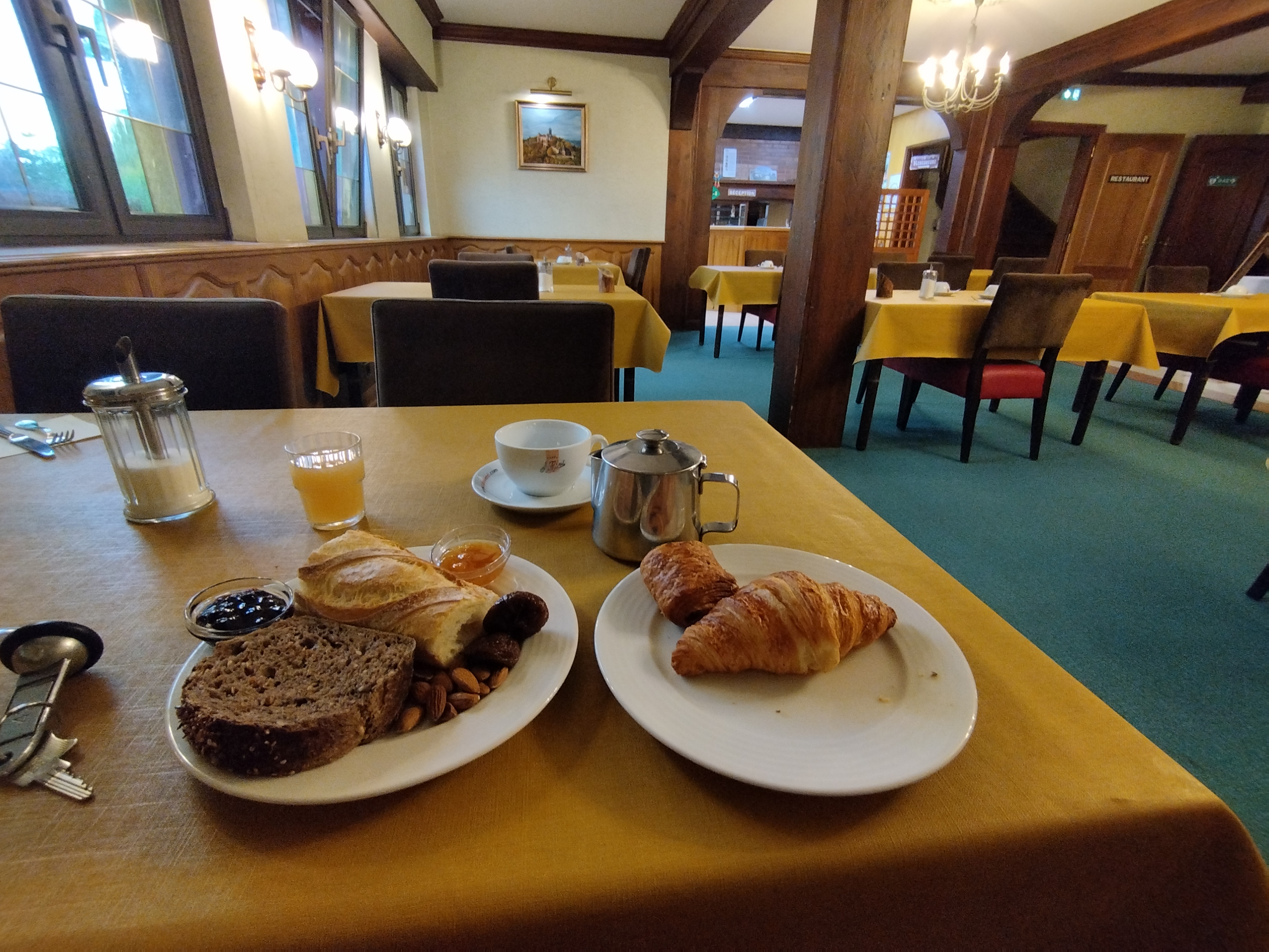 Hôtel cordial très propre Pdj buffet excellent Confitures,miel,chocolat,croissants,3 sortes de pains,œuf coque à faire soi même, café, chocolat,thé.....charcuterie,céréales, fruits sec,fromage blanc,yaourt... Personnel serviable et très aimable. De plus pas onéreux et proche du château Haut Koenigsburg. Merci pour pour ce bon séjour.