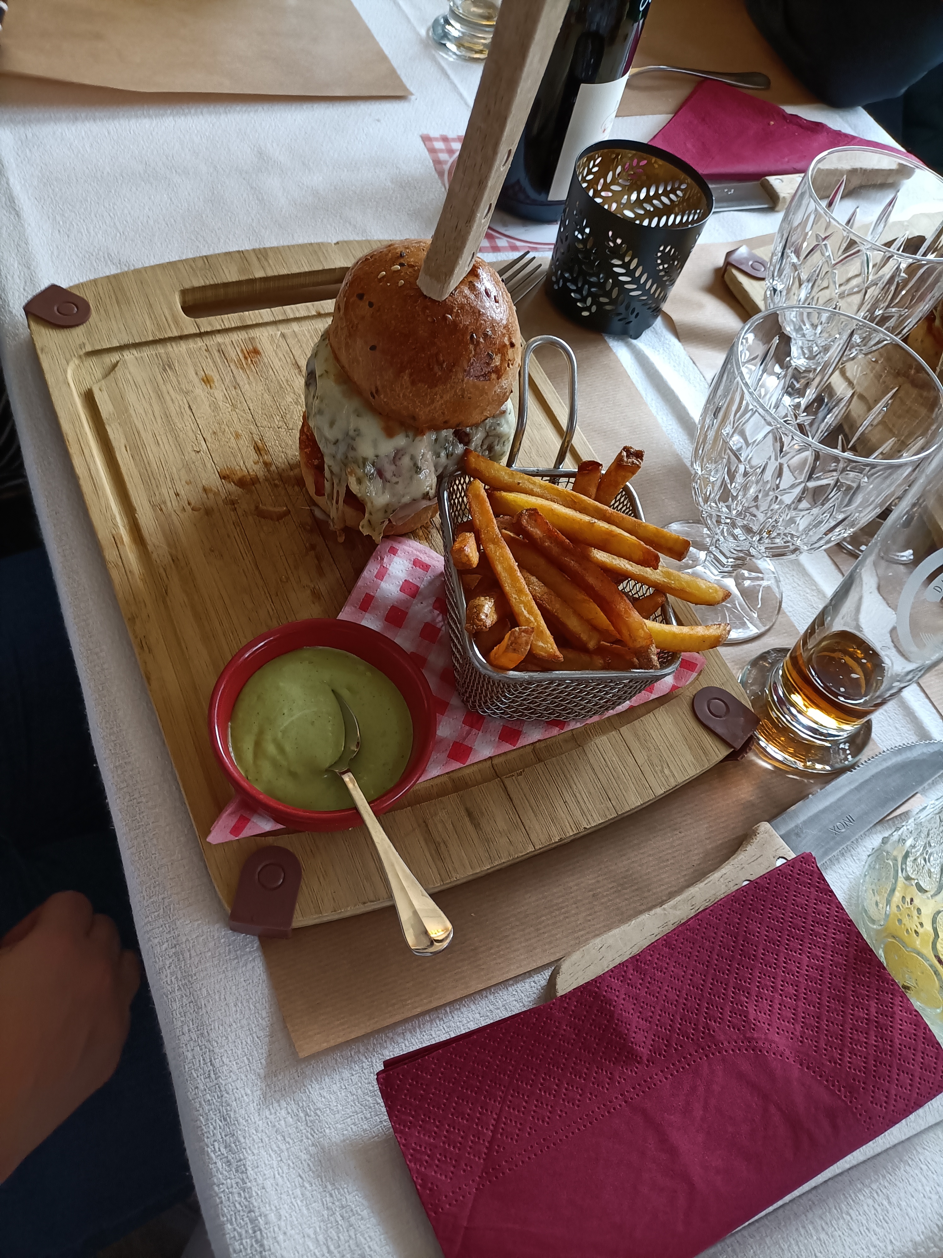Repas correct mais pas de quoi casser 3 pattes a un canard. L entrée était bonne mais le plat (un butter) était sans plus et servi sur planche ce qui est tout sauf hygiénique. Les frites maison manquaient d assaisonnement Peut mieux faire