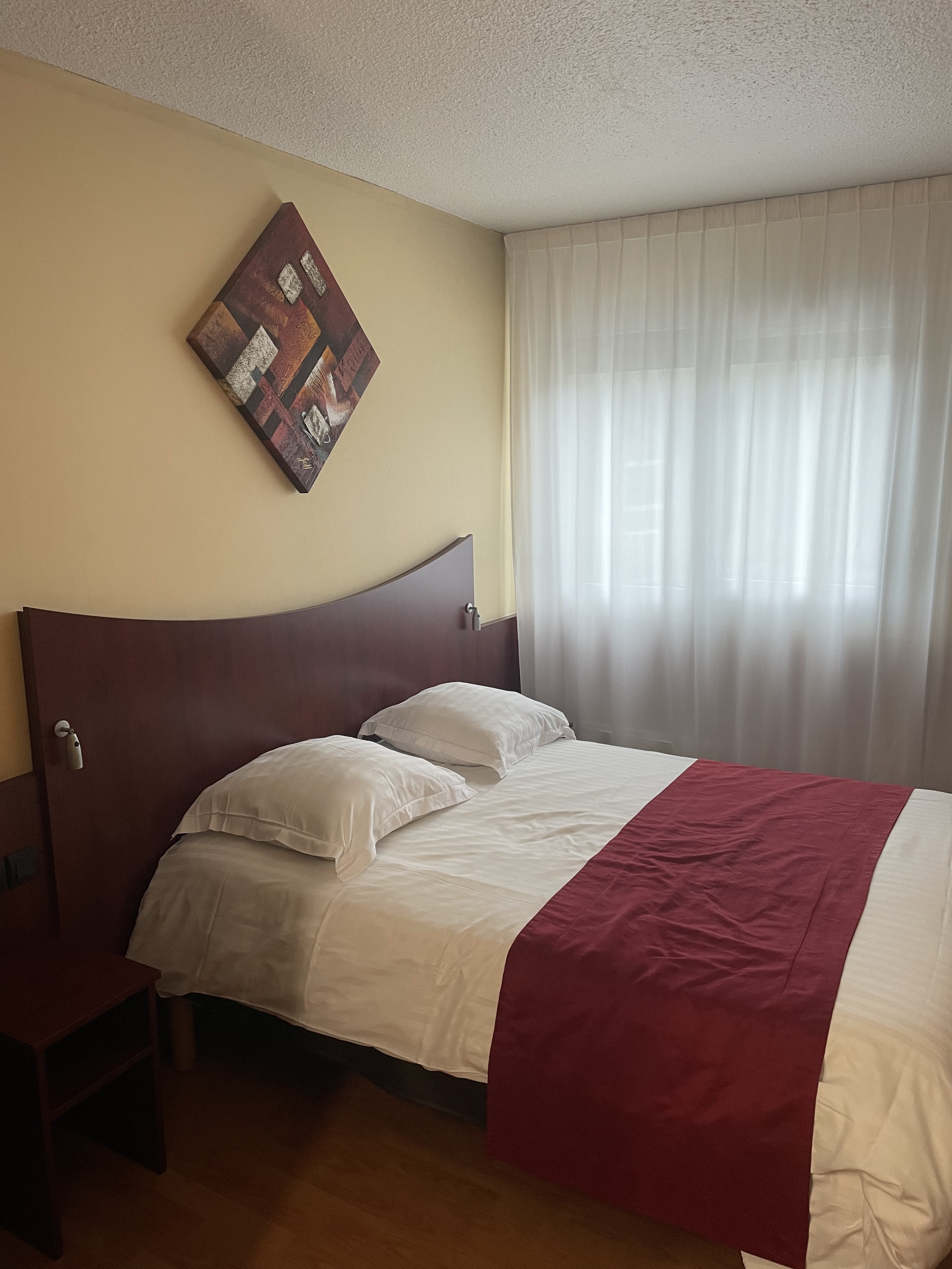 Personnel très accueillant.e, accès facile et très agréable. Hôtel bien équipé et accessible aux personnes handicapé.e.s, parties communes propres. Chambre double grend confort suite à un sur classement, lit king size et taille de la chambre parfaite, mérite amplement les 3 étoile attribué, voir même plus ! Et tout cela avec un prix vraiment très correct