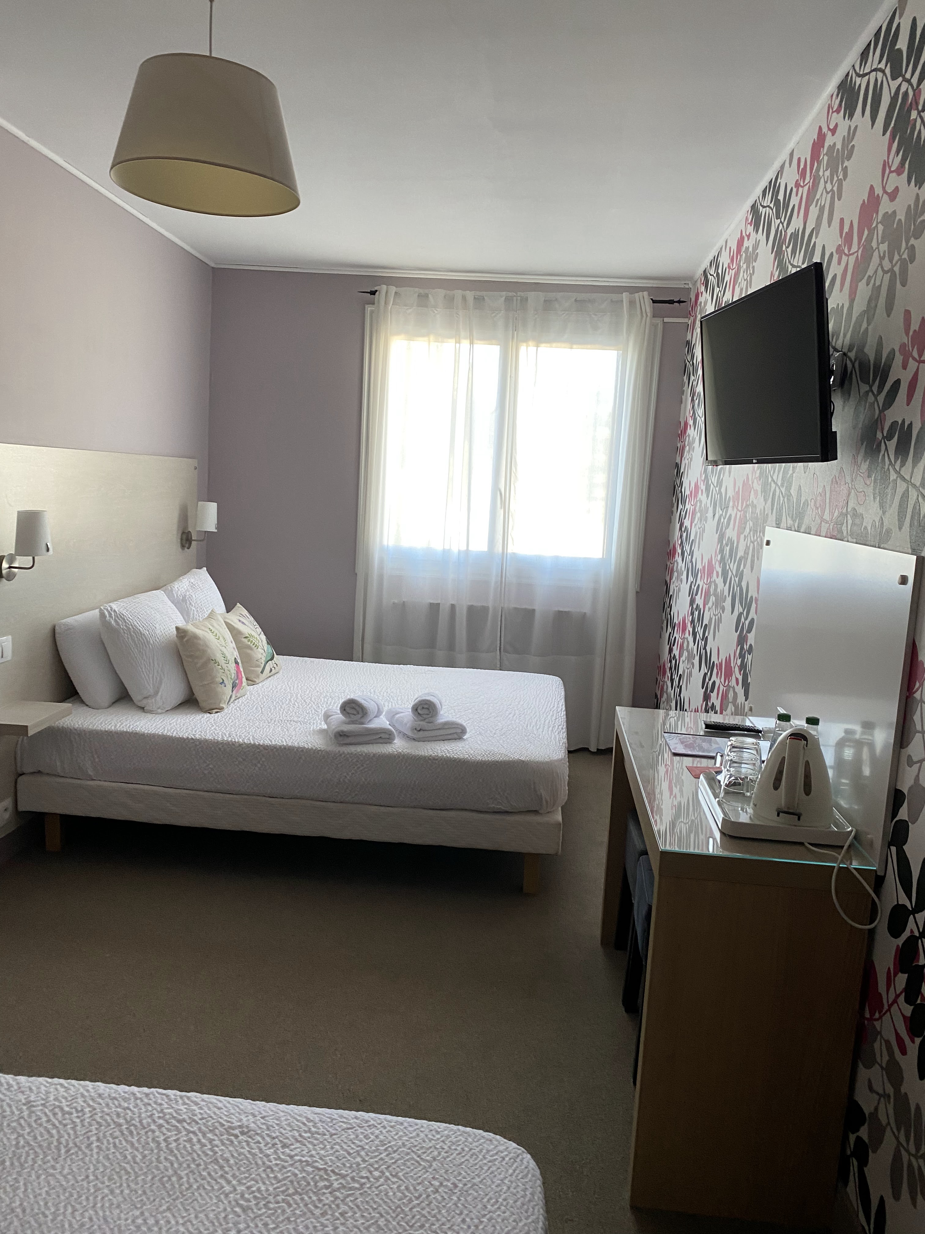 POUR UNE NUIT PAS PLUS ! Hôtel correct pour y passer 1 nuit. Malheureusement nous avions réservé pour 4 nuits. ATTENTION ! Il faut savoir que sous prétexte de la COVID19 la chambre n'est pas faite durant tout le séjour, ce qui n'est pas mentionné sur le site web de l'hôtel qui précise au contraire hygiène renforcée - service en chambre quotidien ! Or la douche, le lavabo, les wc, le lit, la chambre en général RIEN n'a été nettoyé ; les serviettes de toilette (rêches et trouées pour certaines) ne sont changées que sur demande. Nous avons fait part de nos remarques au propriétaire et dit notre incompréhension. Sa réponse a été COVID 19 on n'entre pas dans les chambres. Dans ce cas il faut être clair et signaler au client à la réservation qu'il n'y a pas de ménage quotidien. Il est urgent de corriger les informations sur le site web de l'hôtel elles sont fausses. On nous a annoncé un service primordial non réalisé que nous avons payé. Nous ne retournerons pas dans cet hôtel et nous ne le recommandons pas du tout.
