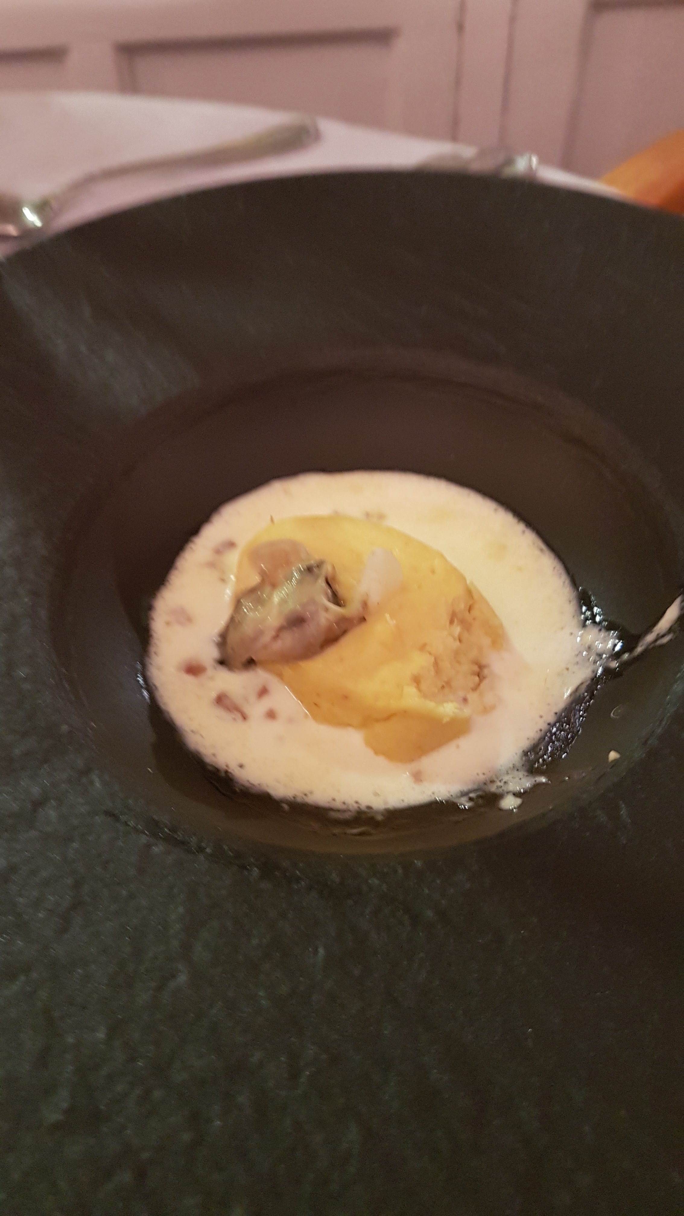 Accueil très chaleureux du Chef et de son épouse. Lieu romantique avec petite musique douce. Soyez patient, résistez au petit pain,excellent au demeurant. Chaque plat étant précédé d'un en-cas. Tous les plats sont des surprises gustatives.(formule chambre+ repas et petit-déjeuner très, très copieux tout compris) La chambre spacieuse, romantique, bonne literie. Intentions agréables: pommes , fruits secs, thé et café. Peignoirs de bain, pommeau de douche moderne, bémol dans une baignoire.